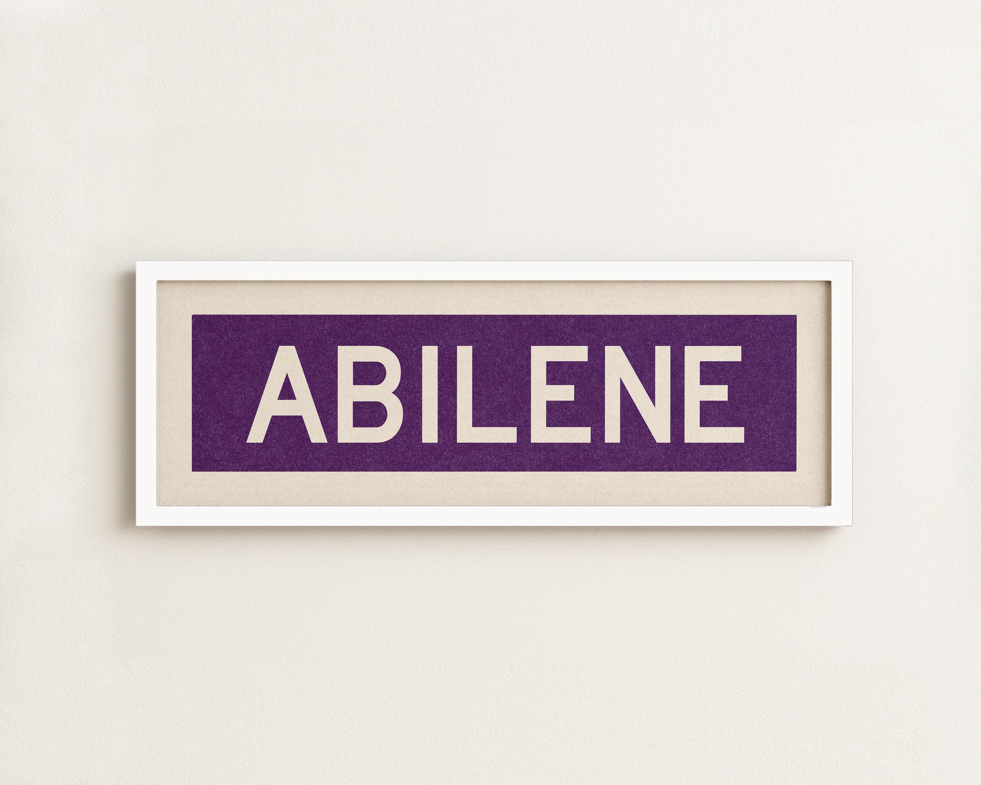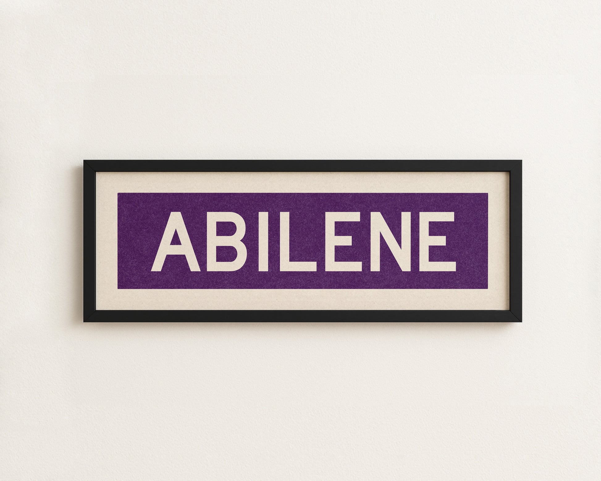 Framed purple "ABILENE" vintage bus/train scroll sign art. Show off your love for Abilene with this classic and simple framed scroll sign. Perfect for above the door, in an office, game room or accent in a living area.