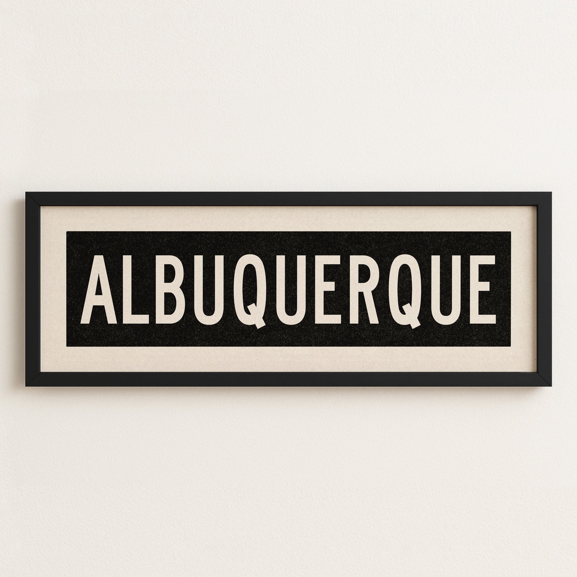 Framed black and white "ALBUQUERQUE" vintage bus/train scroll sign art. Show off your love for Albuquerque, New Mexico with this classic and simple framed scroll sign. This ode to the Duke City piece is the gift you've been searching for for the Albuquerque native or newcomer. Perfect for above the door, in an office, game room or accent in a living area.
