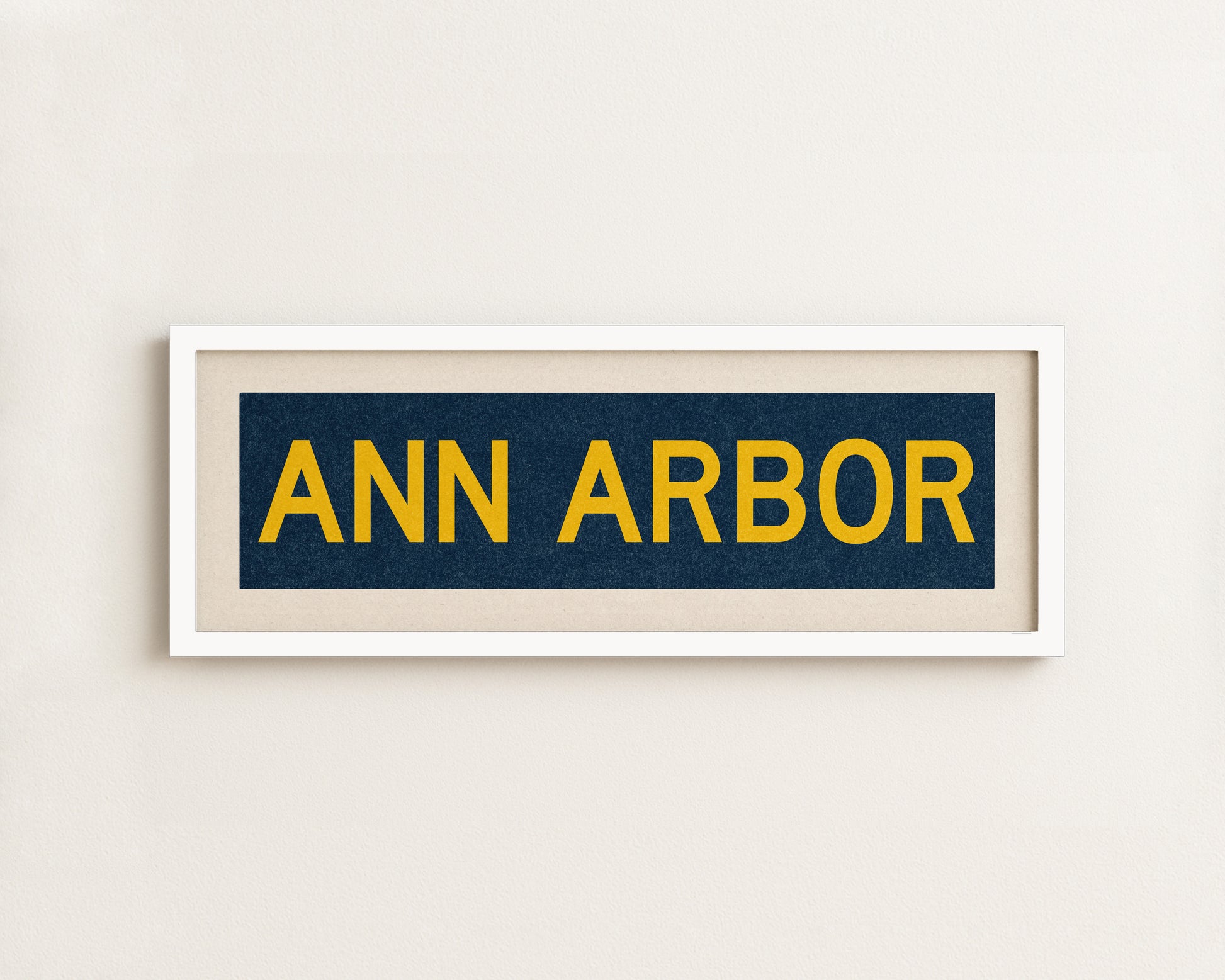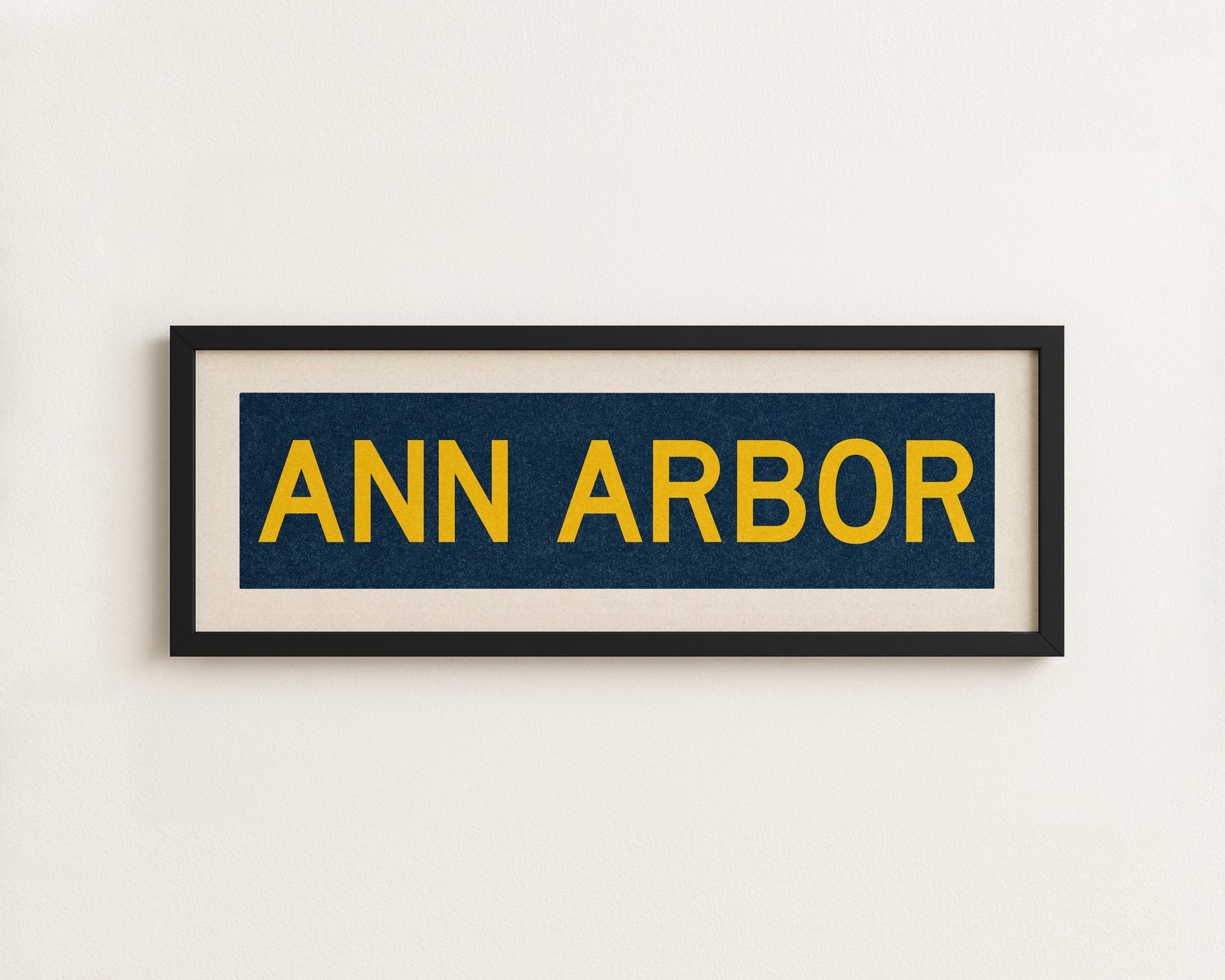 Framed navy "ANN ARBOR" vintage bus/train scroll sign art. Show off your love for Ann Arbor with this classic and simple framed scroll sign. Perfect for above the door, in an office, game room or accent in a living area.