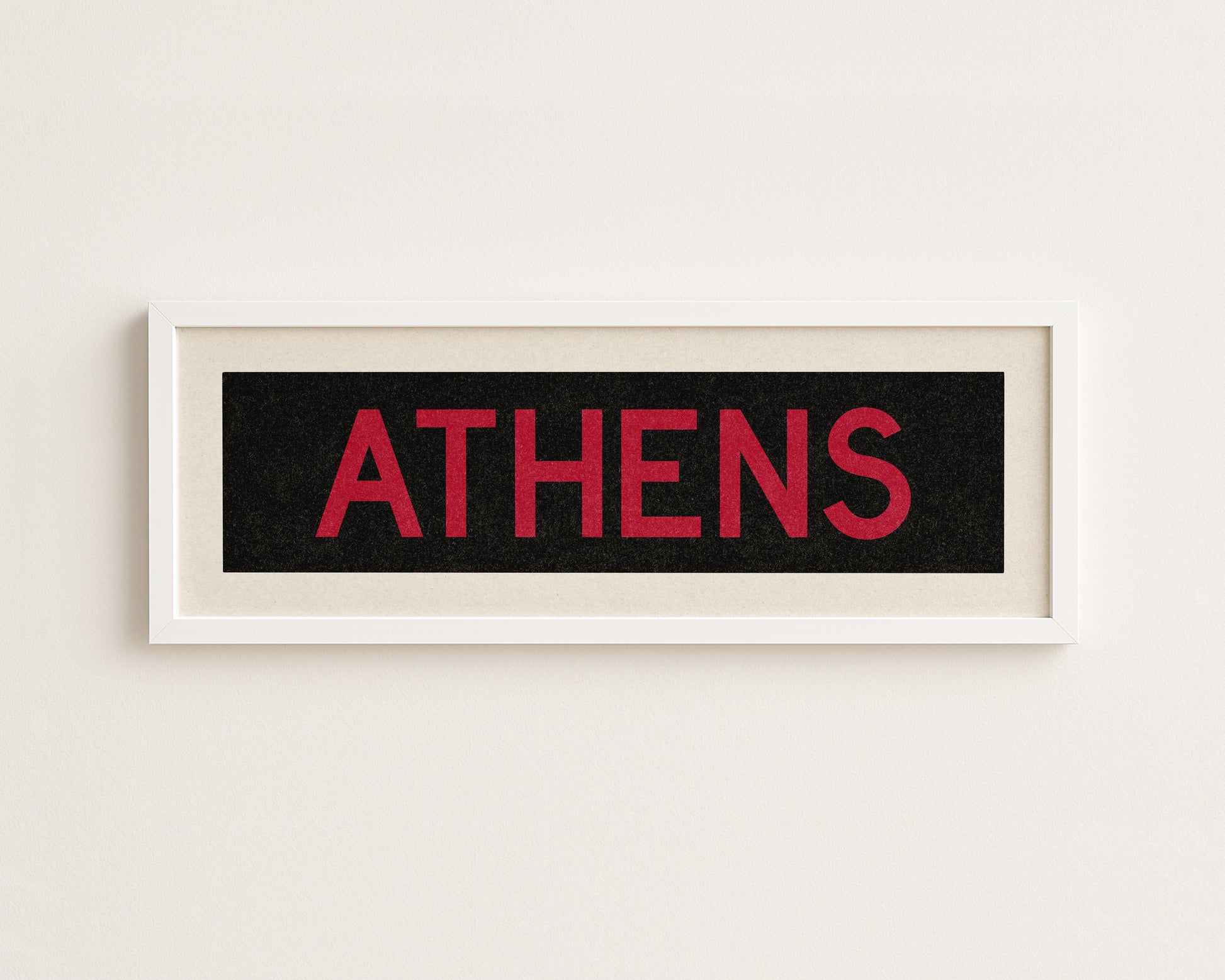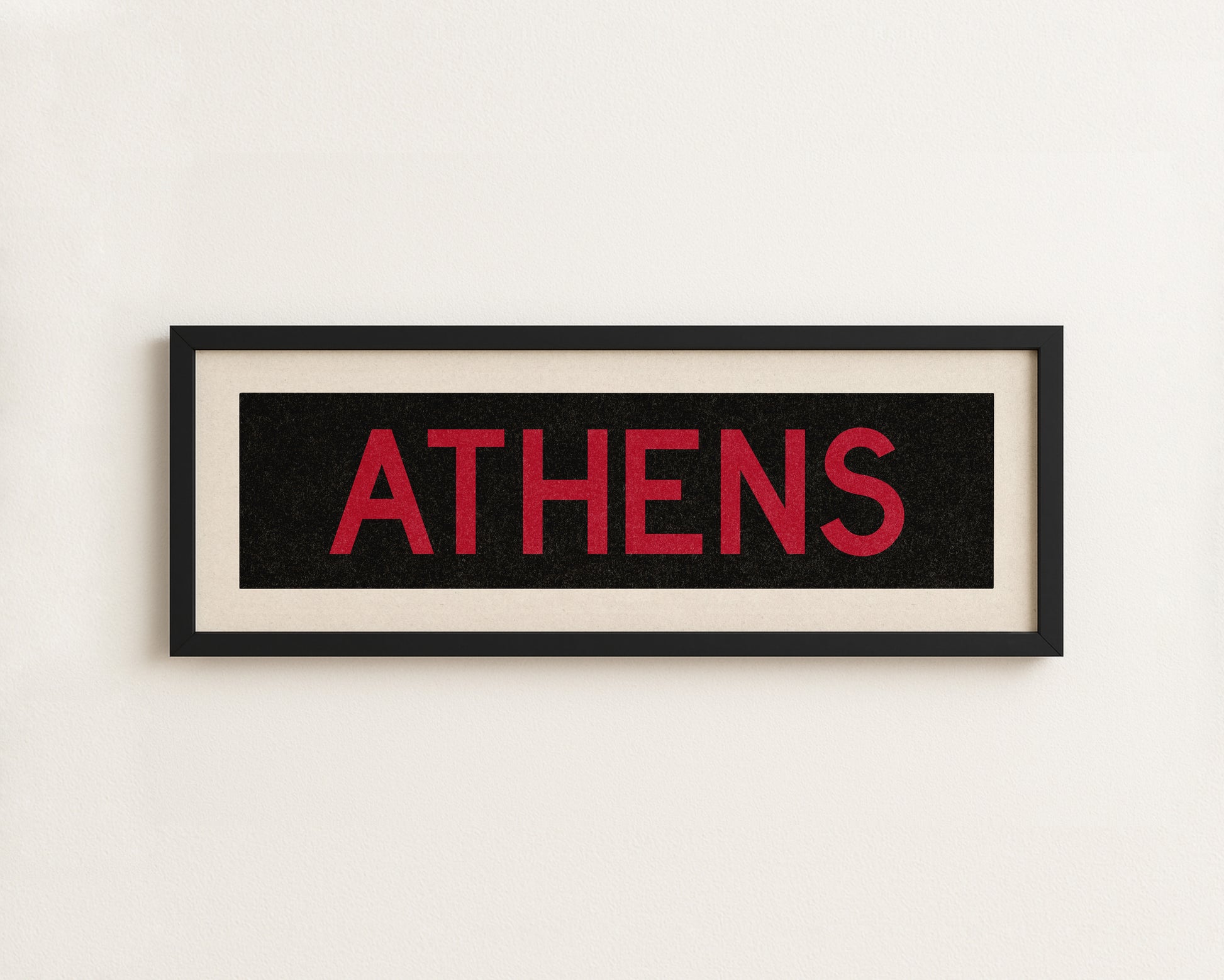 Framed red and black "ATHENS" vintage bus/train scroll sign art. Show off your love for Athens with this classic and simple framed scroll sign. Perfect for above the door, in an office, game room or accent in a living area.