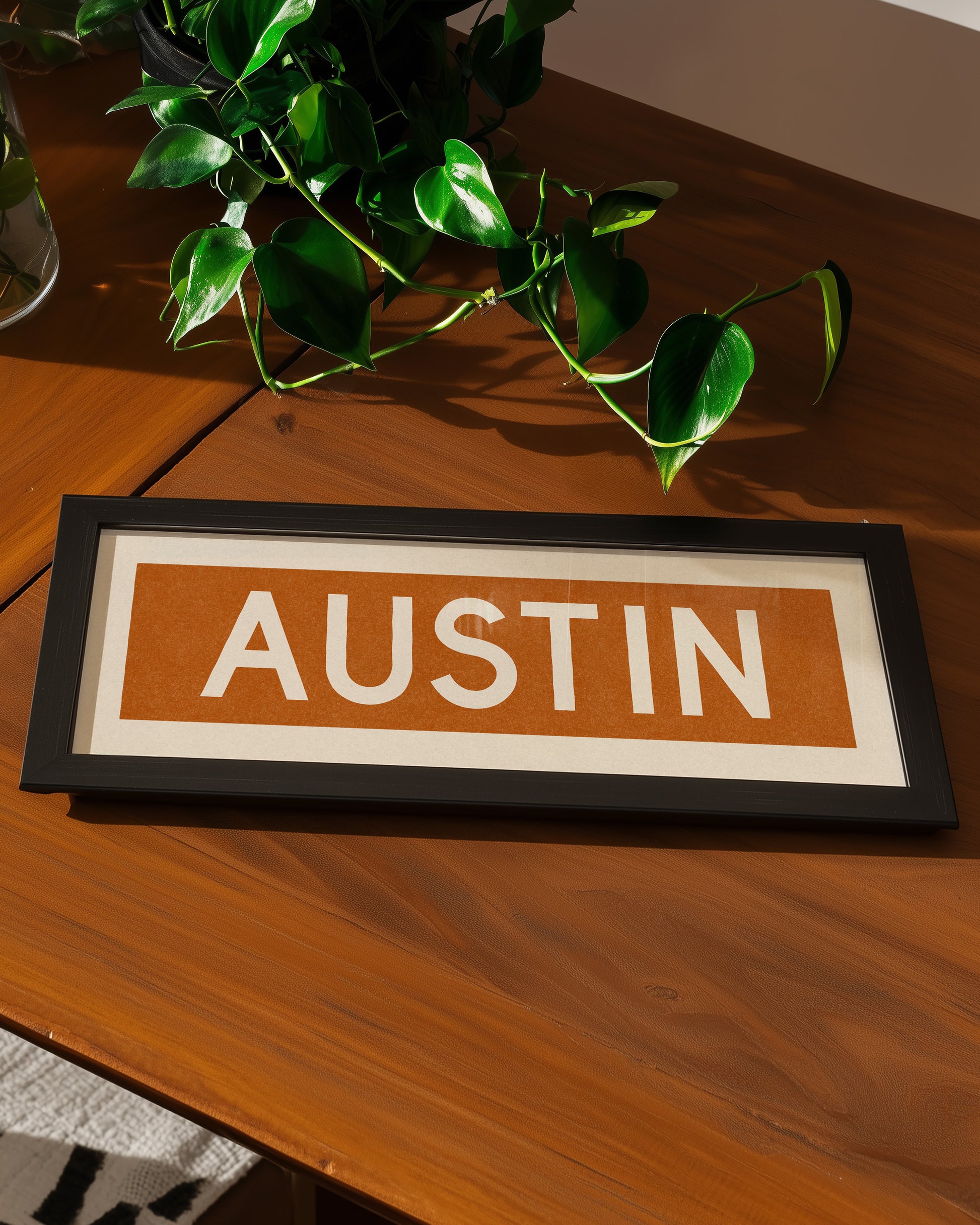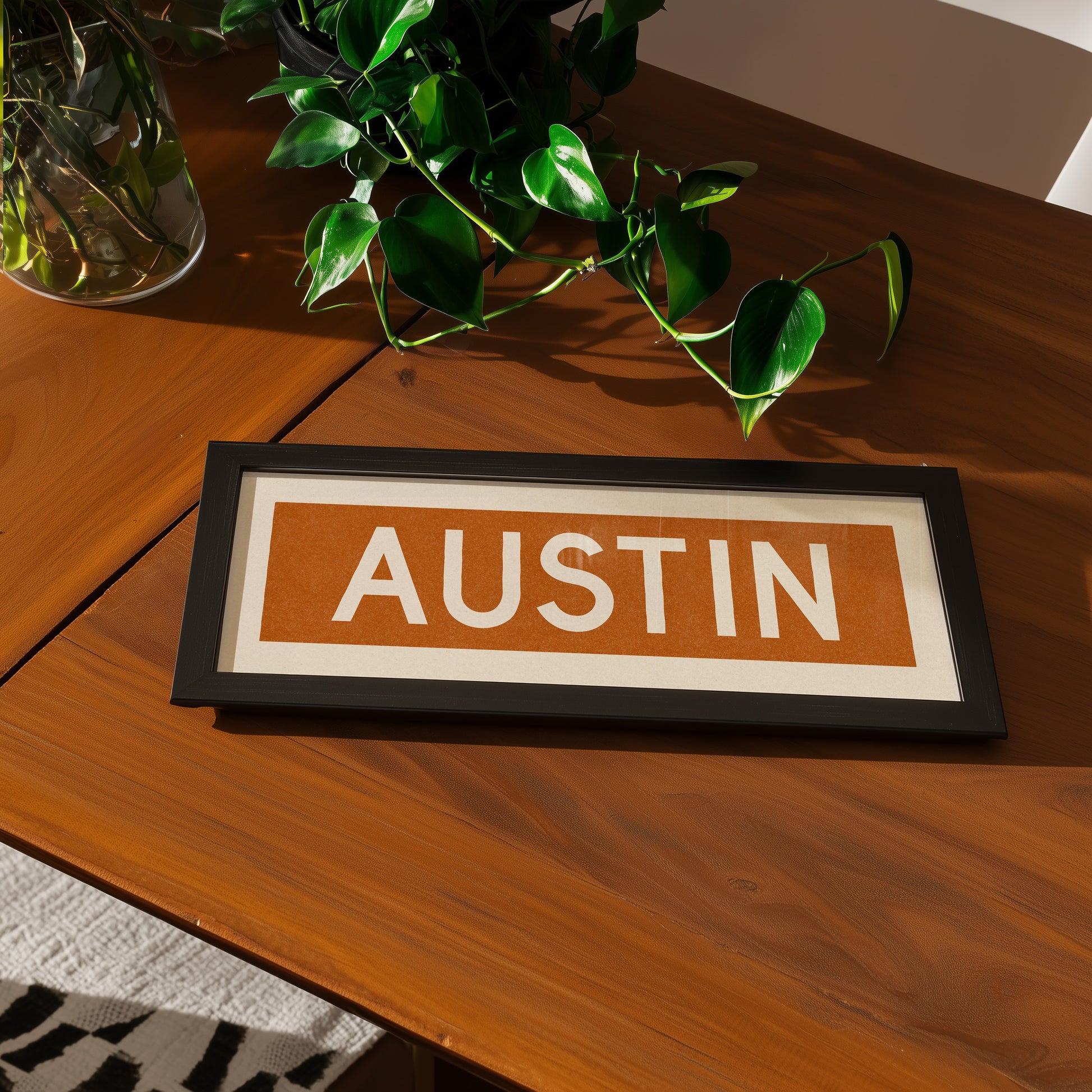 Framed orange and white "AUSTIN" vintage bus/train scroll sign art. Show off your love for Austin, Texas with this classic and simple framed scroll sign. Perfect for above the door, in an office, game room or accent in a living area.
