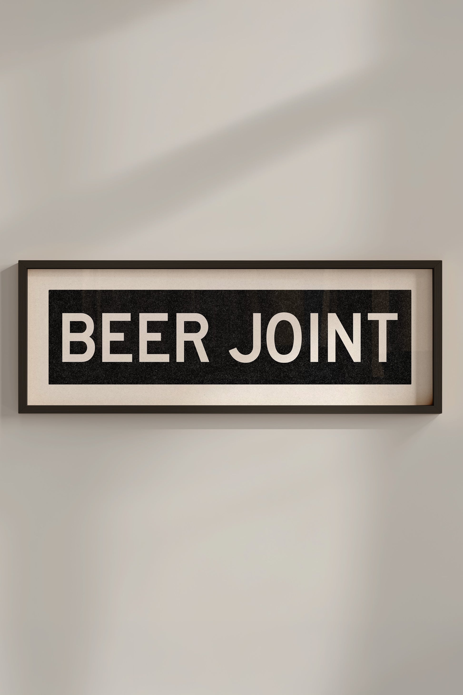Framed "BEER JOINT" vintage bus/train scroll sign art. Show off your love for those smoky little dives with this classic and simple framed scroll sign. Perfect for above the door, in an office, above the bar, game room or accent in the kitchen.