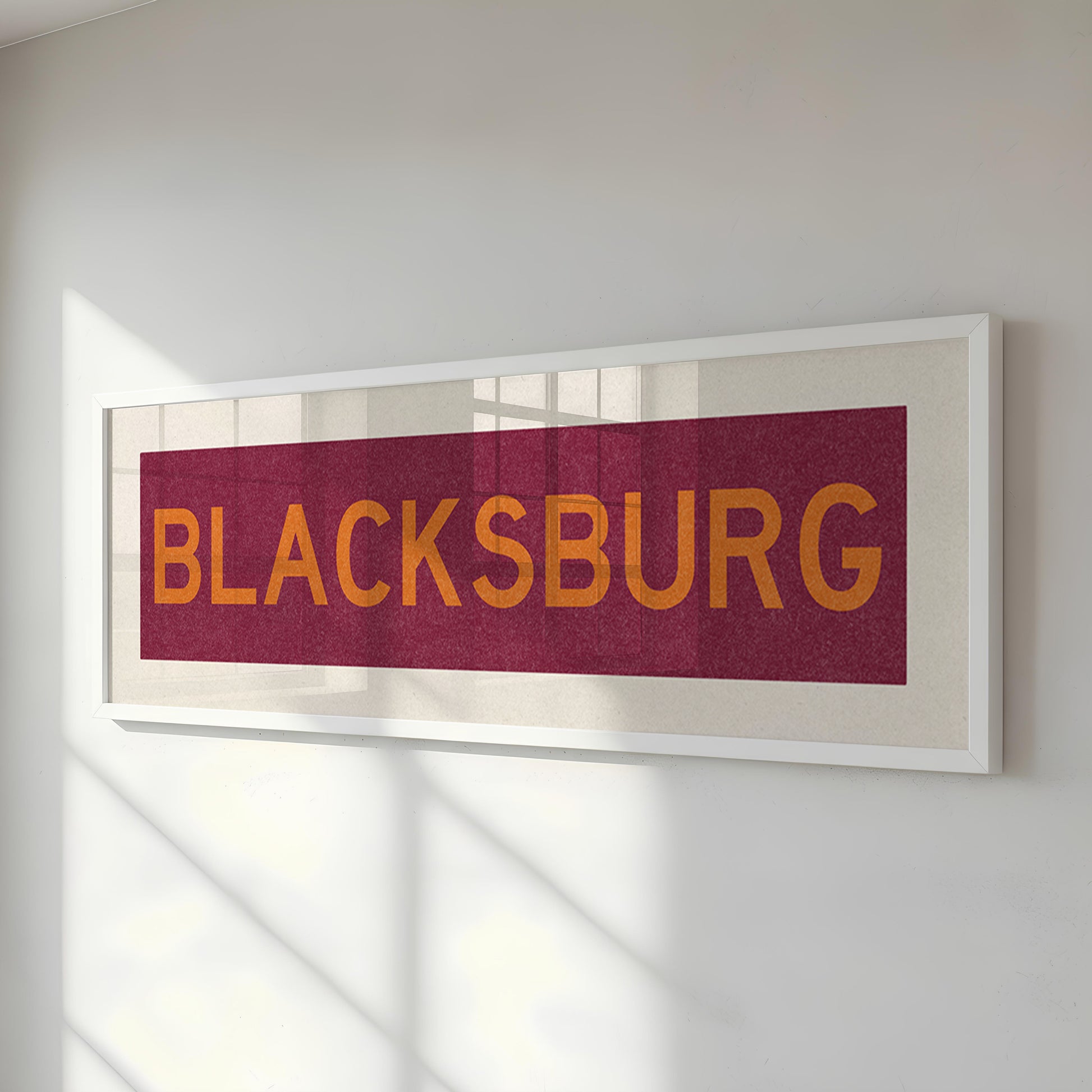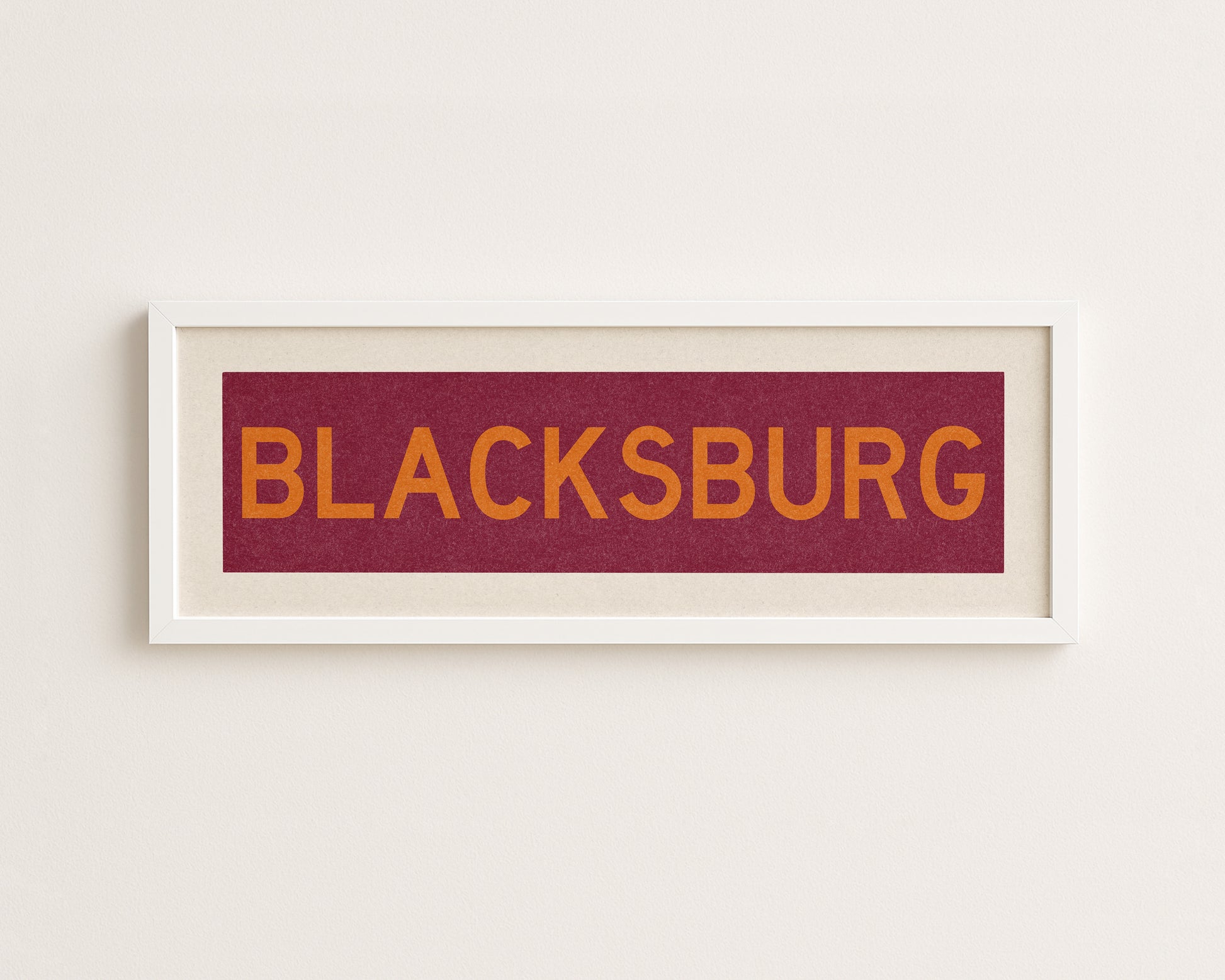 Framed maroon and orange "BLACKSBURG" vintage bus/train scroll sign art. Show off your love for Blacksburg with this classic and simple framed scroll sign. Perfect for above the door, in an office, game room or accent in a living area.