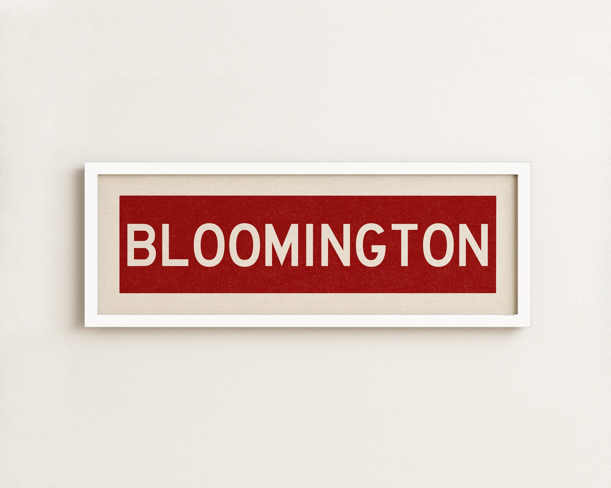Framed crimson "BLOOMINGTON" vintage bus/train scroll sign art. Show off your love for Bloomington, Indiana with this classic and simple framed scroll sign. Perfect for above the door, in an office, game room or accent in a living area.