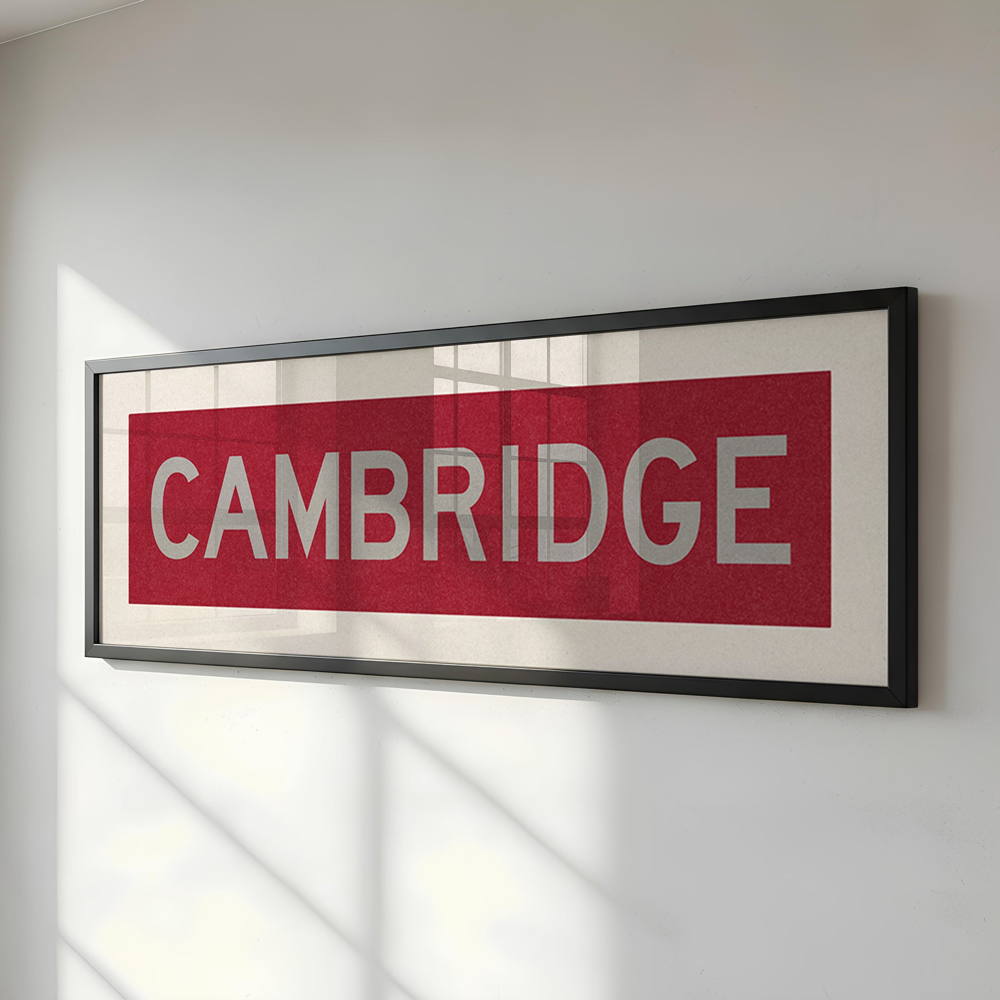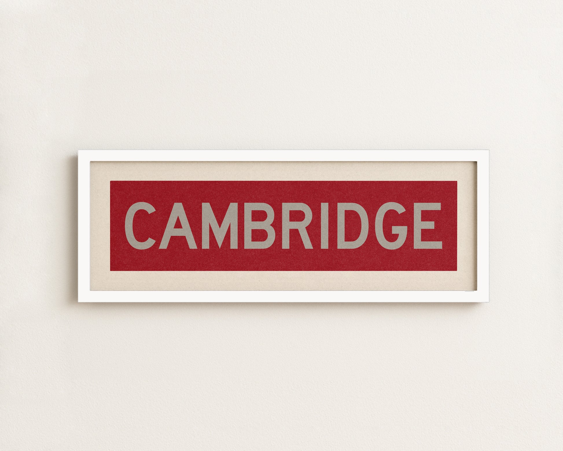 Framed crimson and gray "CAMBRIDGE" vintage bus/train scroll sign art. Show off your love for Cambridge, Massachusetts with this classic and simple framed scroll sign. Perfect for above the door, in an office, game room or accent in a living area.