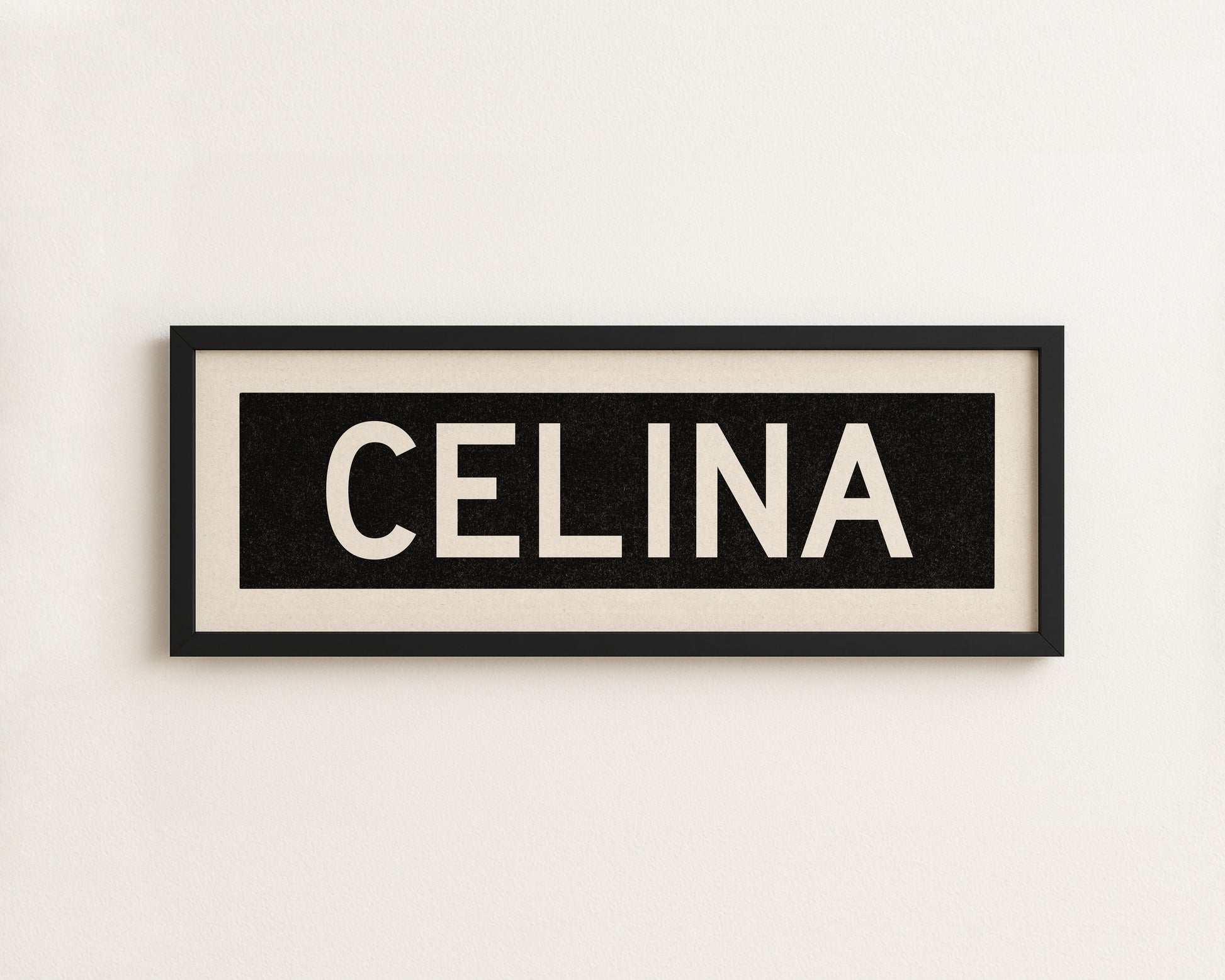 Framed "CELINA" vintage bus/train scroll sign art. Show off your love for Celina with this classic and simple framed scroll sign. Perfect for above the door, in an office, game room or accent in a living area.