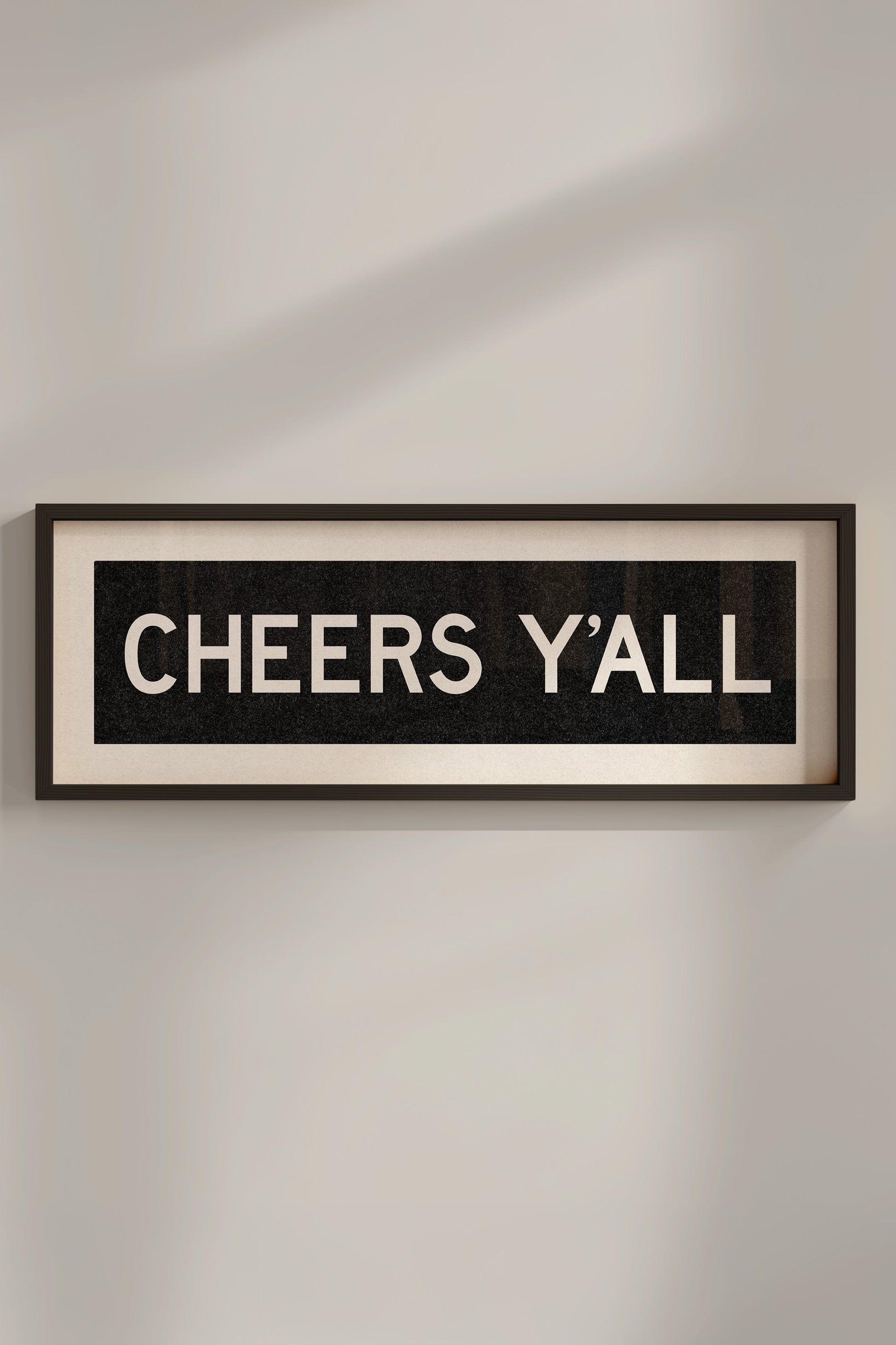 Framed CHEERS Y'ALL" vintage bus/train scroll sign art. Show off your love for saying cheers with your crew with this classic and simple framed scroll sign. Perfect for above the door, in an office, above the bar, game room or accent in the kitchen.