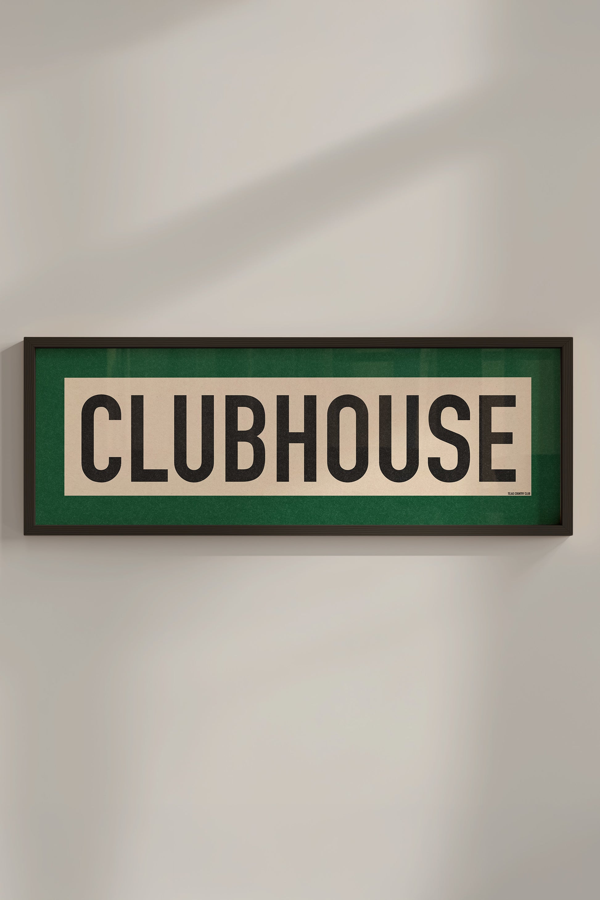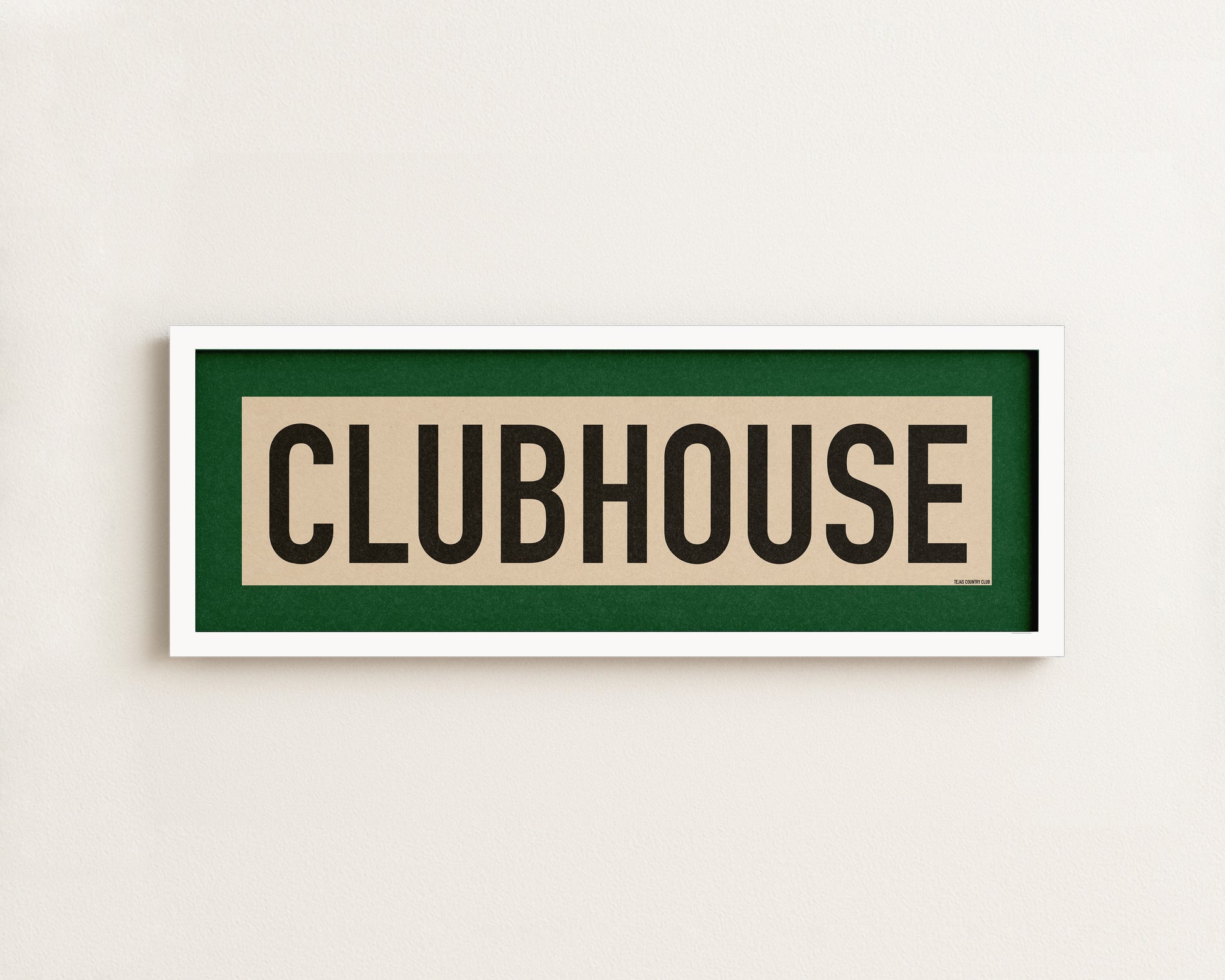 Framed green and off white "CLUBHOUSE" vintage scroll sign art. Show off your love for the post hang in the clubhouse after a round of 18 holes with this classic and simple framed scroll sign. Perfect for above the door, in an office, game room or accent in a living area.