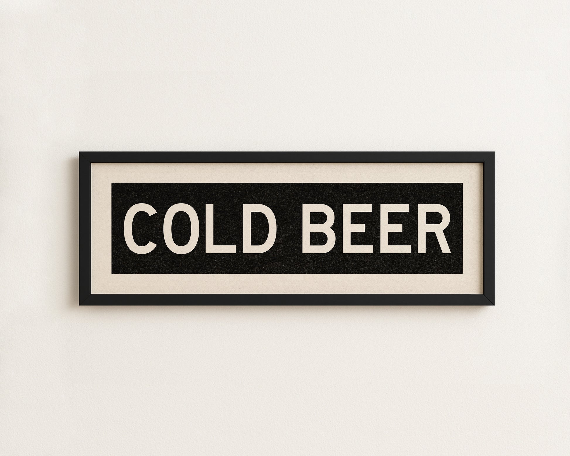 Framed "COLD BEER" vintage bus/train scroll sign art. Show off your love for cracking open a cold one with your crew with this classic and simple framed scroll sign. Perfect for above the door, in an office, above the bar, game room or accent in the kitchen.