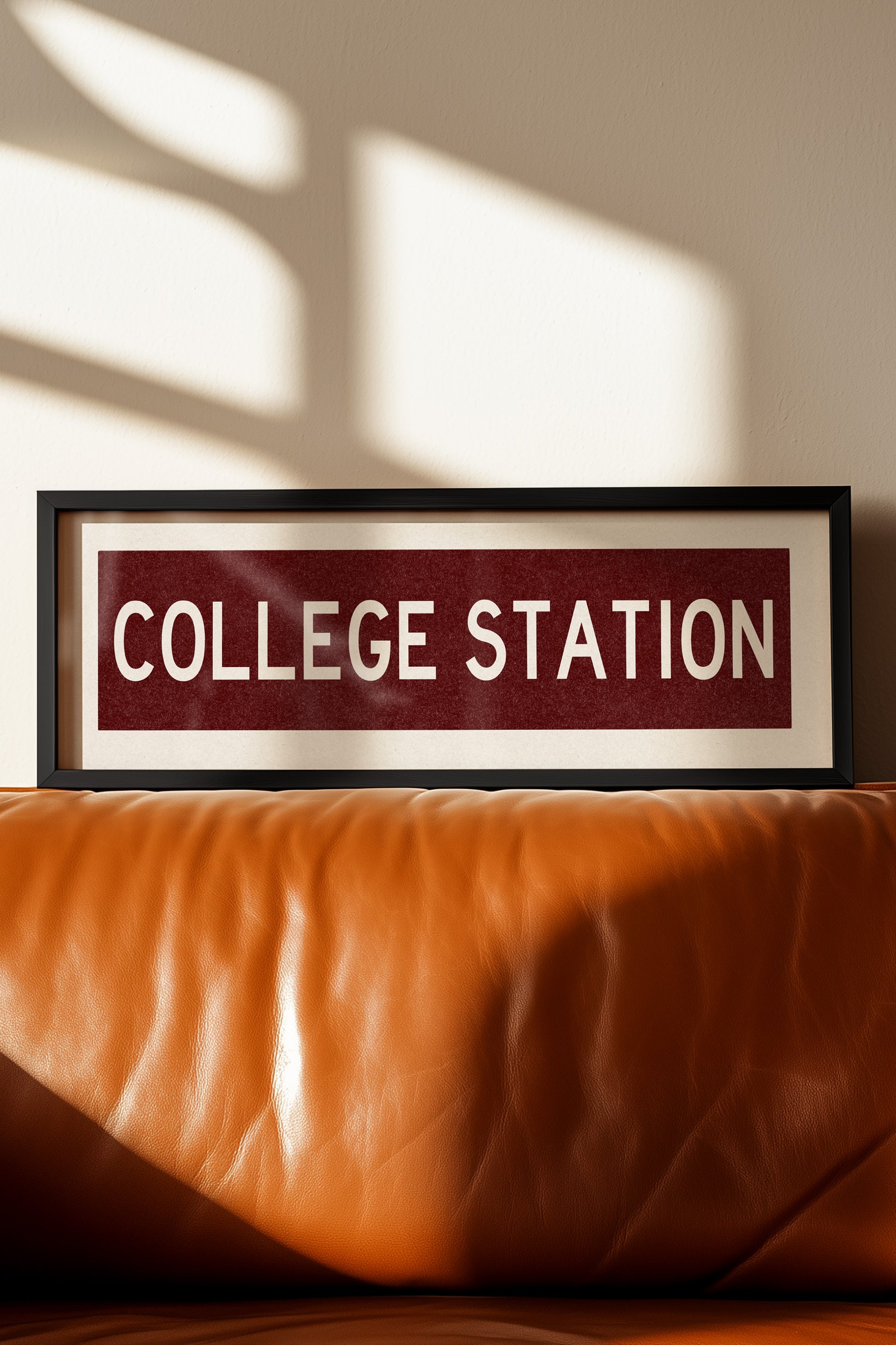 Framed maroon "COLLEGE STATION" vintage bus/train scroll sign art. Show off your love for College Station, Texas with this classic and simple framed scroll sign. Perfect for above the door, in an office, game room or accent in a living area.