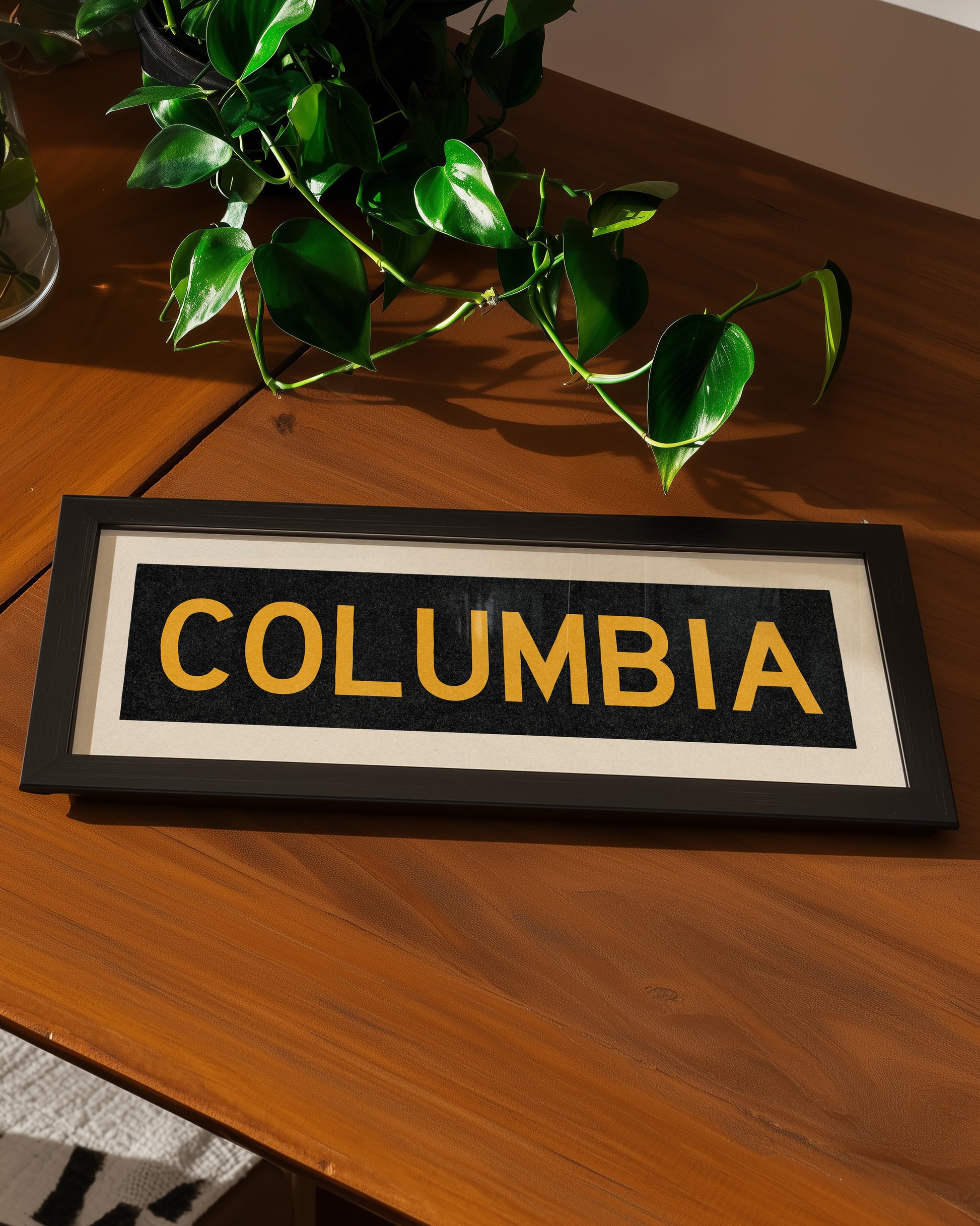 Framed gold and black "COLUMBIA" vintage bus/train scroll sign art. Show off your love for Columbia, Missouri with this classic and simple framed scroll sign. Perfect for above the door, in an office, game room or accent in a living area.