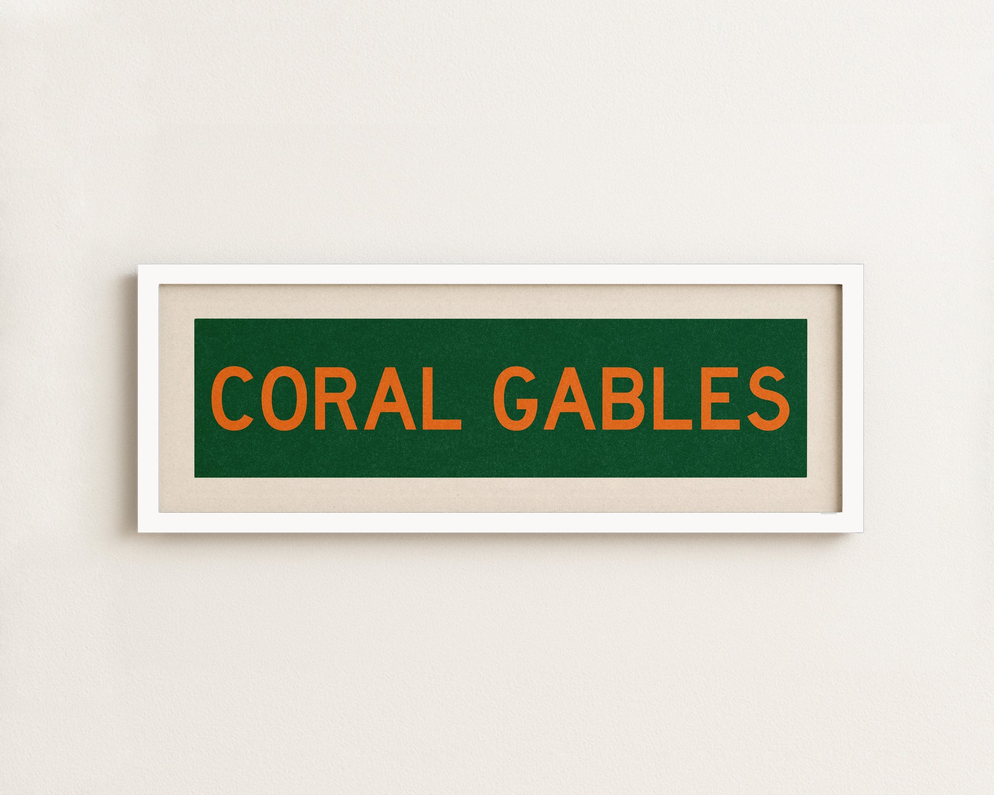 Framed green and orange "CORAL GABLES" vintage bus/train scroll sign art. Show off your love for Coral Gables, Florida with this classic and simple framed scroll sign. Perfect for above the door, in an office, game room or accent in a living area.