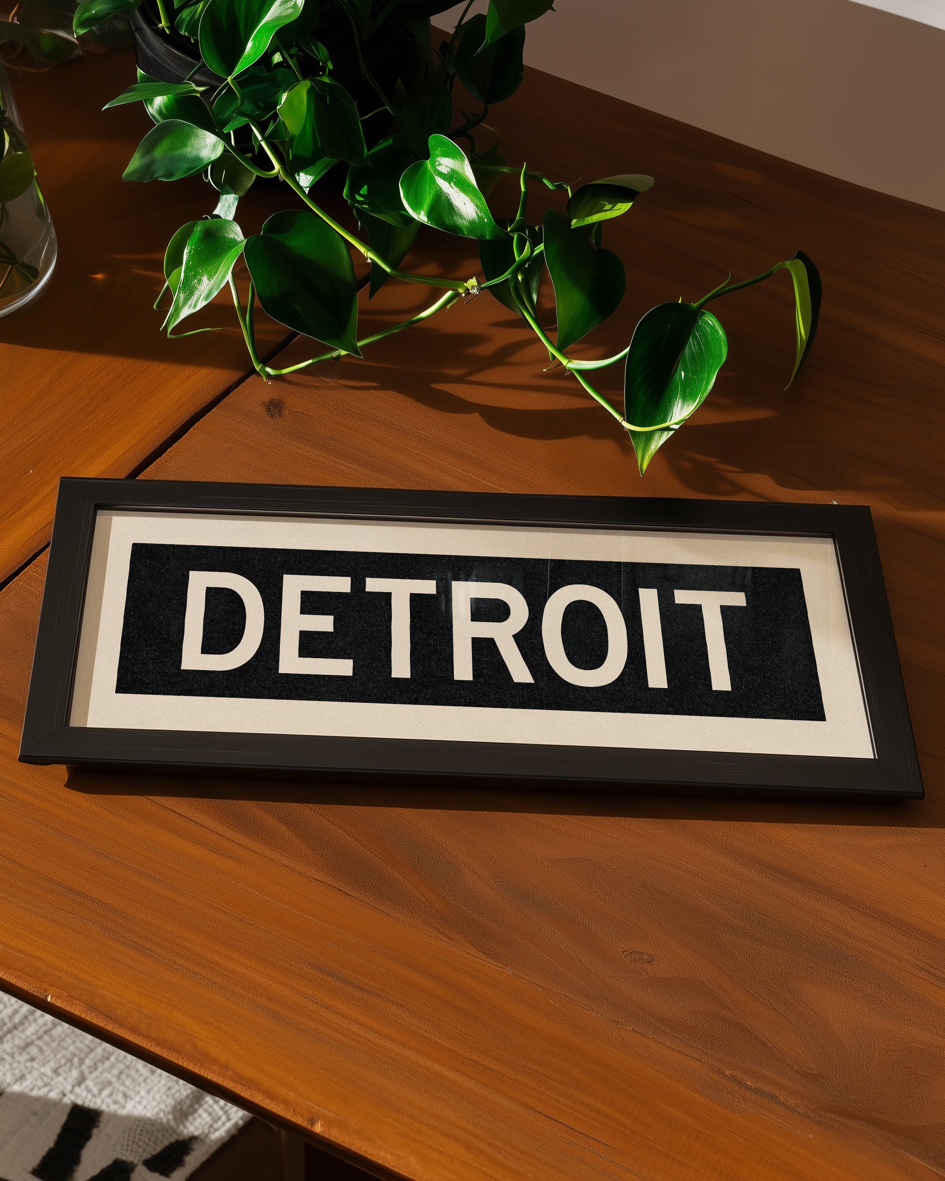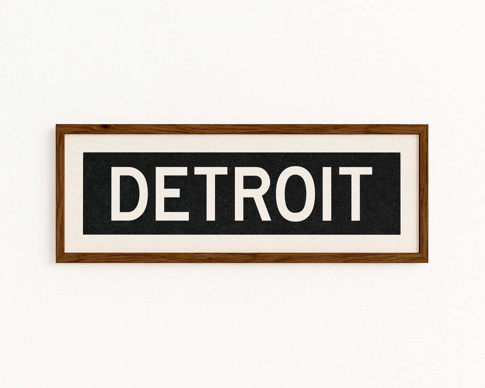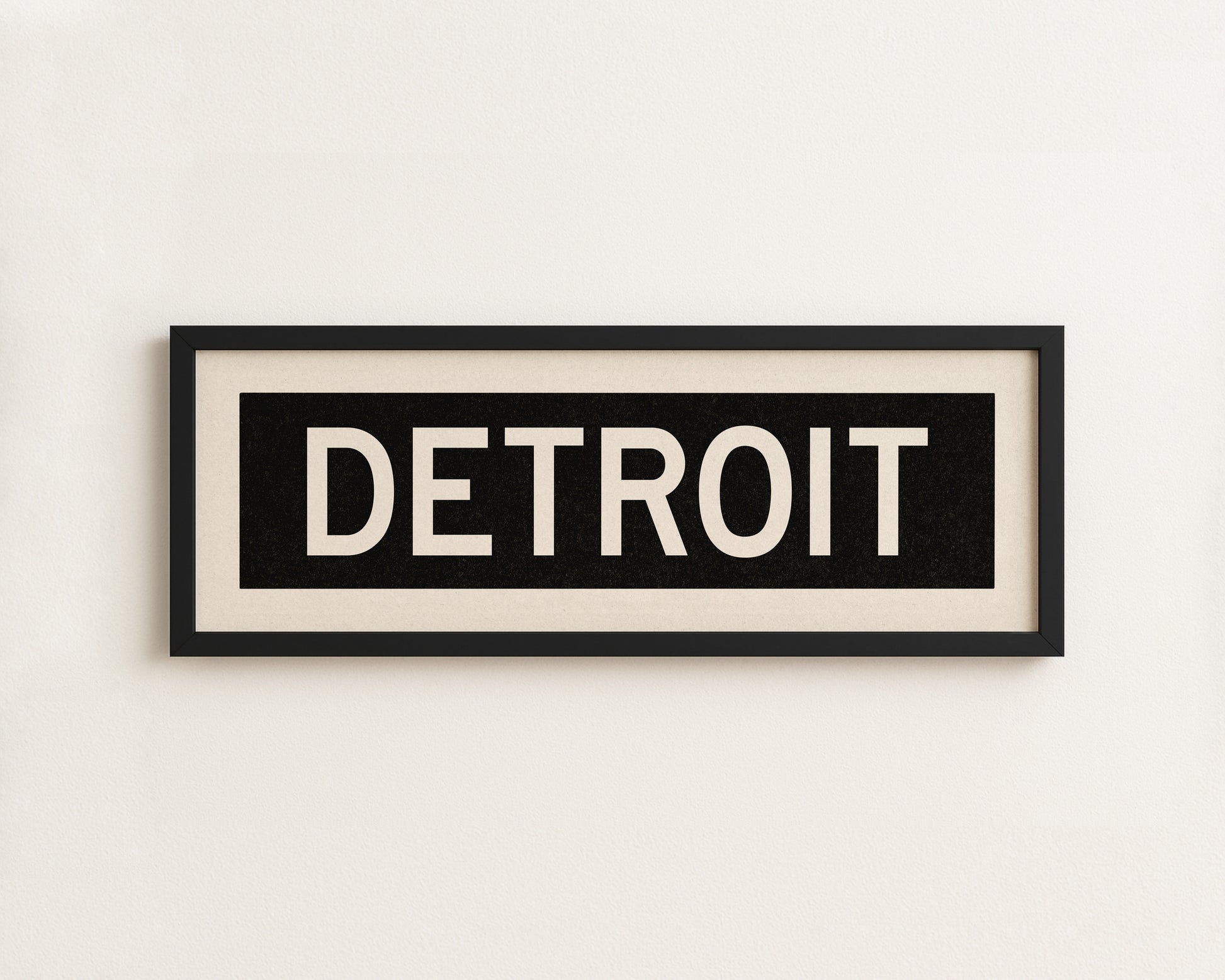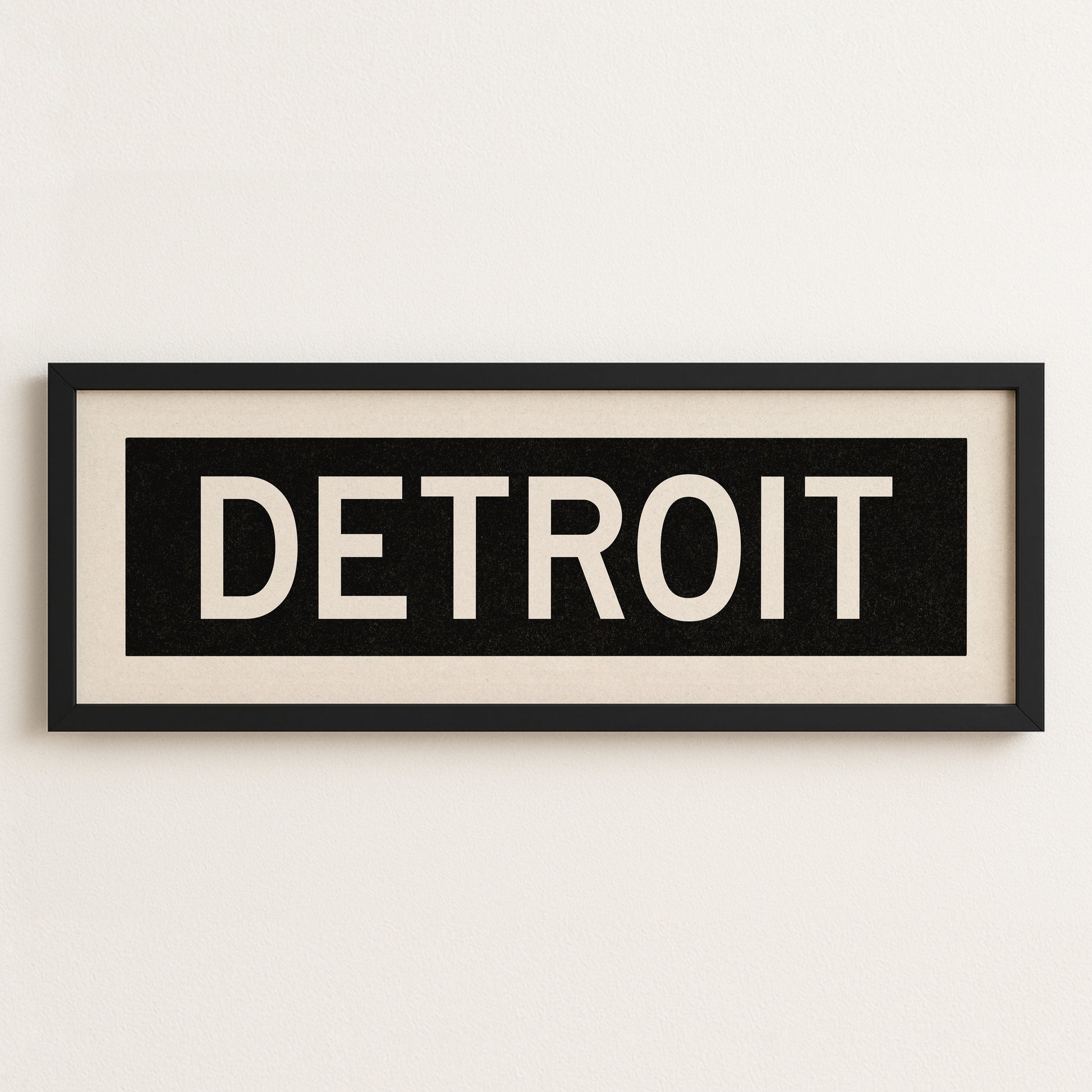 Framed black and white "DETROIT" vintage bus/train scroll sign art. Show off your love for Detroit, Michigan with this classic and simple framed scroll sign. Great gift for the native or the newcomer. Perfect for above the door, in an office, game room or accent in a living area.