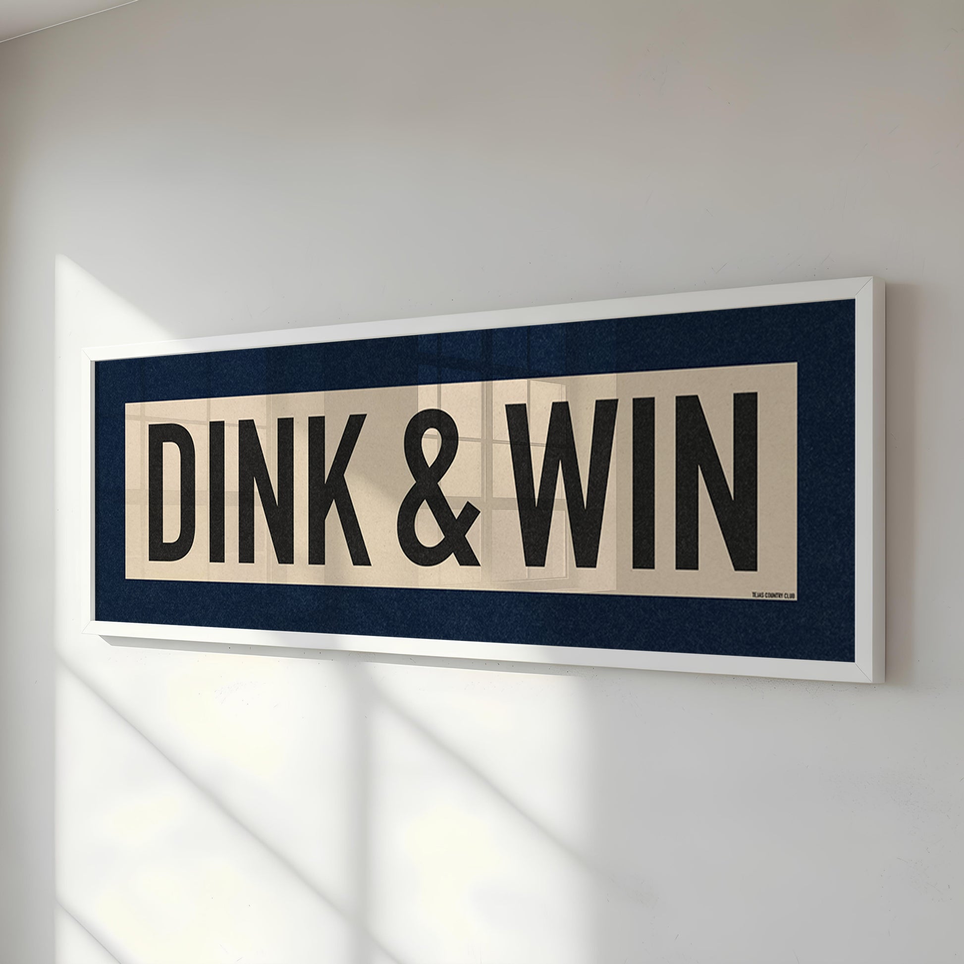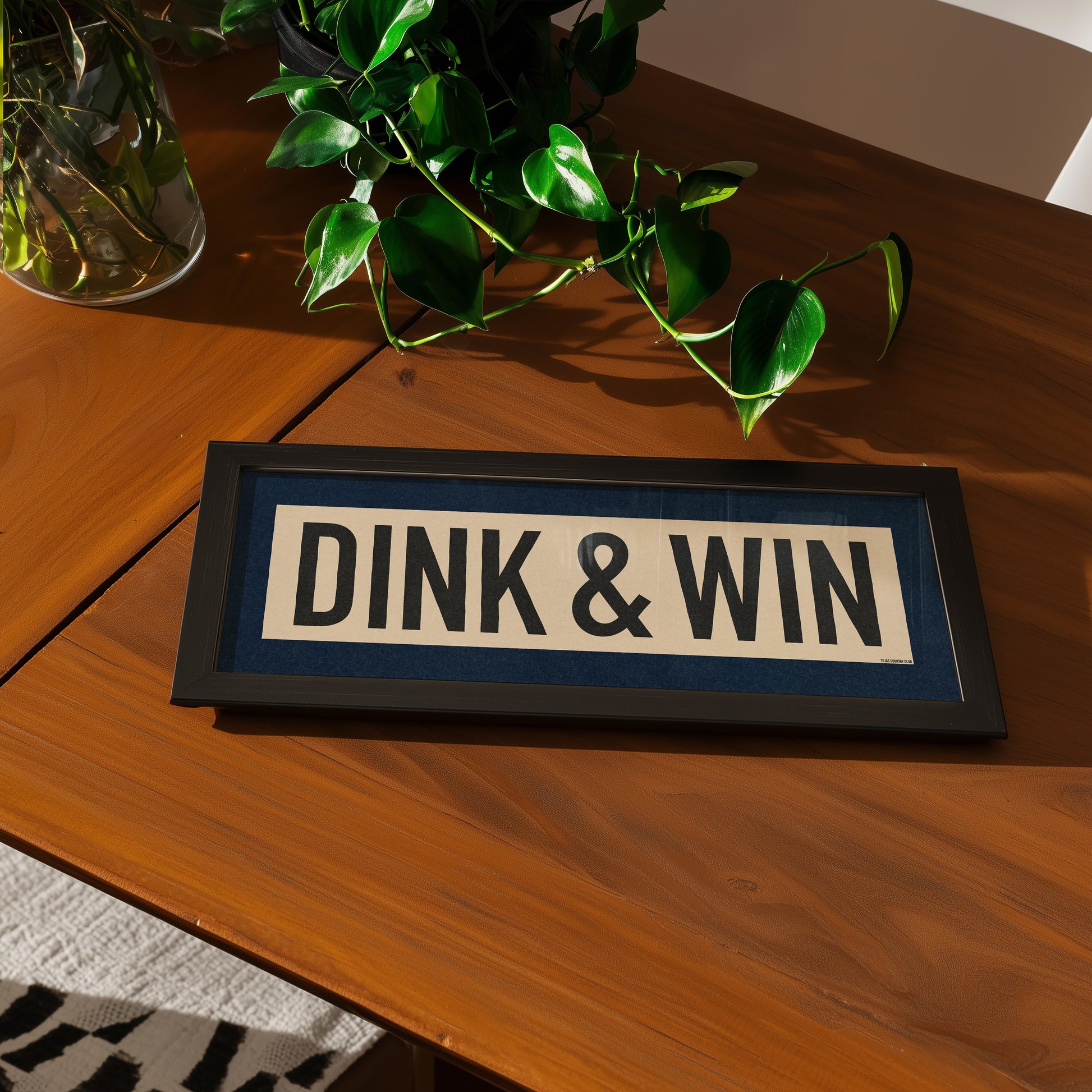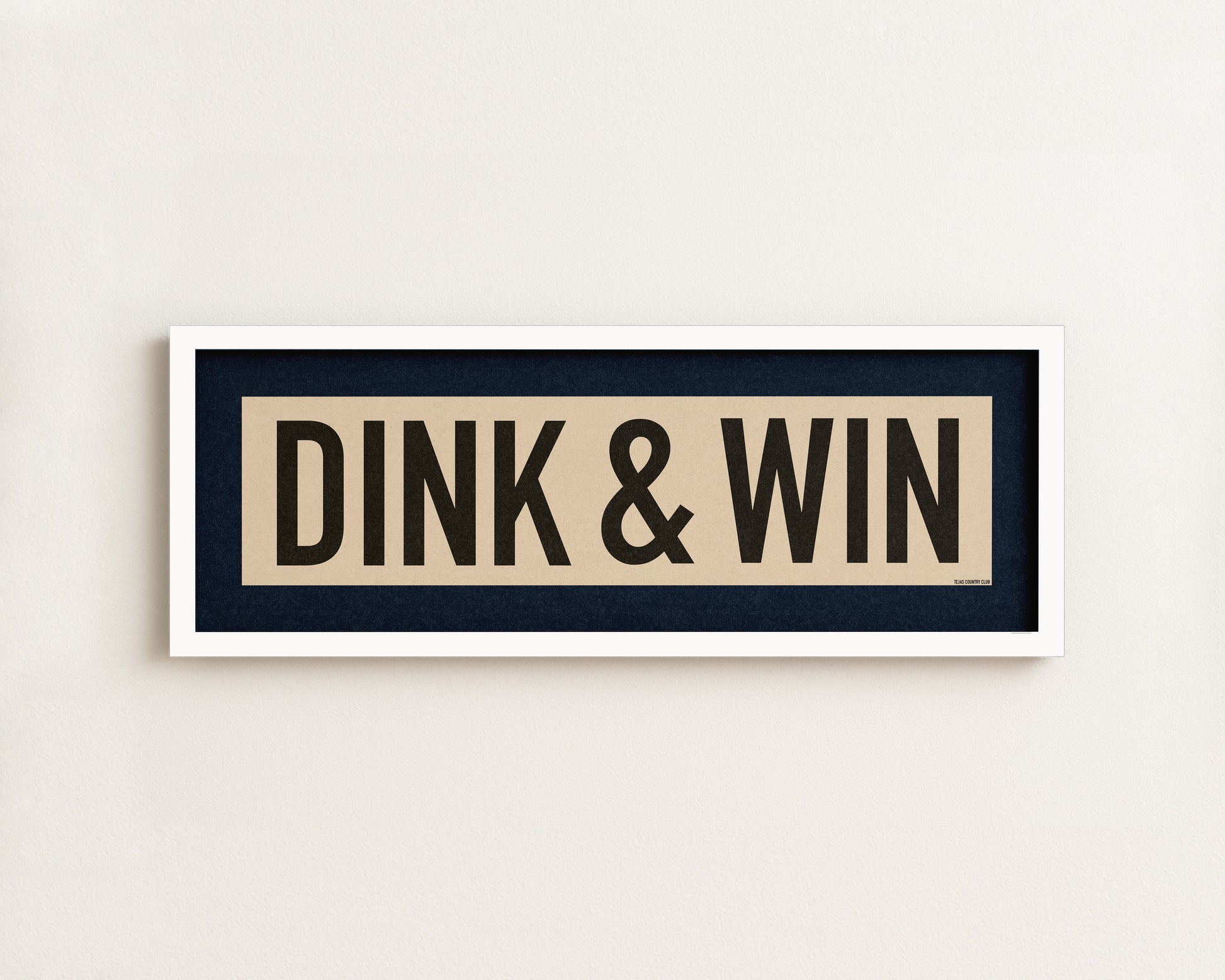 Framed navy and off white "DINK & WIN" vintage scroll sign art. Show off your love for catching those opponents off guard with the sneaky dink during a pickleball game with this classic and simple framed scroll sign. Perfect for above the door, in an office, game room or accent in a living area.