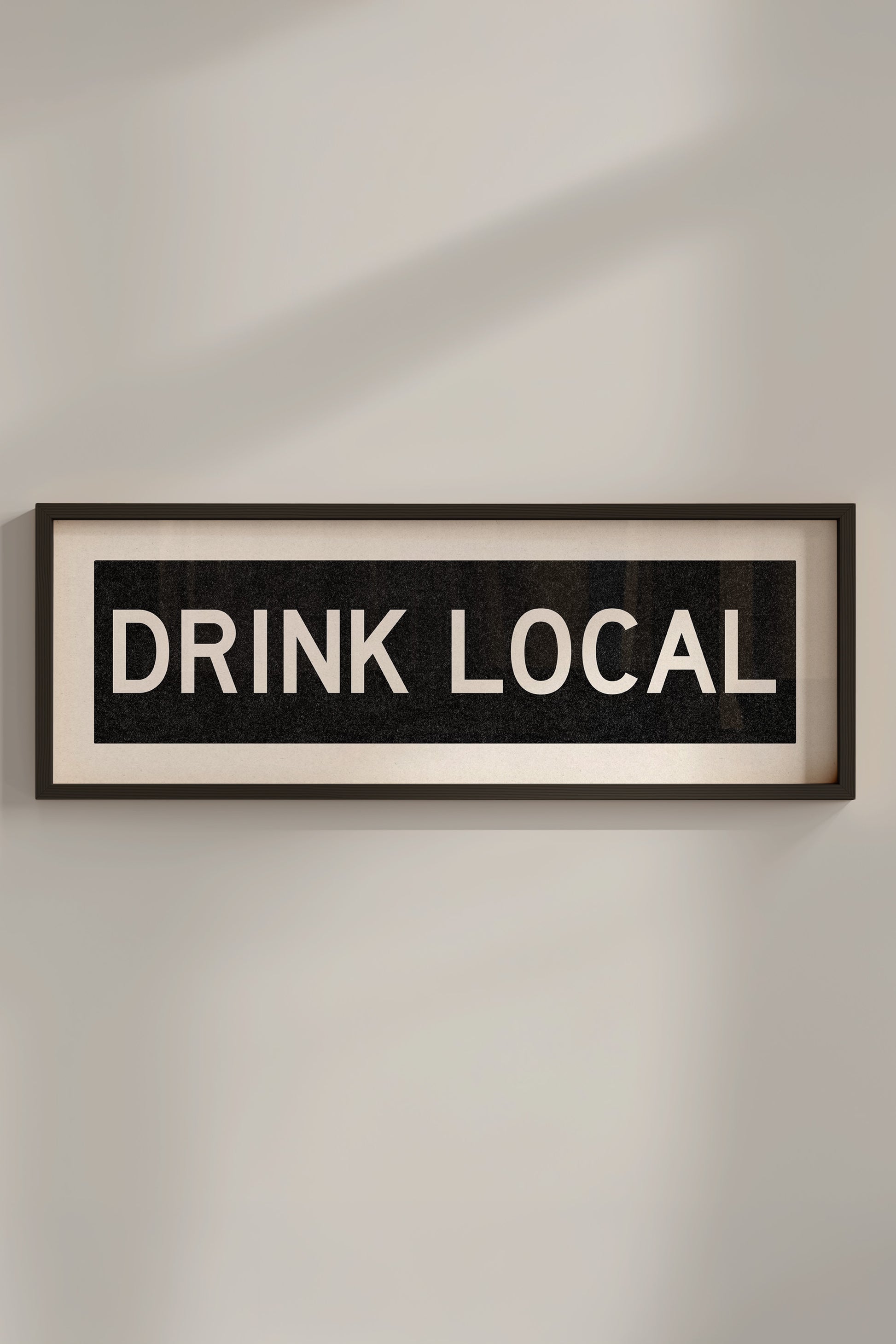 Framed "DRINK LOCAL" vintage bus/train scroll sign art. Show off your love for supporting your local hangout and keeping it local with your crew with this classic and simple framed scroll sign. Perfect for above the door, in an office, above the bar, game room or accent in the kitchen.