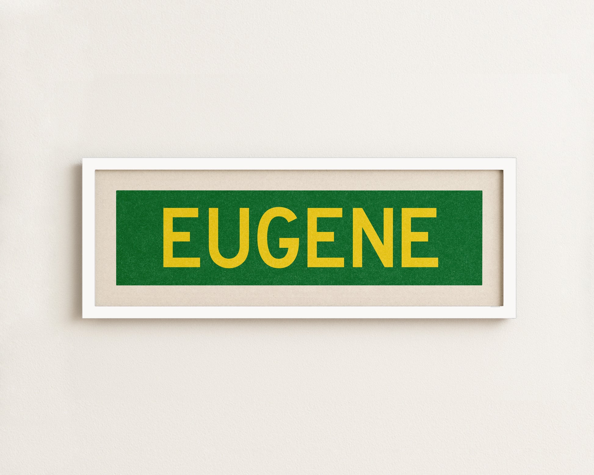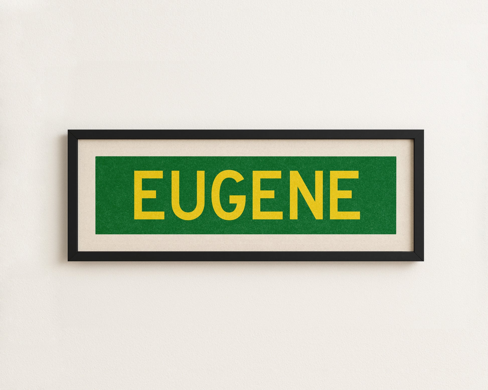 Framed green and gold "EUGENE" vintage bus/train scroll sign art. Show off your love for Eugene, Oregon with this classic and simple framed scroll sign. Perfect for above the door, in an office, game room or accent in a living area.