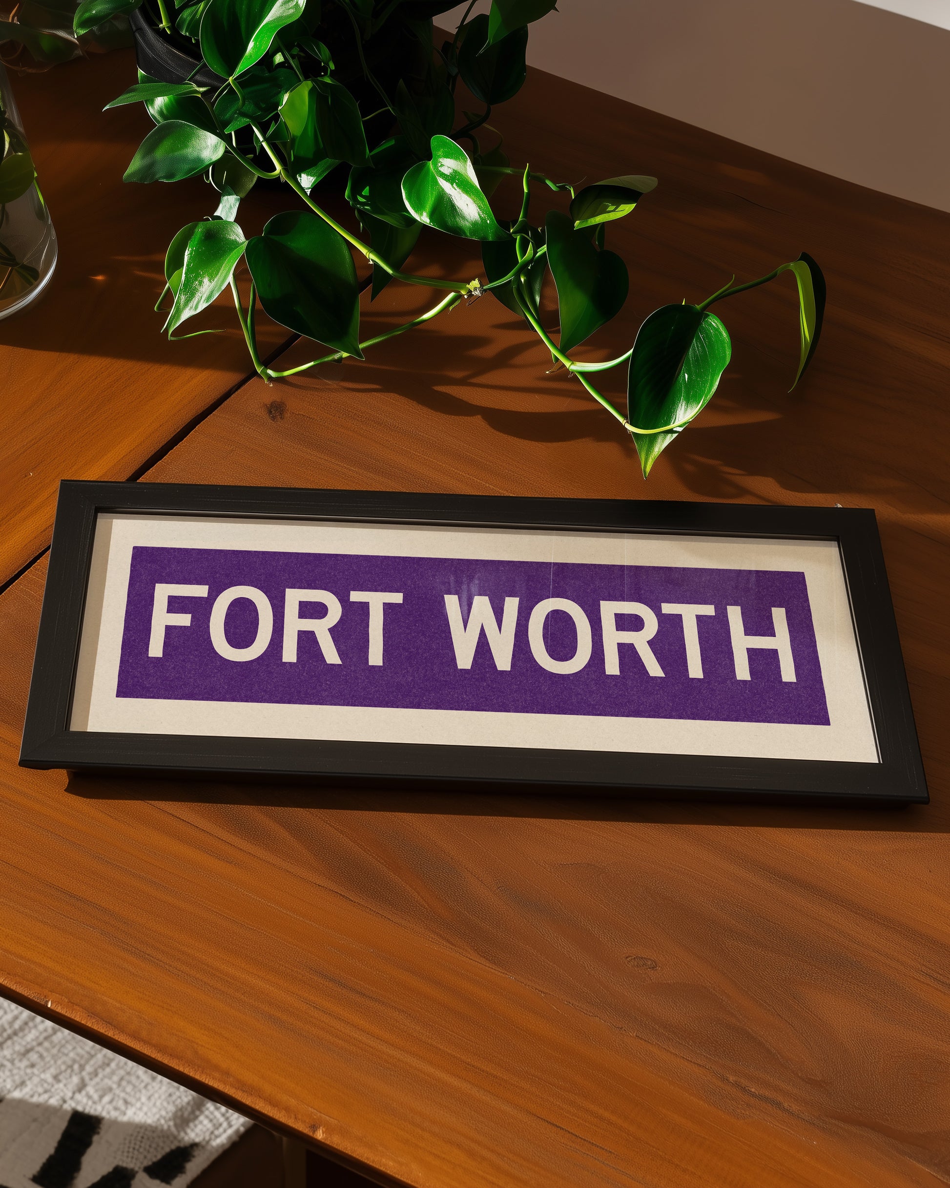 Framed purple "FORT WORTH" vintage bus/train scroll sign art. Show off your love for Fort Worth, Texas with this classic and simple framed scroll sign. Perfect for above the door, in an office, game room or accent in a living area.