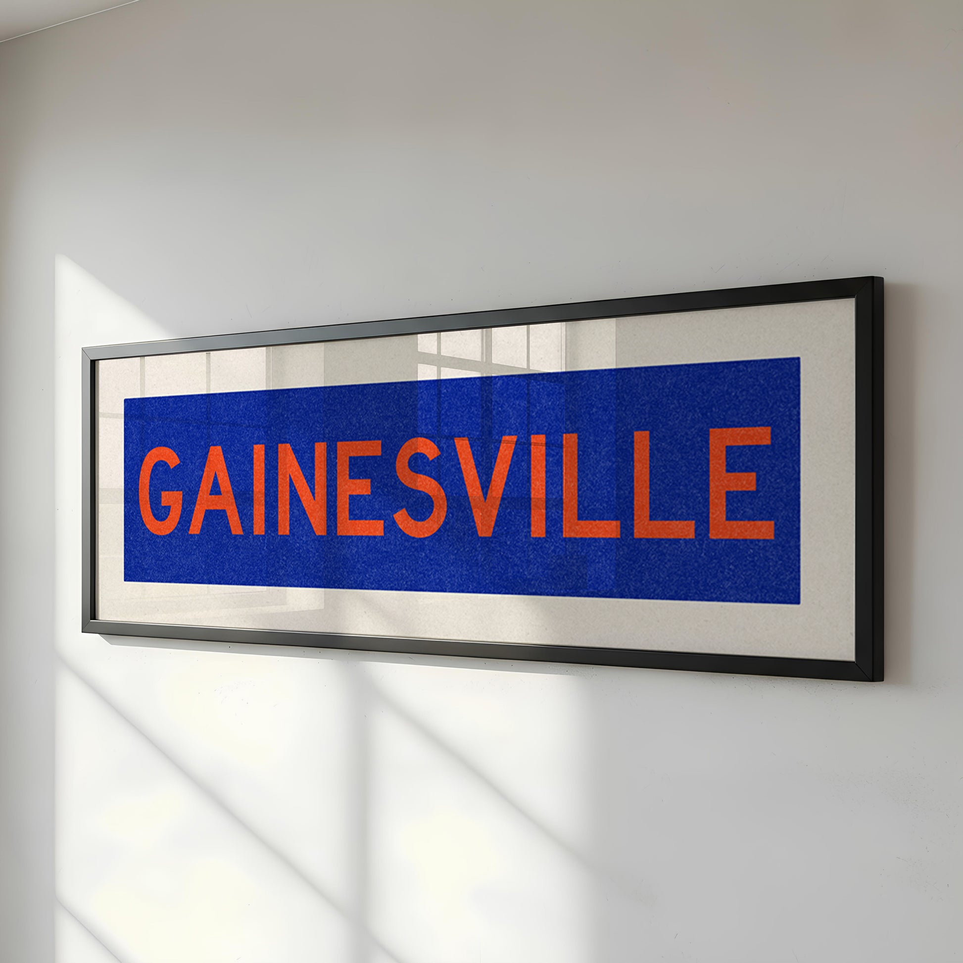 Framed blue and orange "GAINESVILLE" vintage bus/train scroll sign art. Show off your love for Gainesville with this classic and simple framed scroll sign. Perfect for above the door, in an office, game room or accent in a living area.