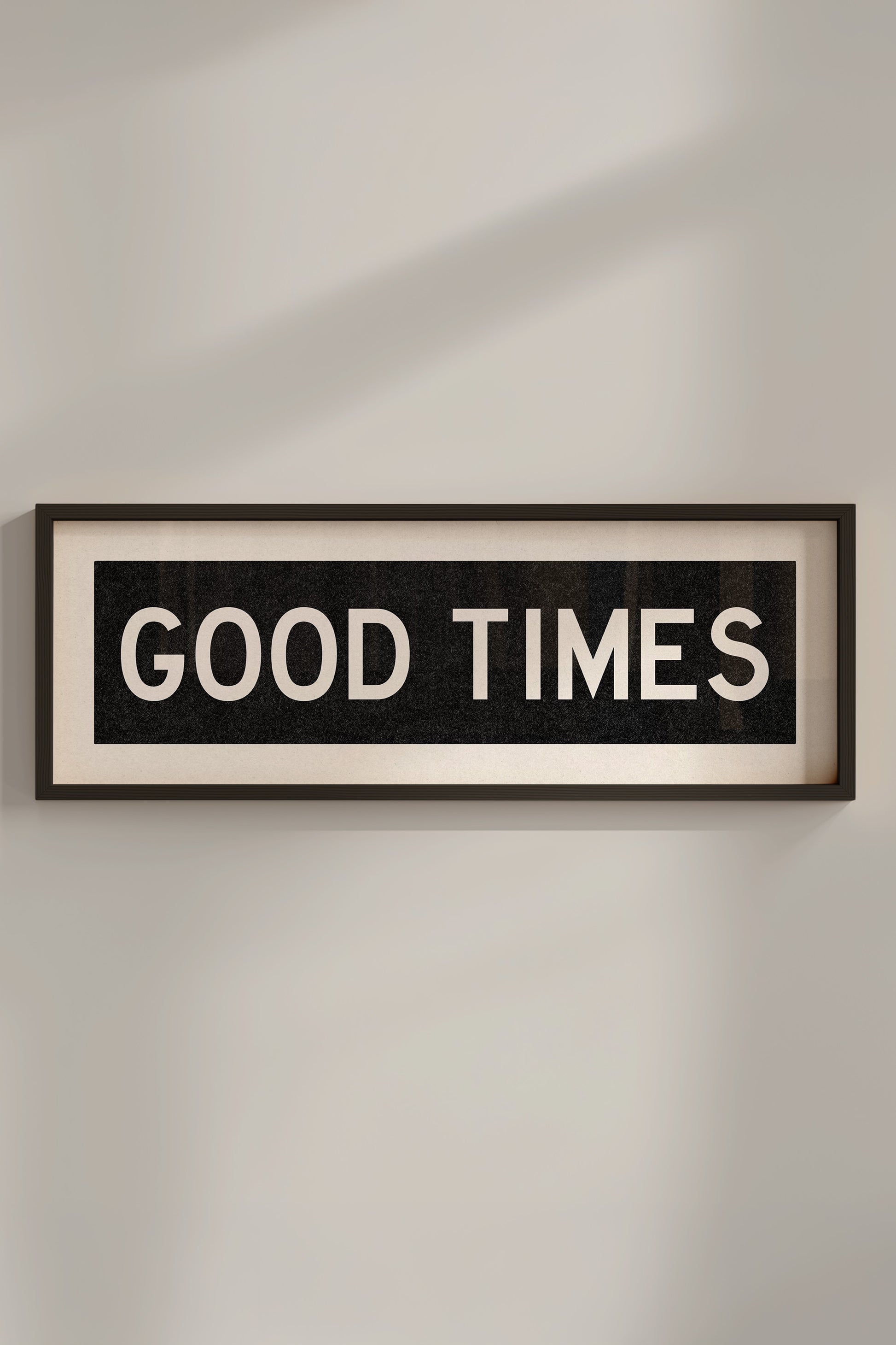 Framed "GOOD TIMES" vintage bus/train scroll sign art. Show off your love for having a good time with your crew with this classic and simple framed scroll sign. Perfect for above the door, in an office, above the bar, game room or accent in the kitchen.