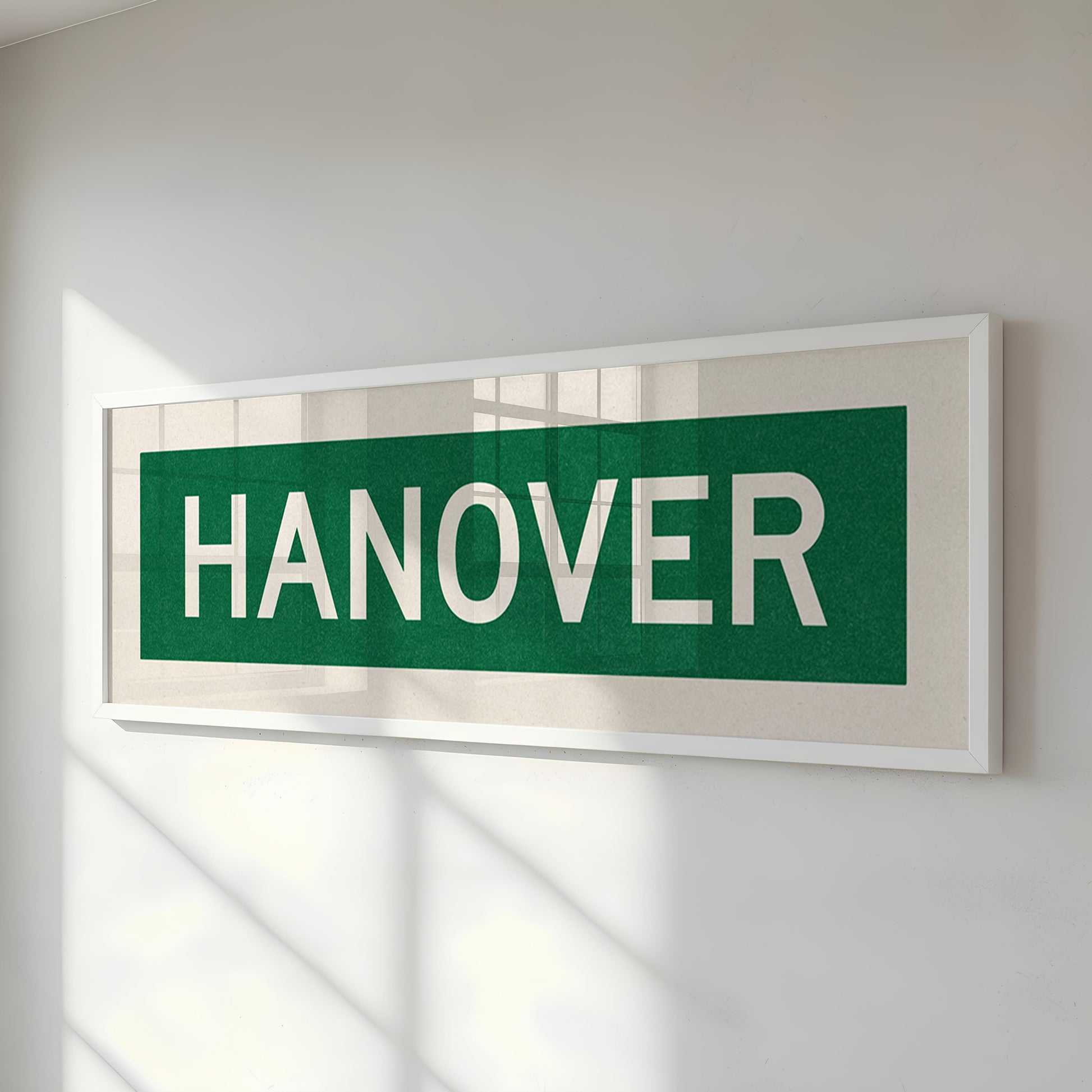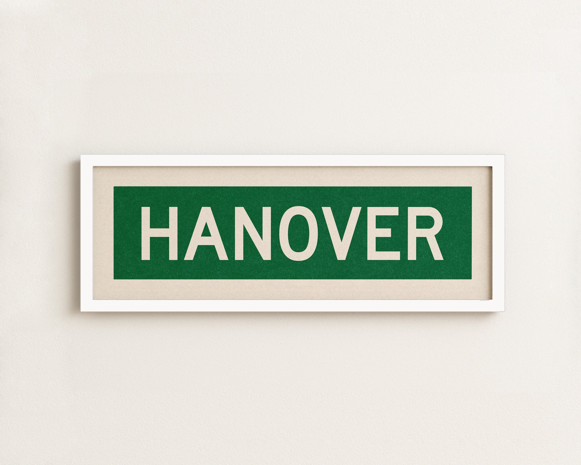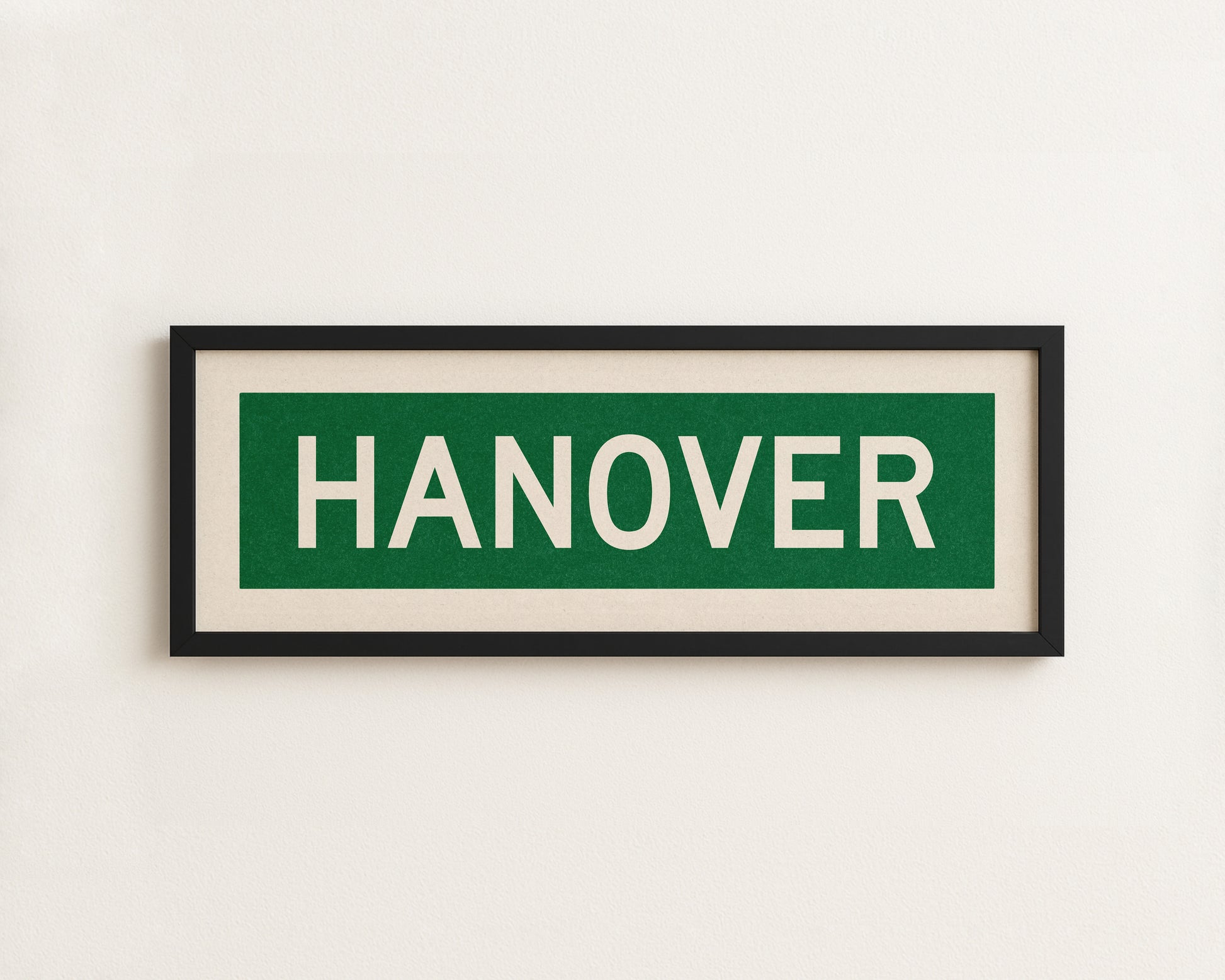 Framed green and white "HANOVER" vintage bus/train scroll sign art. Show off your love for Hanover, New Hampshire with this classic and simple framed scroll sign. Perfect for above the door, in an office, game room or accent in a living area.