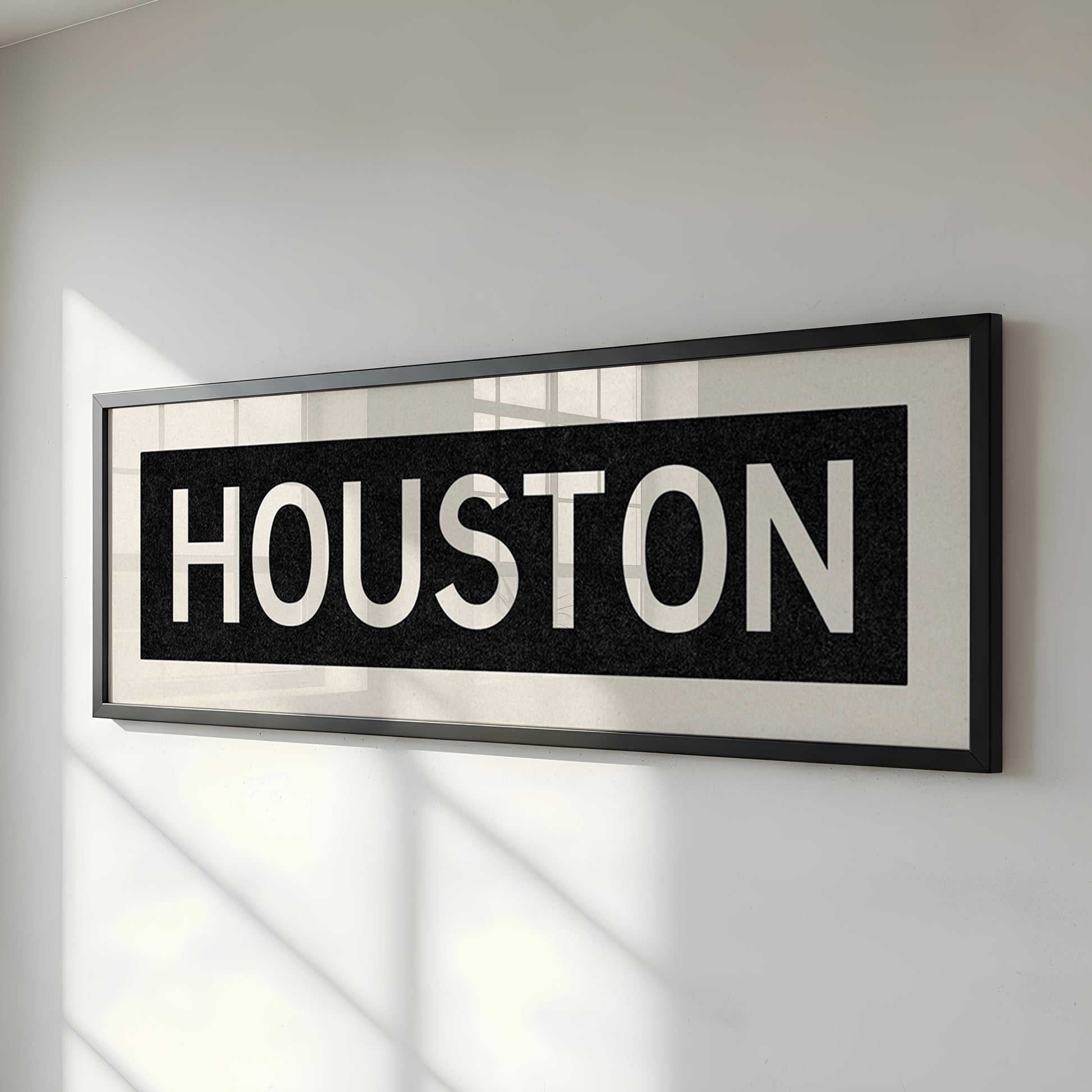 Framed "HOUSTON" vintage bus/train scroll sign art. Show off your love for Houston with this classic and simple framed scroll sign. Perfect for above the door, in an office, game room or accent in a living area.