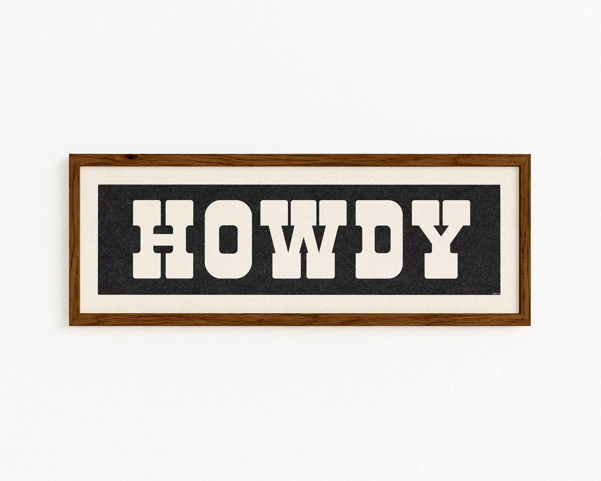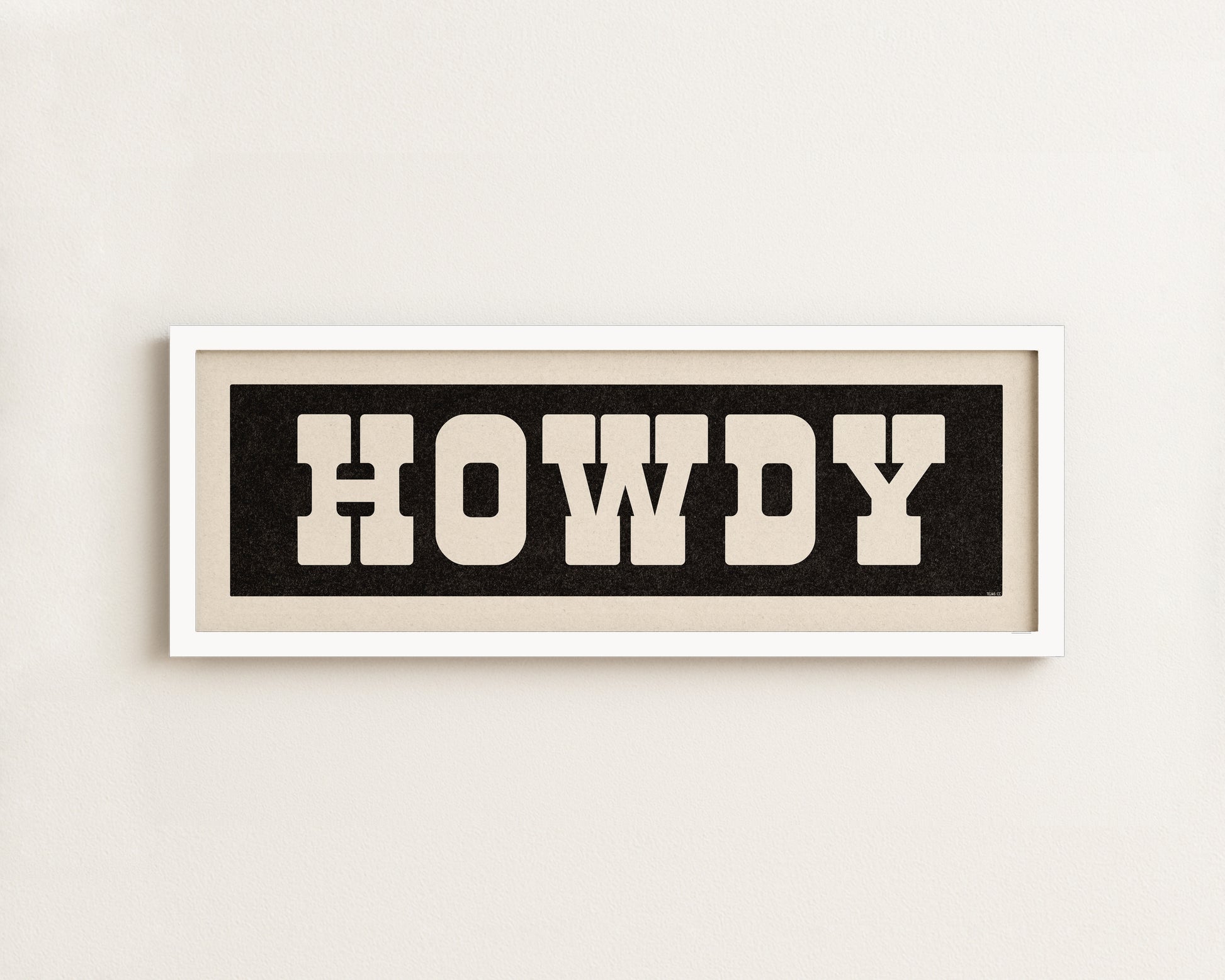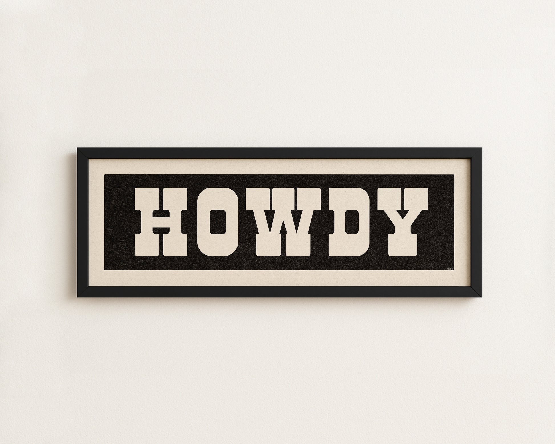 HOWDY! This framed black and white typography sign will add that splash of color and Southern / Western charm that your wall has been missing. These are perfect additions for gallery walls or over the door pieces. The print comes framed and you have 4 color options to choose from.