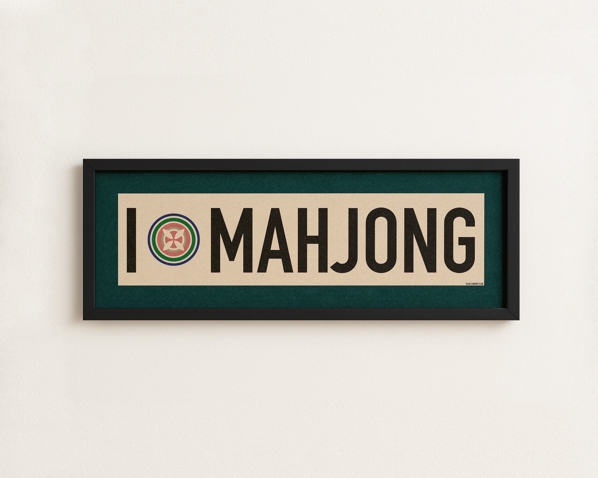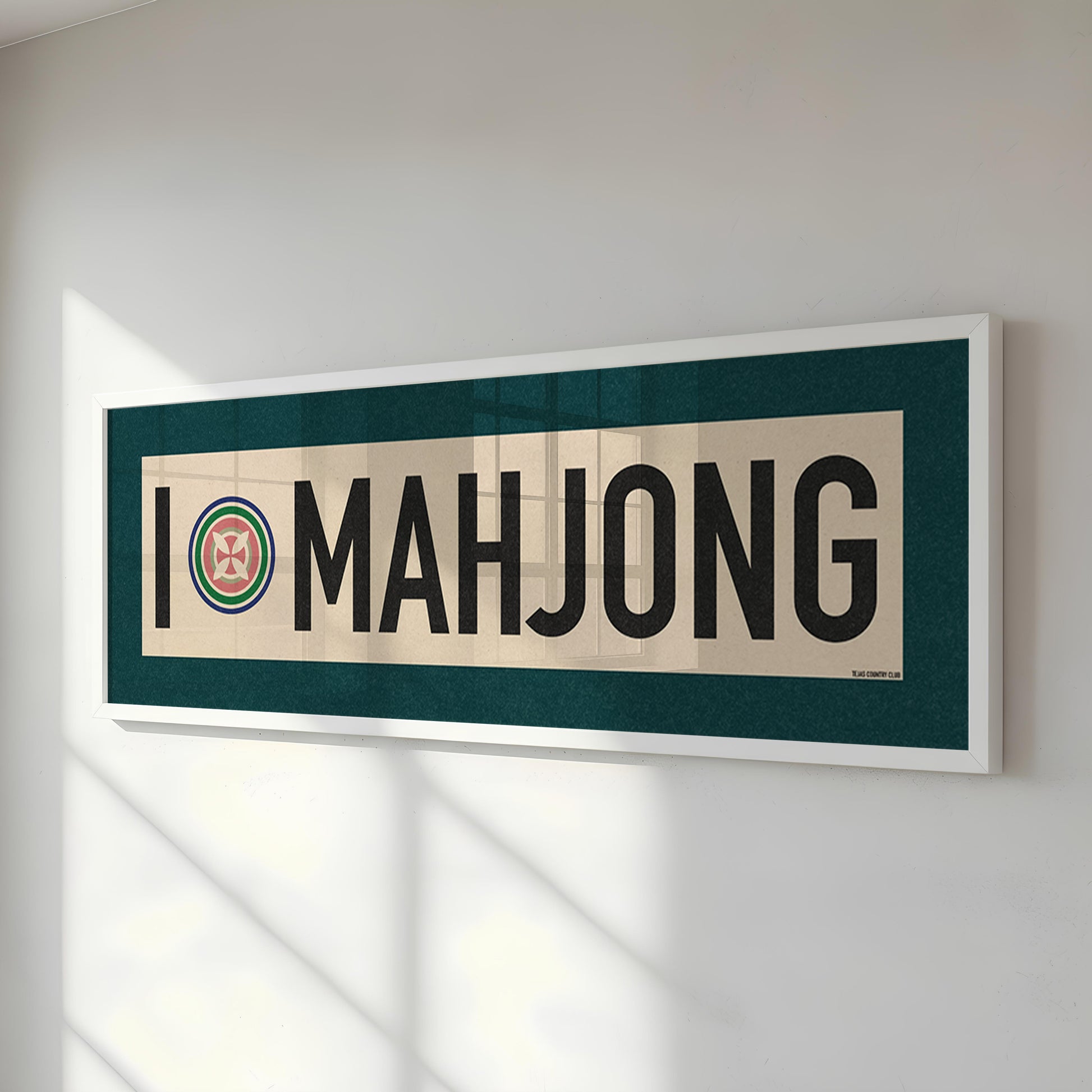 Framed teal and off white "I LOVE MAHJONG" vintage scroll sign art. Show off your love for the fast paced brain stretching game of Mahjong that we all love. Liven up that wall with this classic and simple framed scroll sign. Perfect for above the door, in an office, game room or accent in a living area.