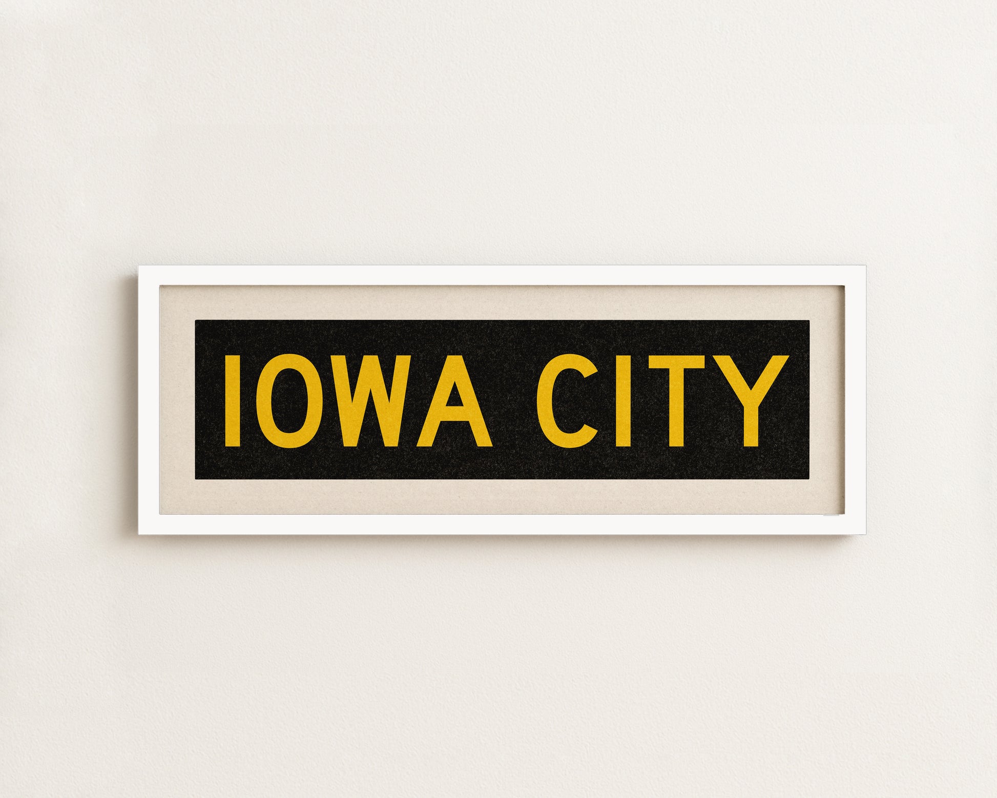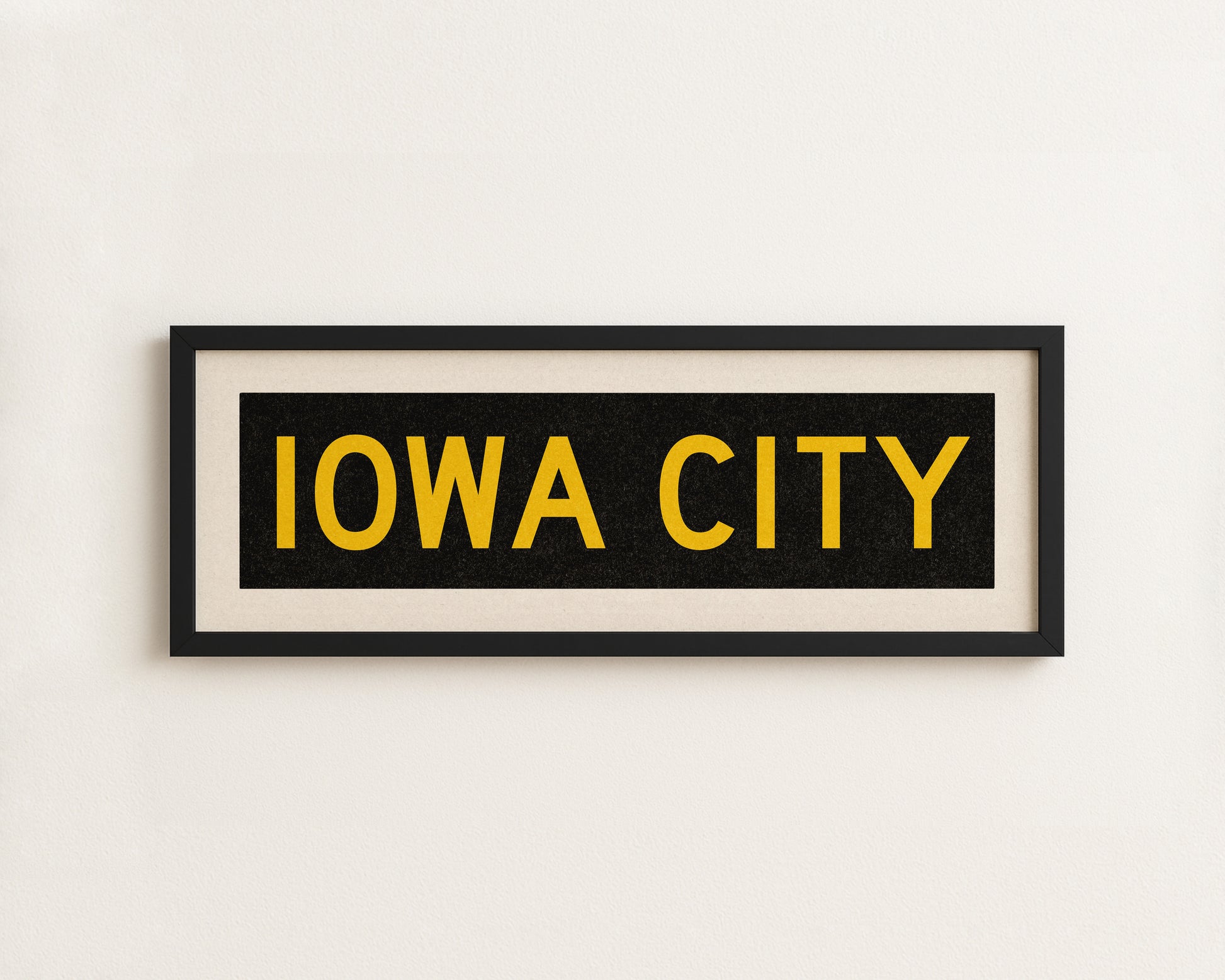 Framed gold and black "IOWA CITY" vintage bus/train scroll sign art. Show off your love for Iowa City, Iowa with this classic and simple framed scroll sign. Perfect for above the door, in an office, game room or accent in a living area.