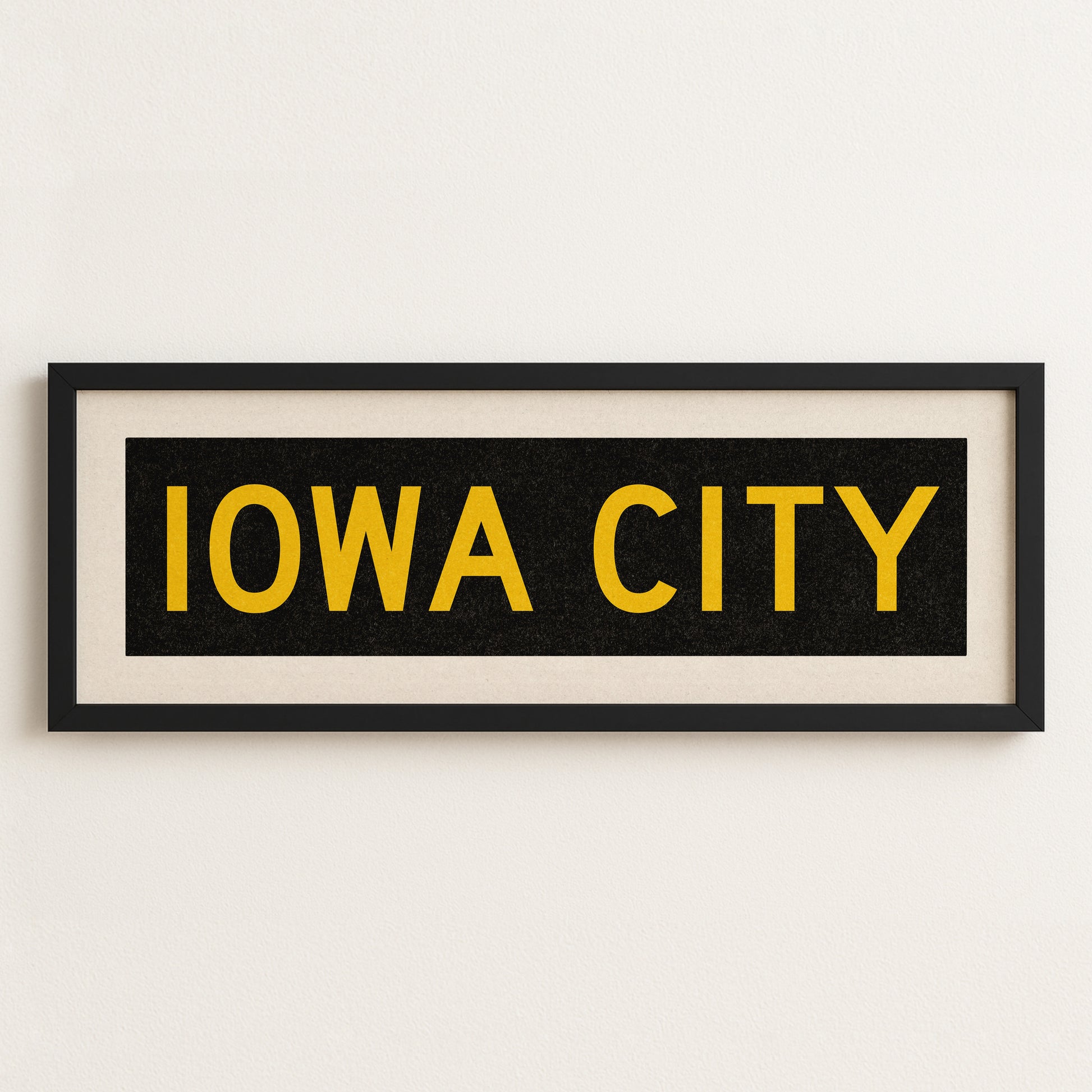 Framed gold and black "IOWA CITY" vintage bus/train scroll sign art. Show off your love for Iowa City, Iowa with this classic and simple framed scroll sign. Perfect for above the door, in an office, game room or accent in a living area.