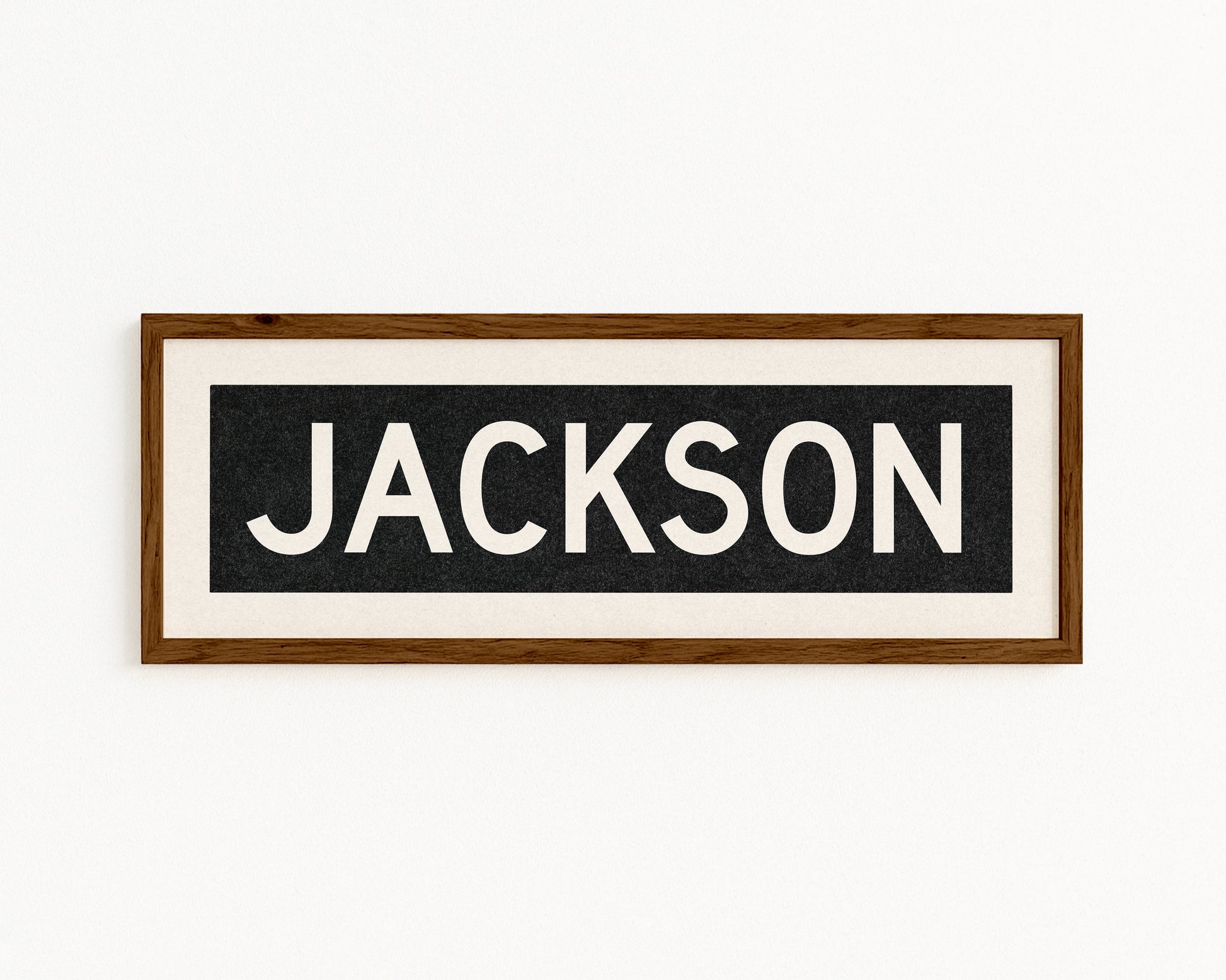 Framed black and white "JACKSON" vintage bus/train scroll sign art. Show off your love for Jackson, Mississippi or Jackson, Tennessee with this classic and simple framed scroll sign. Great gift for the native or the newcomer. Perfect for above the door, in an office, game room or accent in a living area.