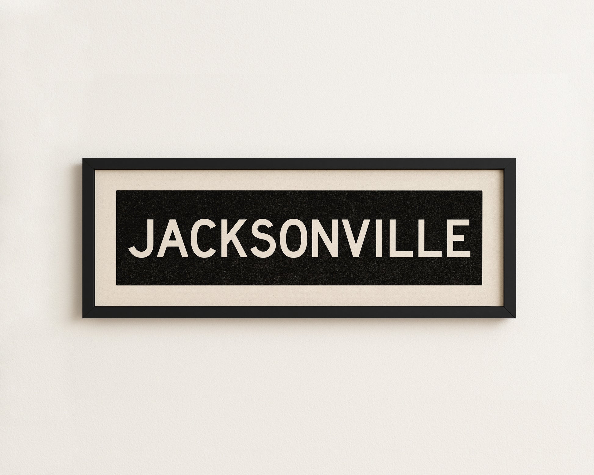 Framed black and white "JACKSONVILLE" vintage bus/train scroll sign art. Show off your love for Jacksonville, Florida with this classic and simple framed scroll sign. Great gift for the native or the newcomer. Perfect for above the door, in an office, game room or accent in a living area.