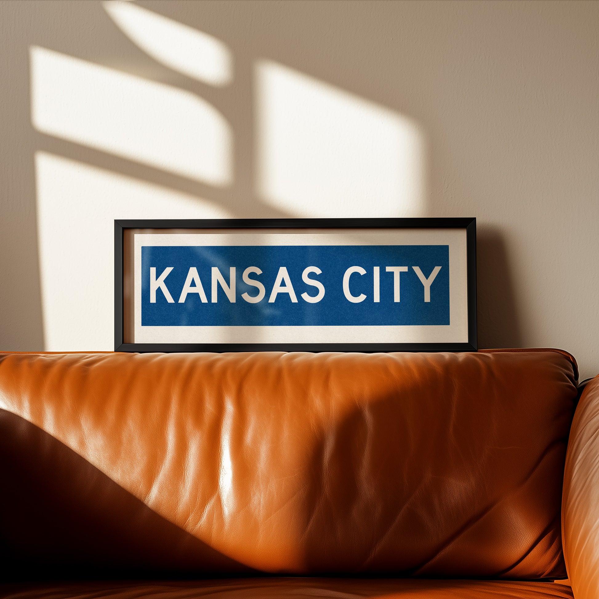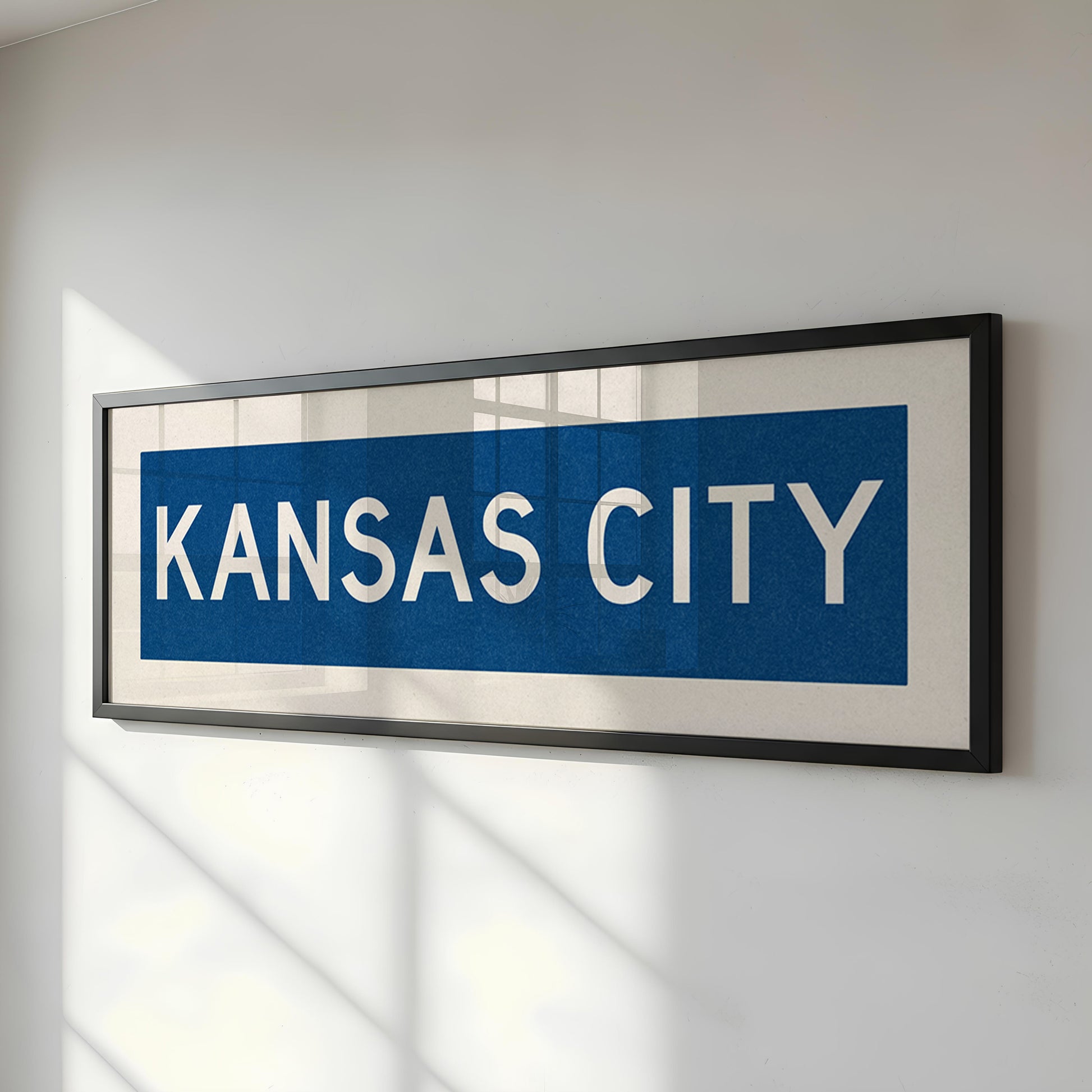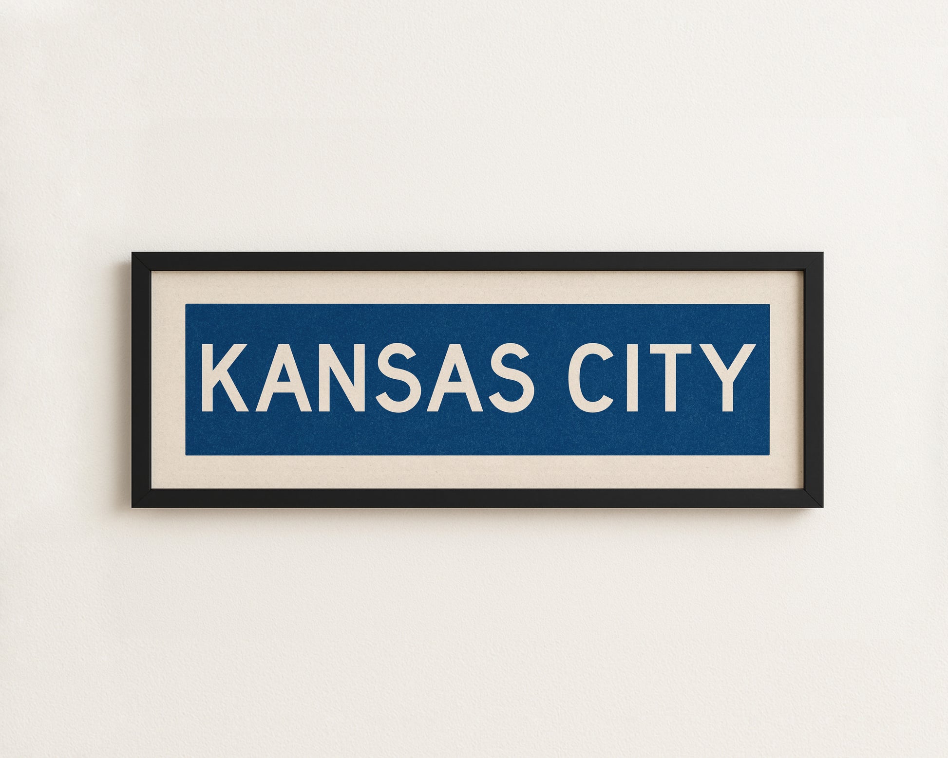 Framed blue and white "KANSAS CITY" vintage bus/train scroll sign art. Show off your love for Kansas City, Missouri with this classic and simple framed scroll sign. Perfect for above the door, in an office, game room or accent in a living area.