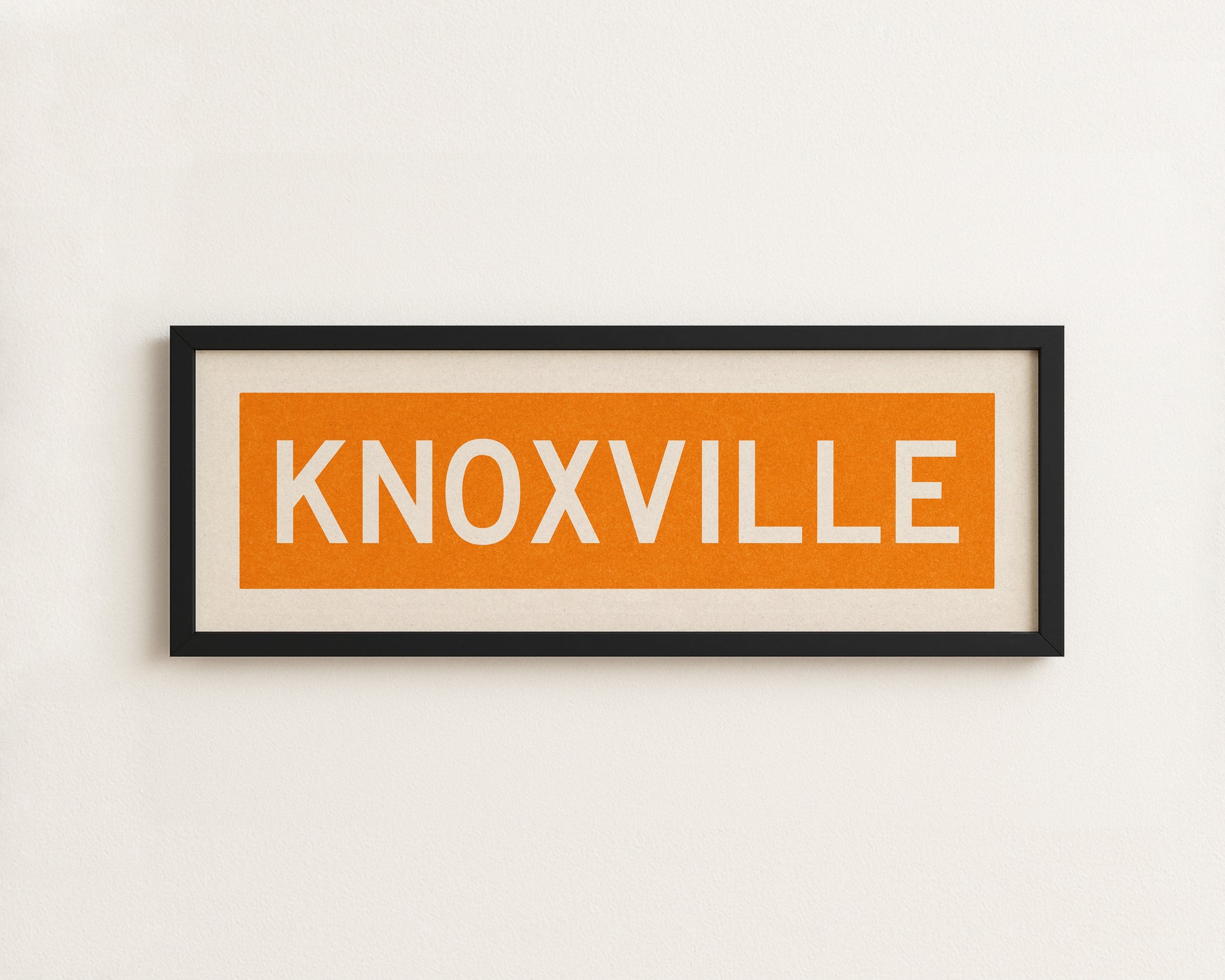 Framed orange "KNOXVILLE" vintage bus/train scroll sign art. Show off your love for Knoxville with this classic and simple framed scroll sign. Perfect for above the door, in an office, game room or accent in a living area.