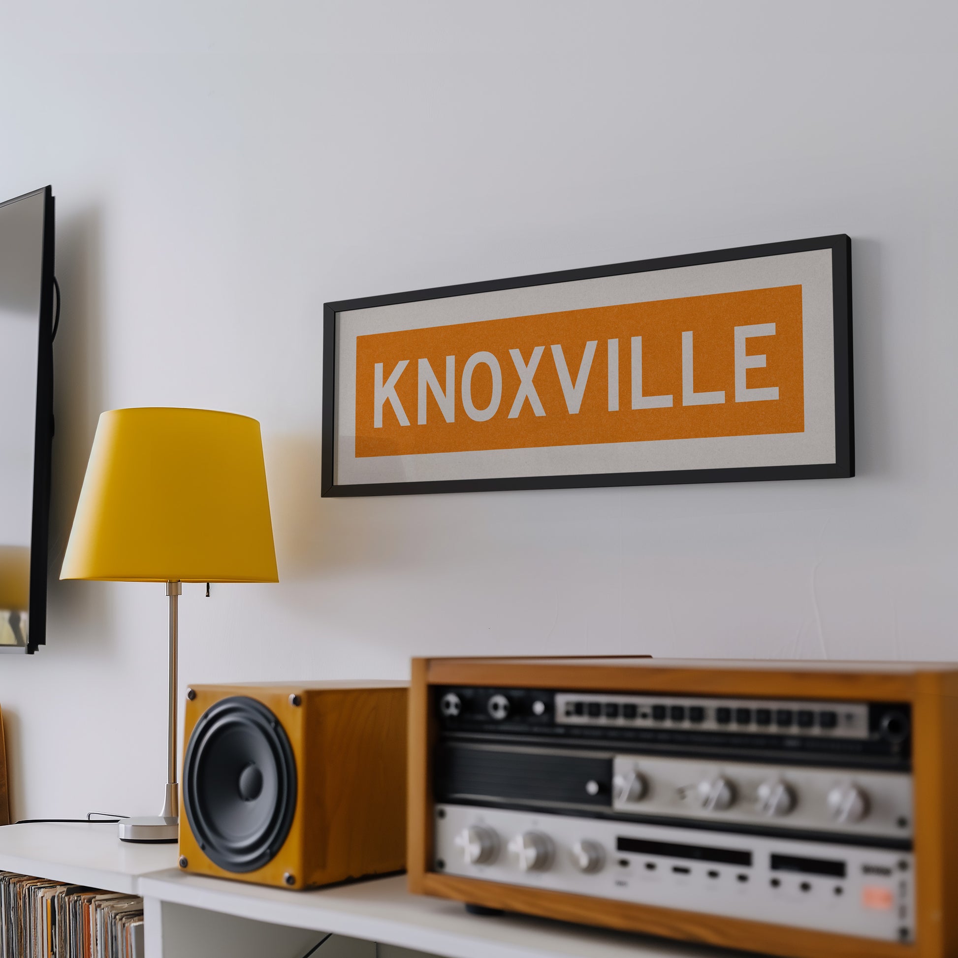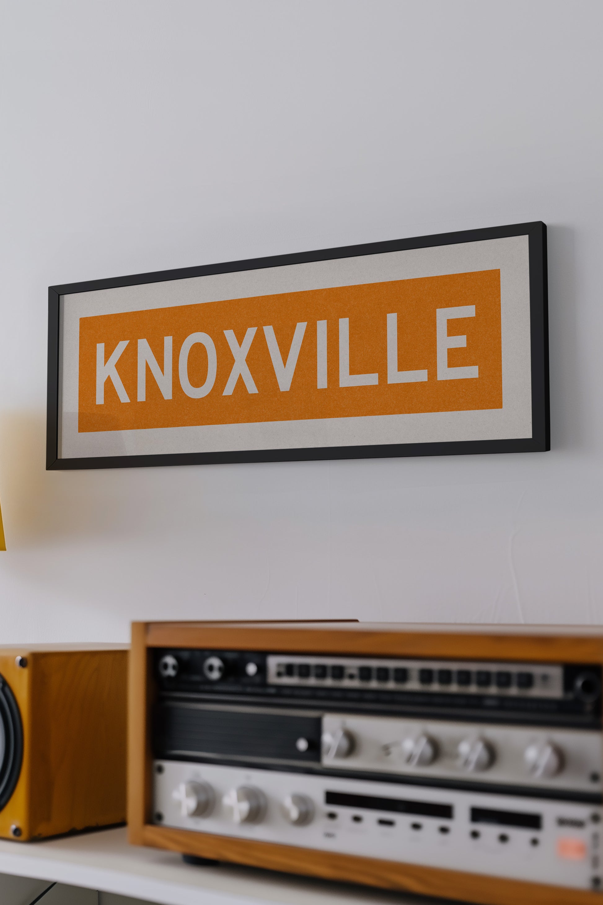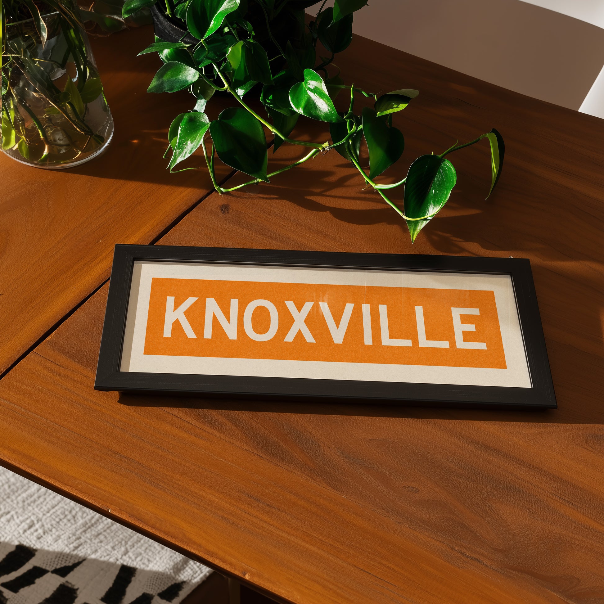 Framed orange "KNOXVILLE" vintage bus/train scroll sign art. Show off your love for Knoxville, Tennessee with this classic and simple framed scroll sign. Perfect for above the door, in an office, game room or accent in a living area.