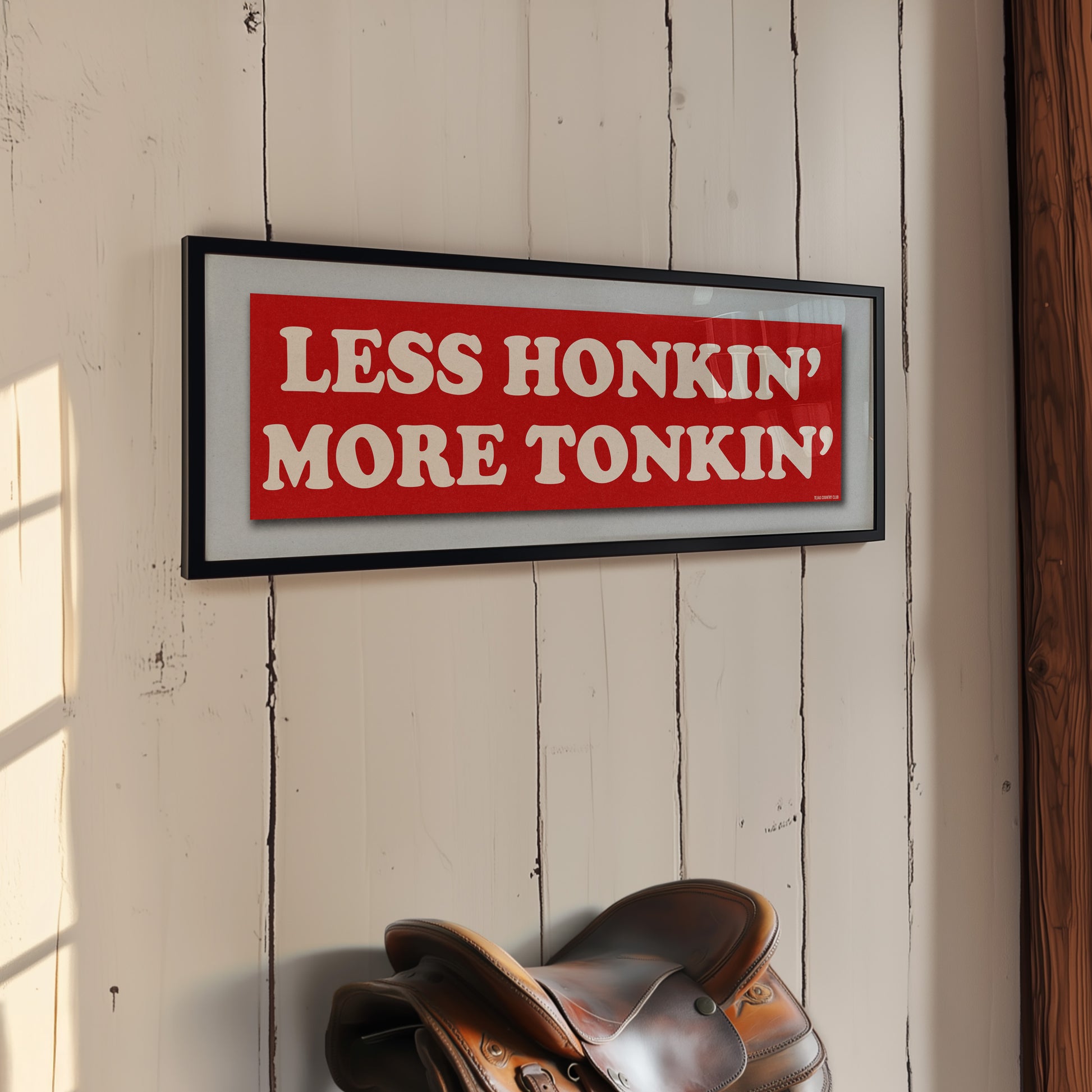 Honky Tonkin" ! This framed design of a vintage style bumper sticker that says "LESS HONKIN' MORE TONKIN' " will add that splash of honky tonk and Southern / Western charm that your wall has been missing. It is perfect for the dance lover in your family. These are perfect additions for gallery walls, bar cart art, or over the door pieces.