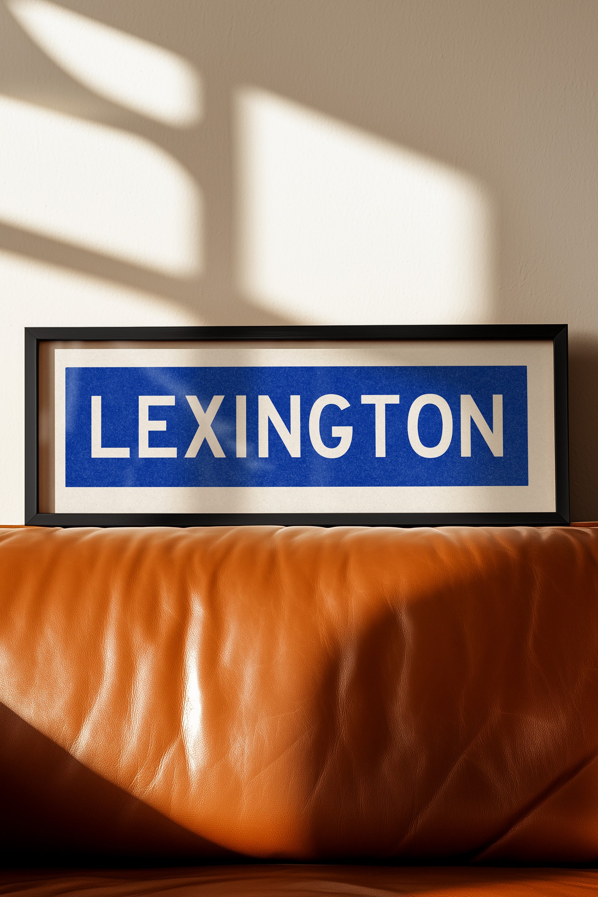 Framed royal blue "LEXINGTON" vintage bus/train scroll sign art. Show off your love for Lexington, Kentucky with this classic and simple framed scroll sign. Perfect for above the door, in an office, game room or accent in a living area.