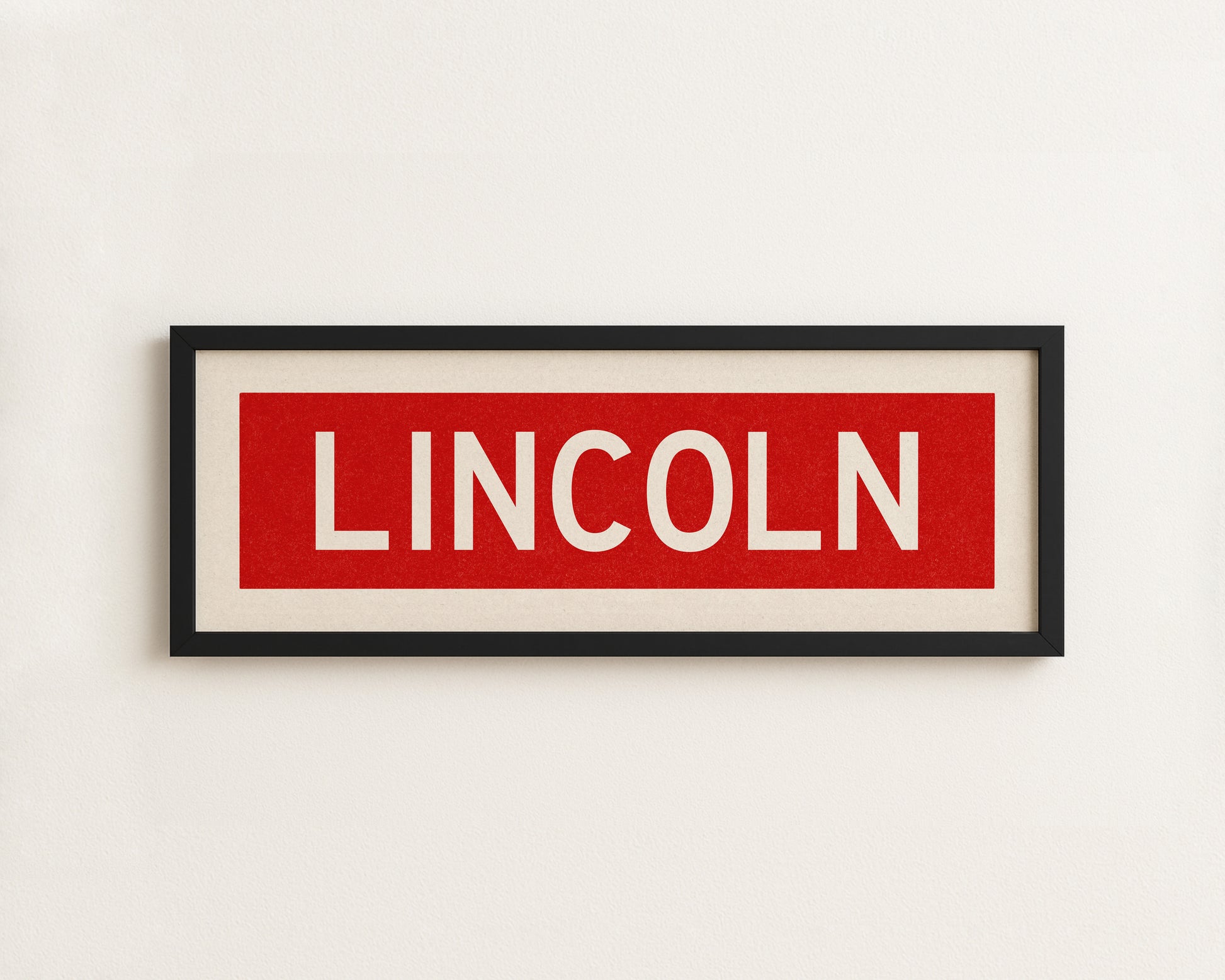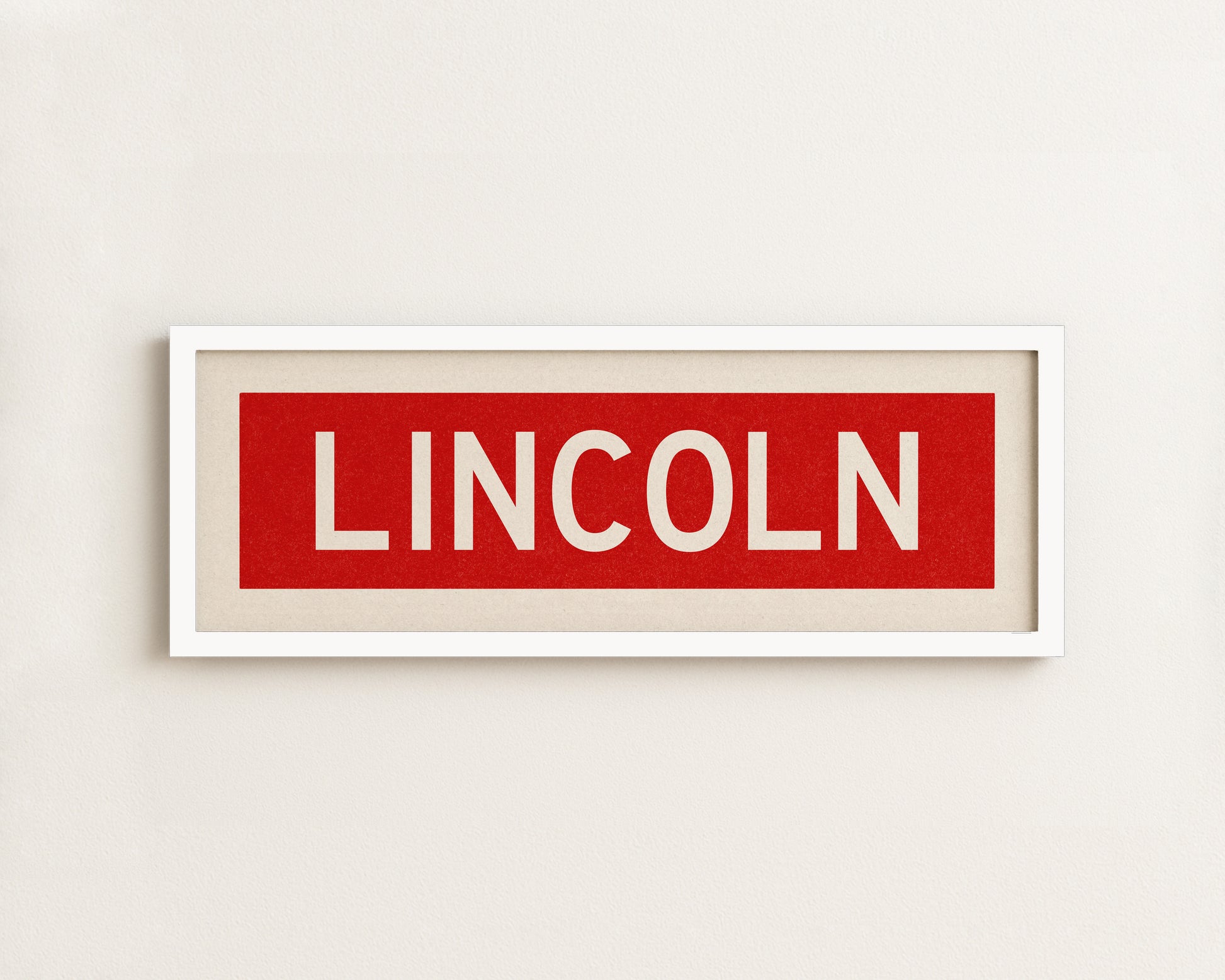 Framed red "LINCOLN" vintage bus/train scroll sign art. Show off your love for Lincoln, Nebraska with this classic and simple framed scroll sign. Perfect for above the door, in an office, game room or accent in a living area.