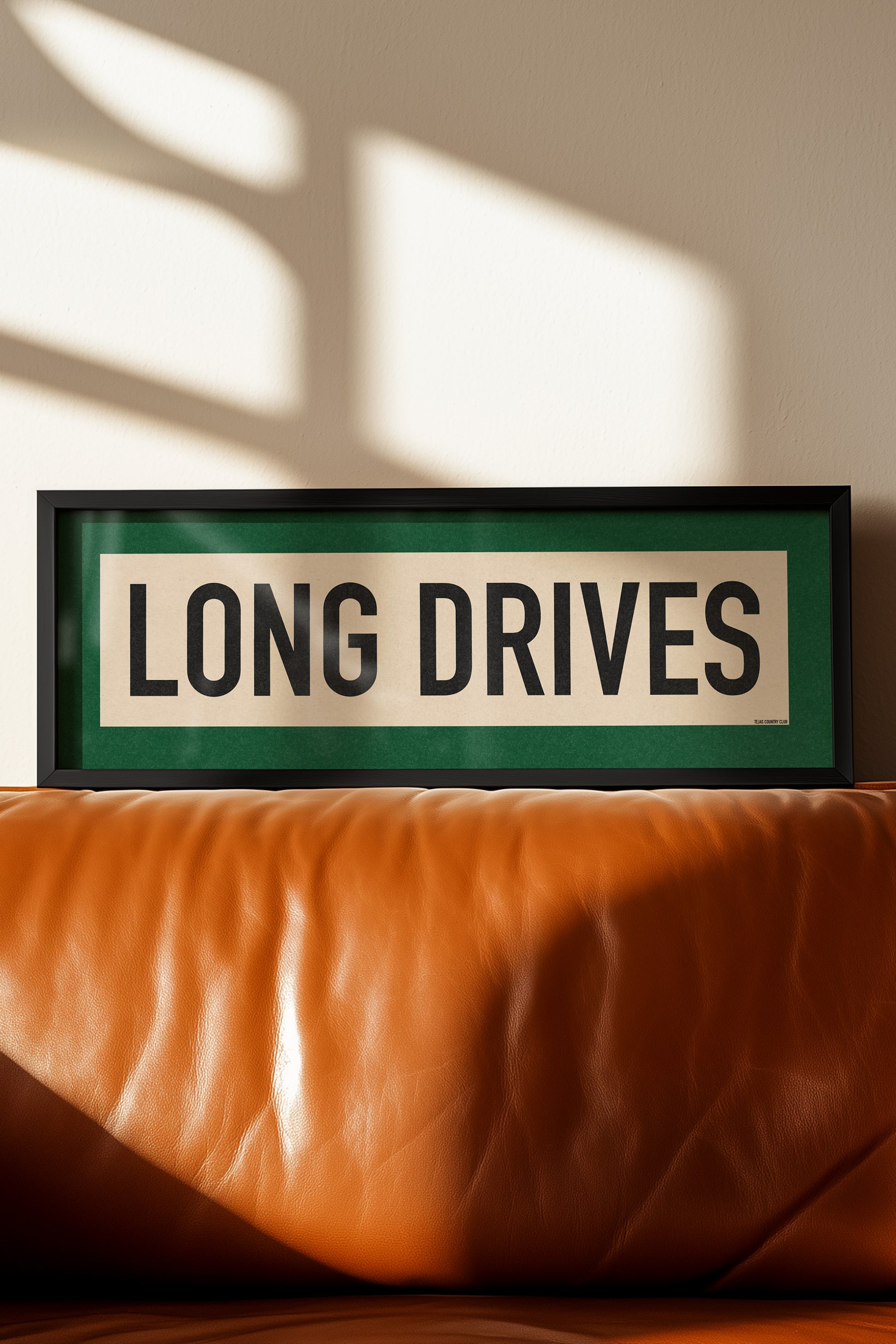 Framed green and off white "LONG DRIVES" vintage scroll sign art. Show off your love smashing tee shots with that big driver during a round of 18 holes with this classic and simple framed scroll sign. Perfect for above the door, in an office, game room or accent in a living area.