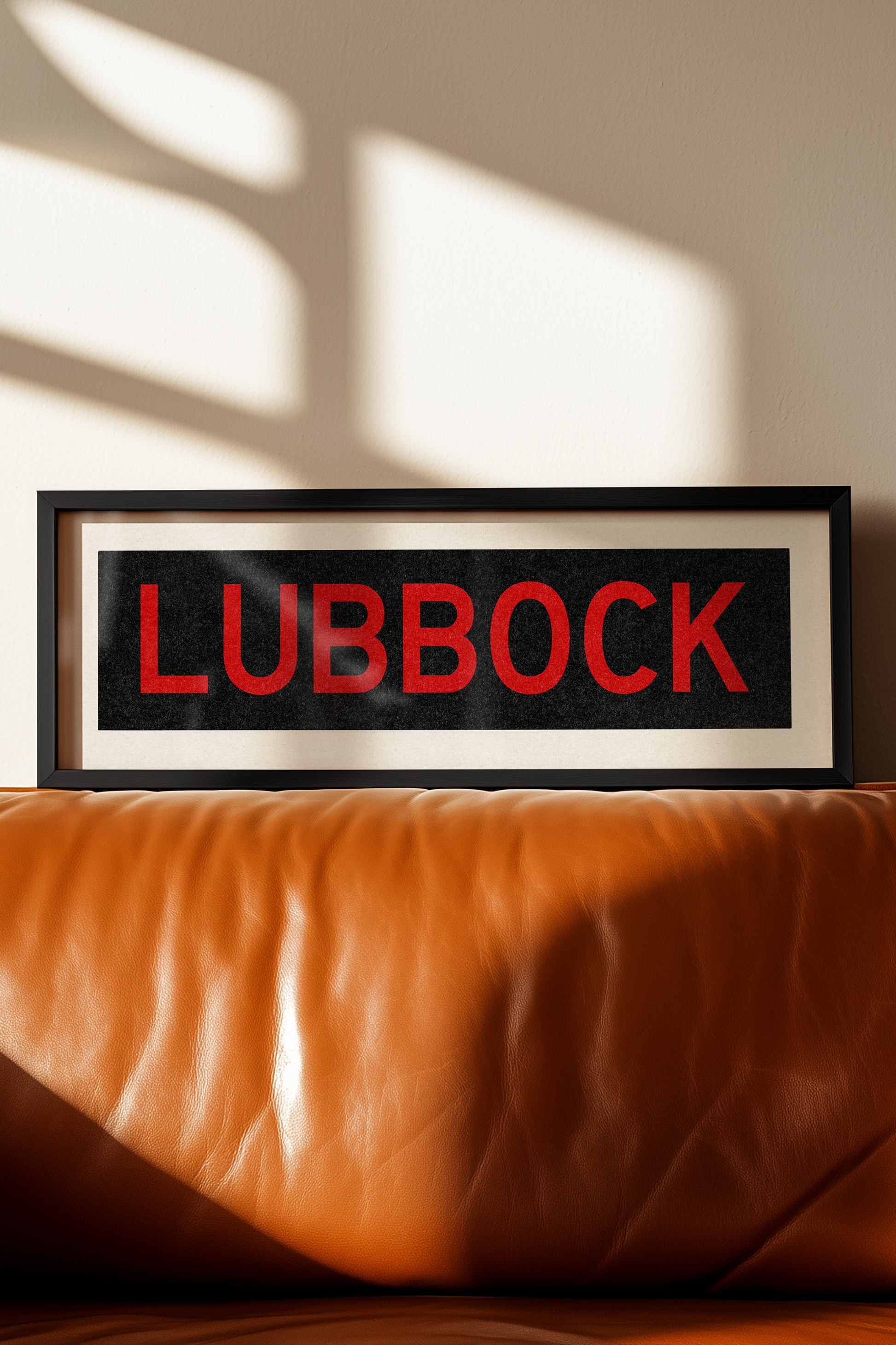 Framed red and black "LUBBOCK" vintage bus/train scroll sign art. Show off your love for Lubbock, Texas with this classic and simple framed scroll sign. Perfect for above the door, in an office, game room or accent in a living area.