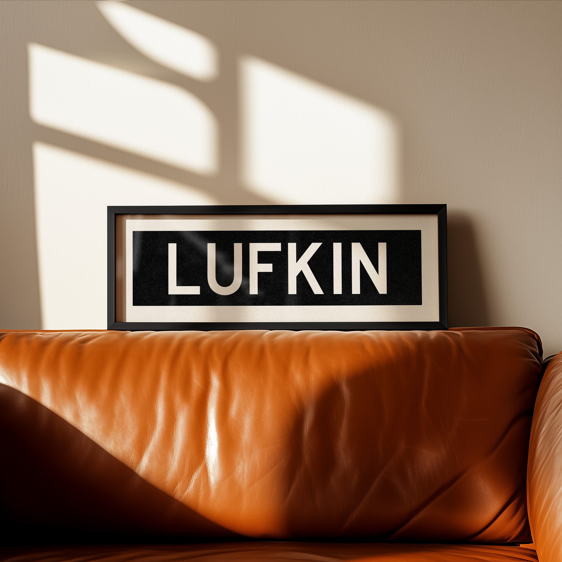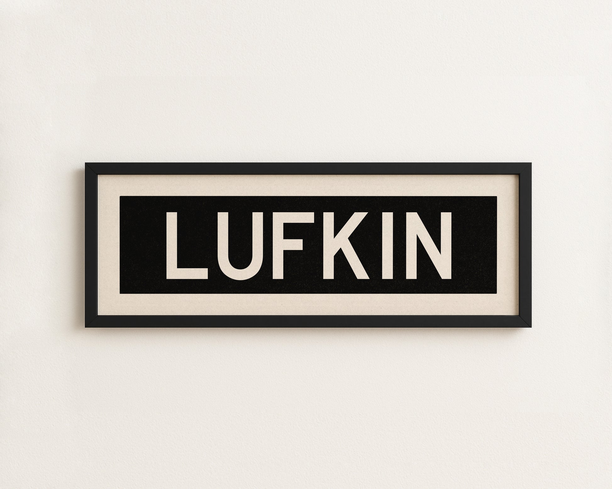 Framed "LUFKIN" vintage bus/train scroll sign art. Show off your love for Lufkin, Texas with this classic and simple framed scroll sign. Perfect for above the door, in an office, game room or accent in a living area.