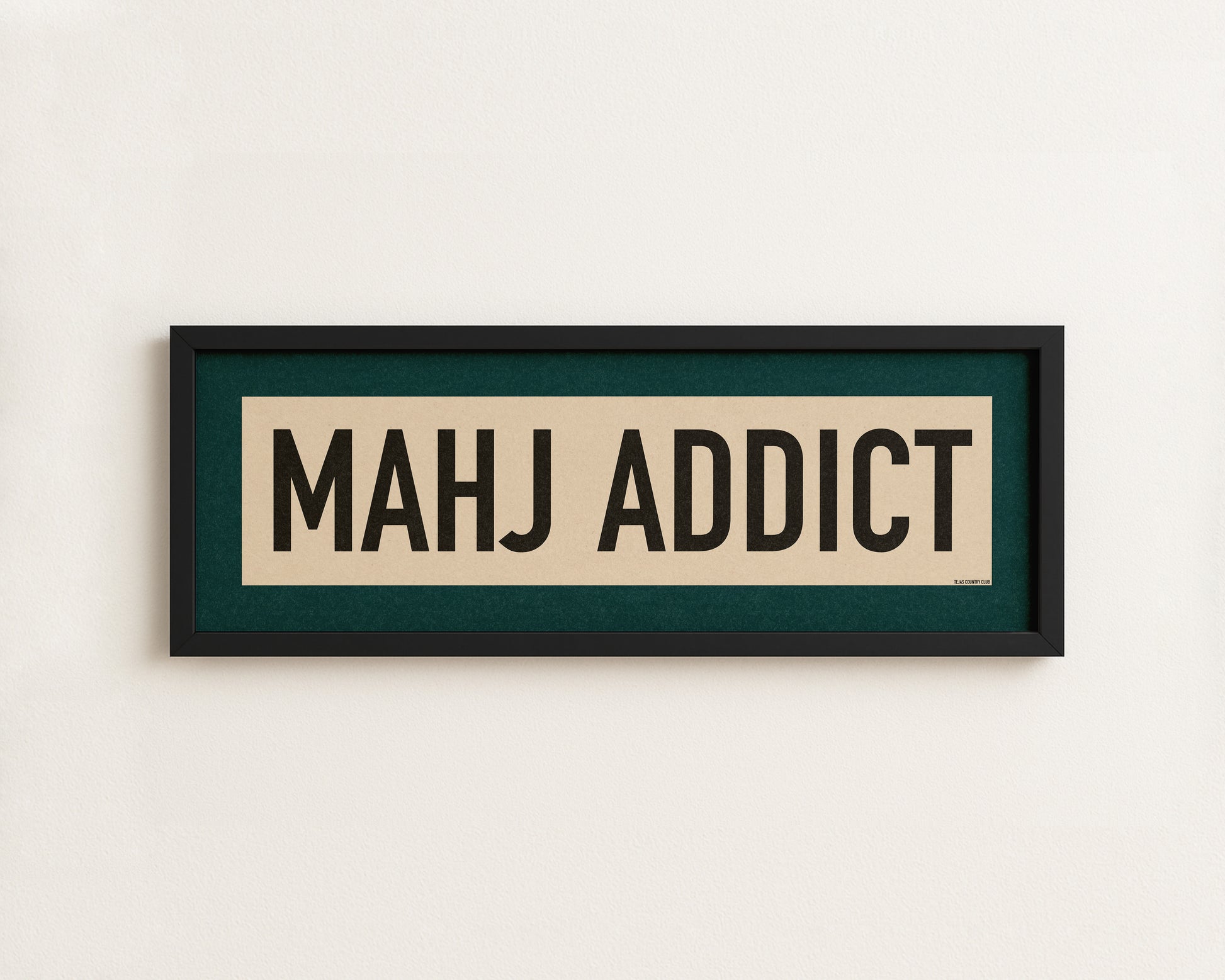 Framed teal and off white "MAHJ ADDICT" vintage scroll sign art. Show off your love for your Mahjong addiction. When you just can't stop playing! Liven up that wall with this classic and simple framed scroll sign. for above the door, in an office, game room or accent in a living area.