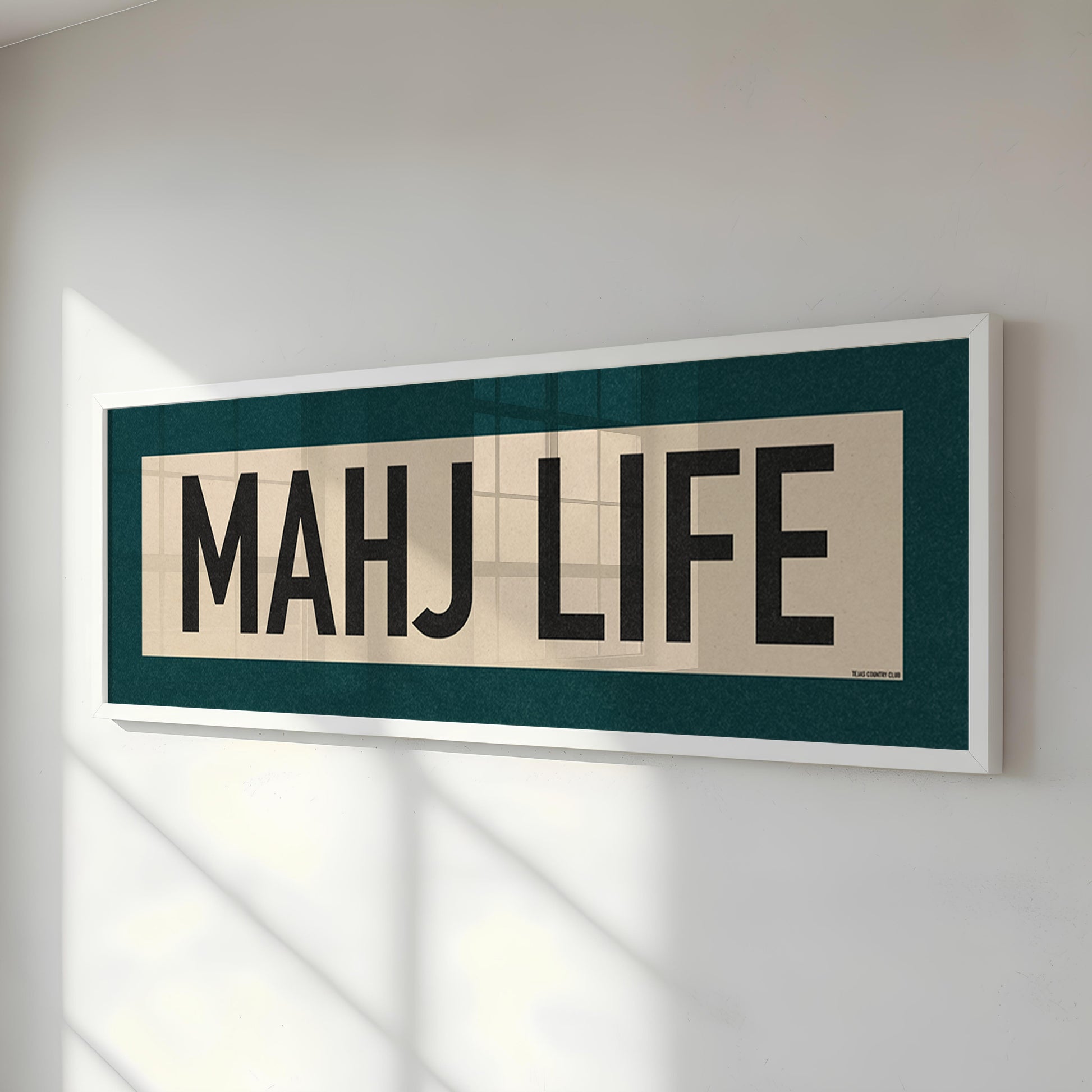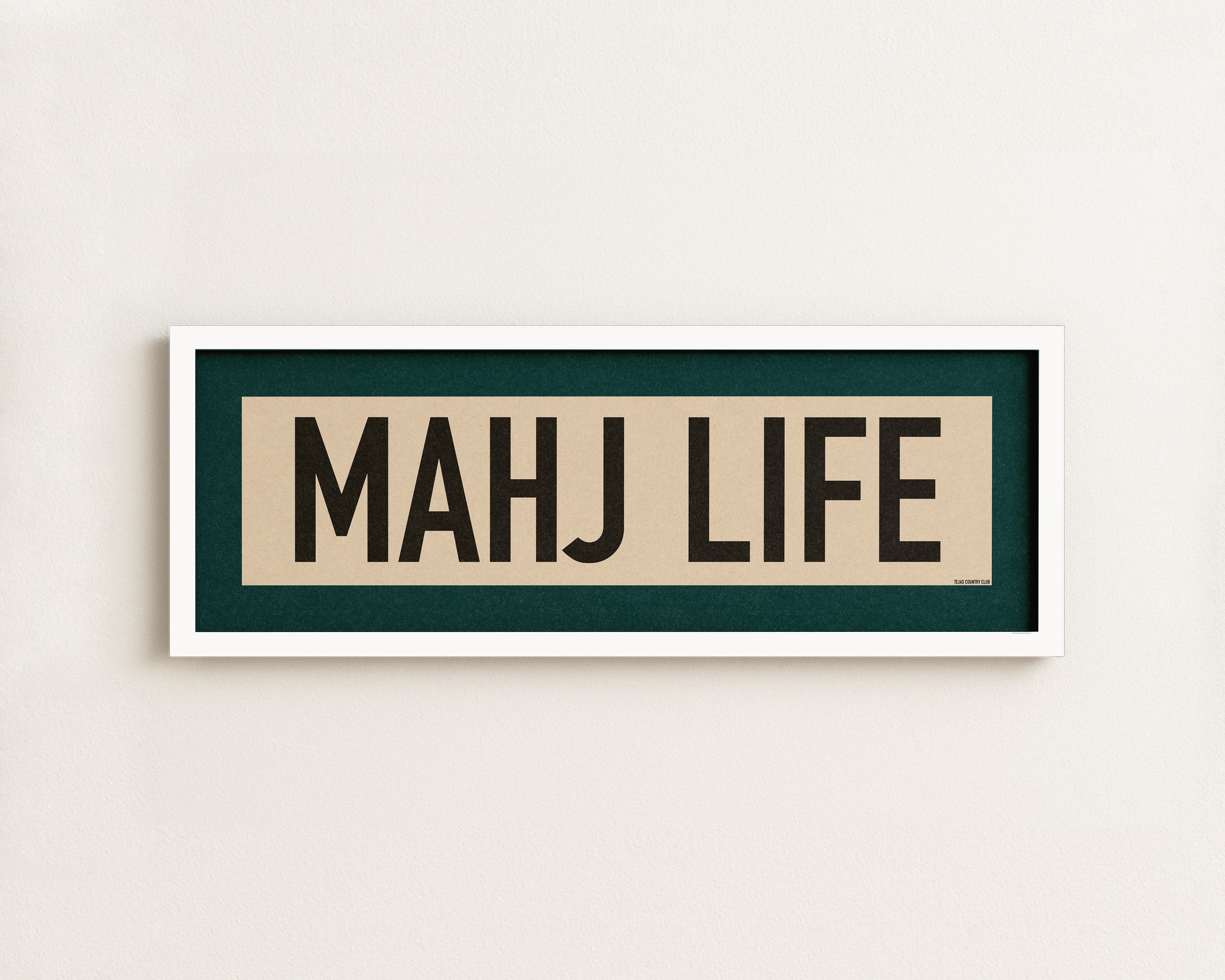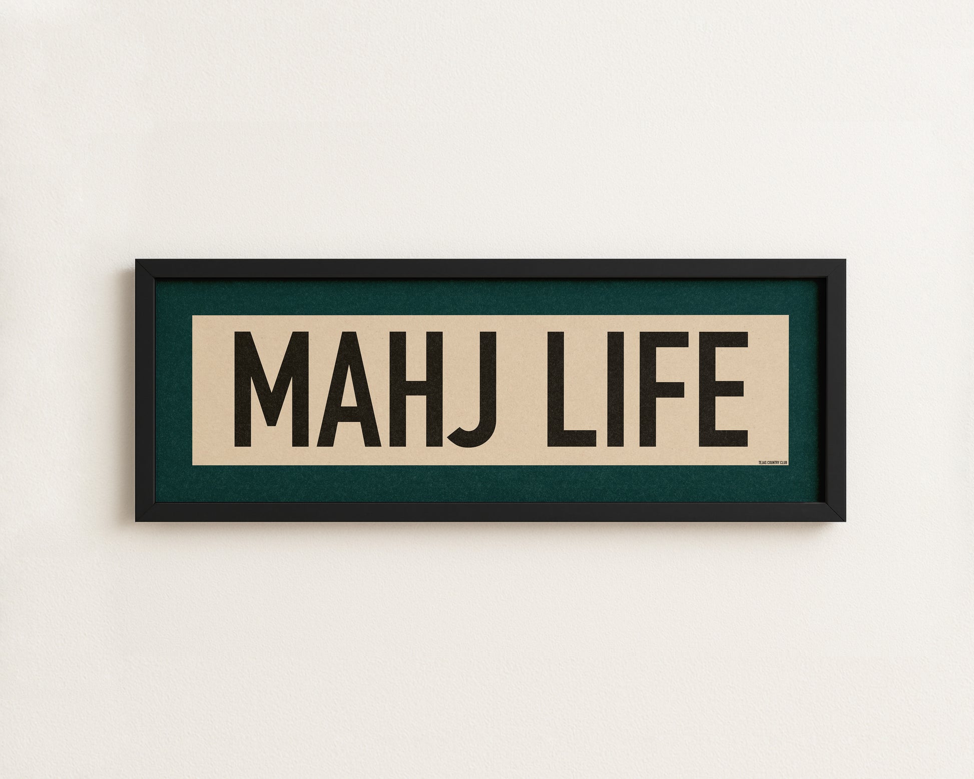 Framed teal and off white "MAHJ LIFE" vintage scroll sign art. Show off your love for living the dream while living that Mahjong Life. Liven up that wall with this classic and simple framed scroll sign. for above the door, in an office, game room or accent in a living area.