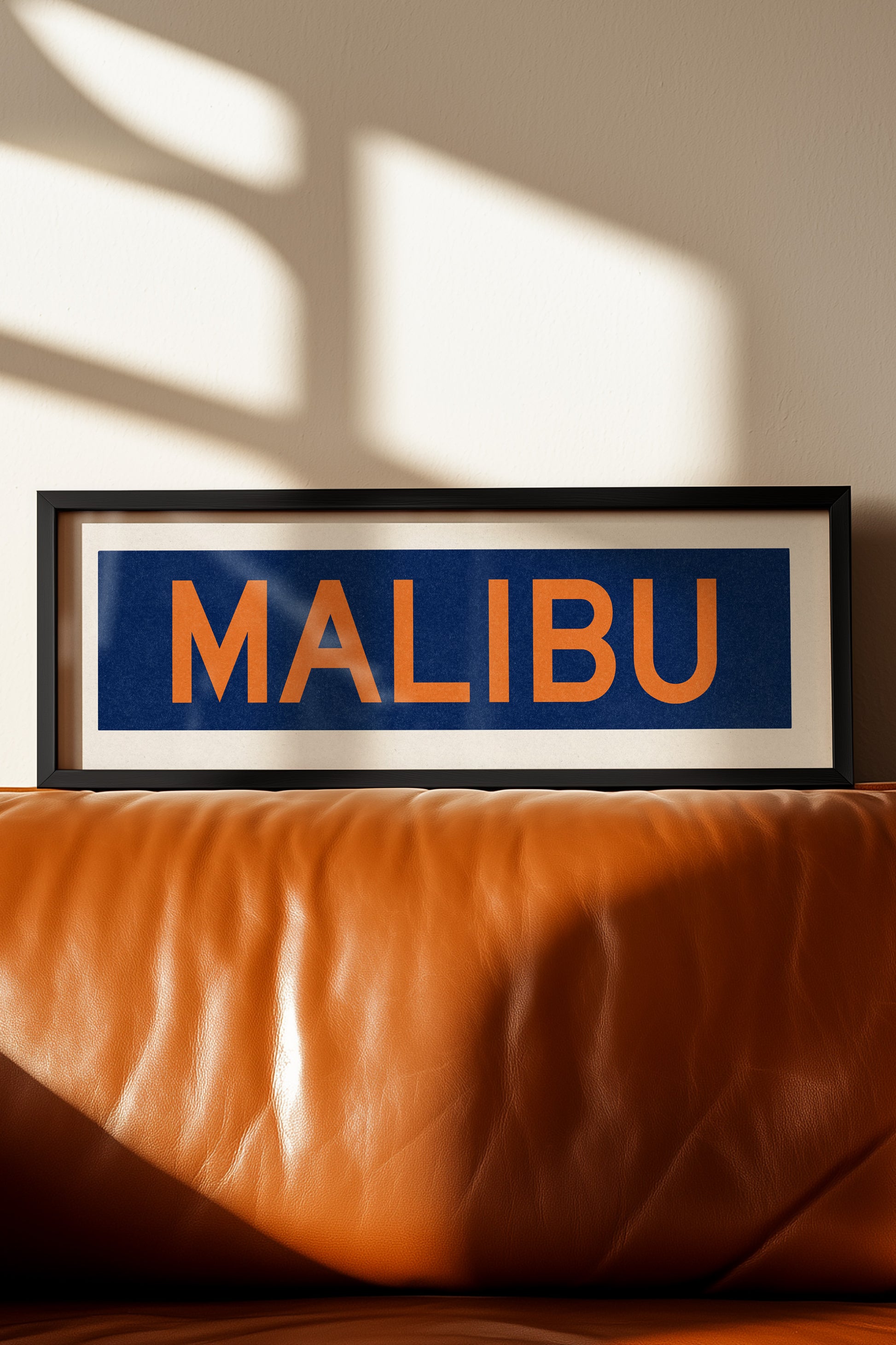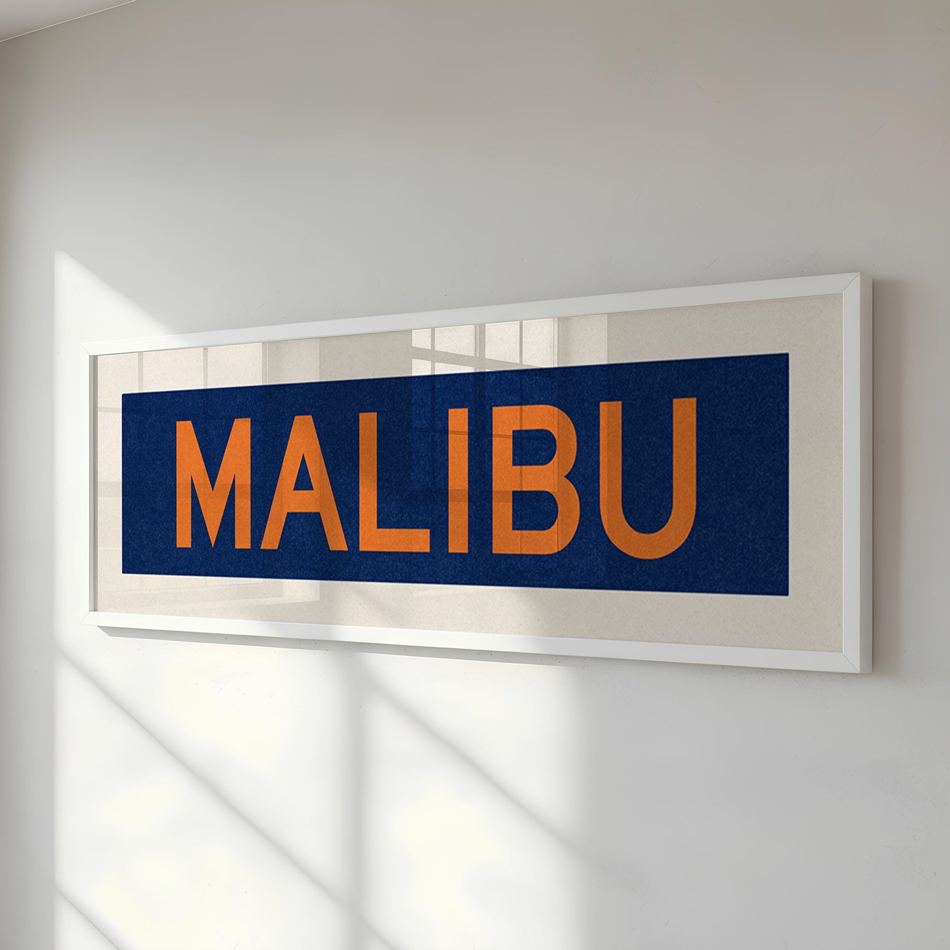 Framed blue and orange "MALIBU" vintage bus/train scroll sign art. Show off your love for Malibu, California with this classic and simple framed scroll sign. Perfect for above the door, in an office, game room or accent in a living area.