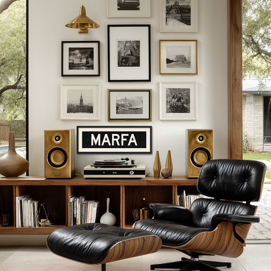 Framed "MARFA" vintage bus/train scroll sign art. Show off your love for Marfa with this classic and simple framed scroll sign. Perfect for above the door, in an office, game room or accent in a living area.