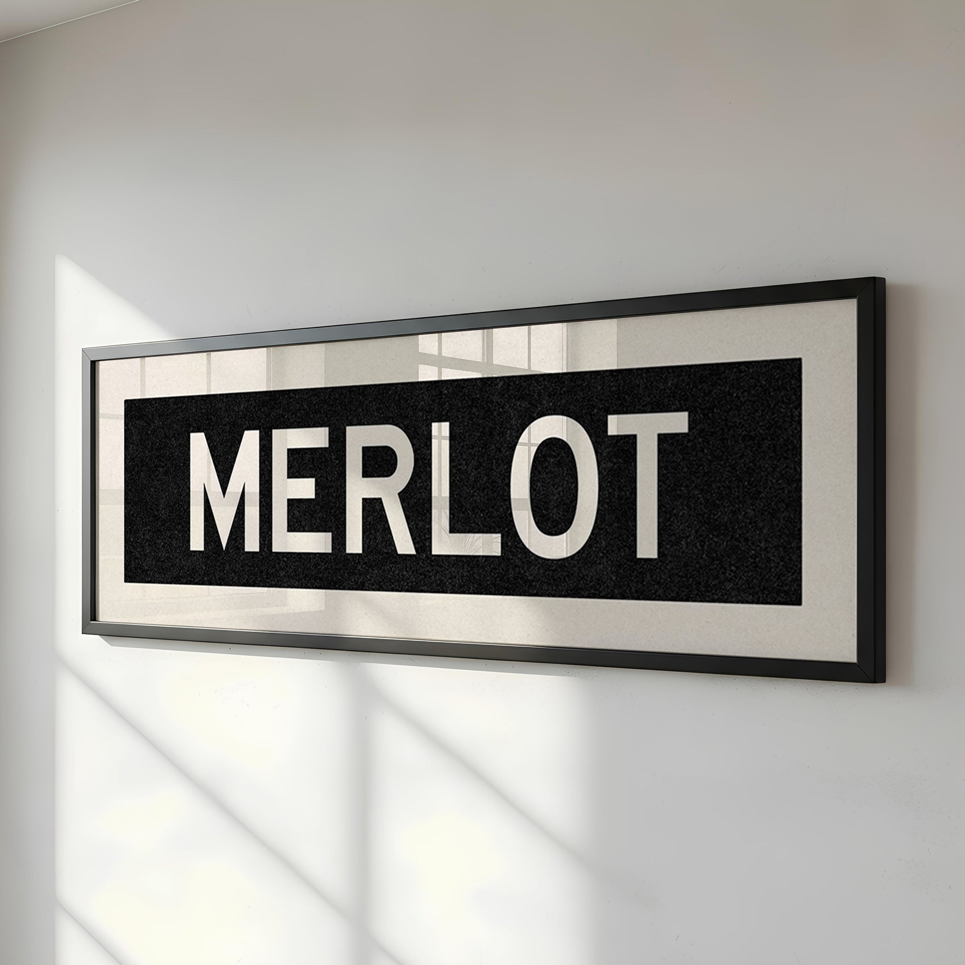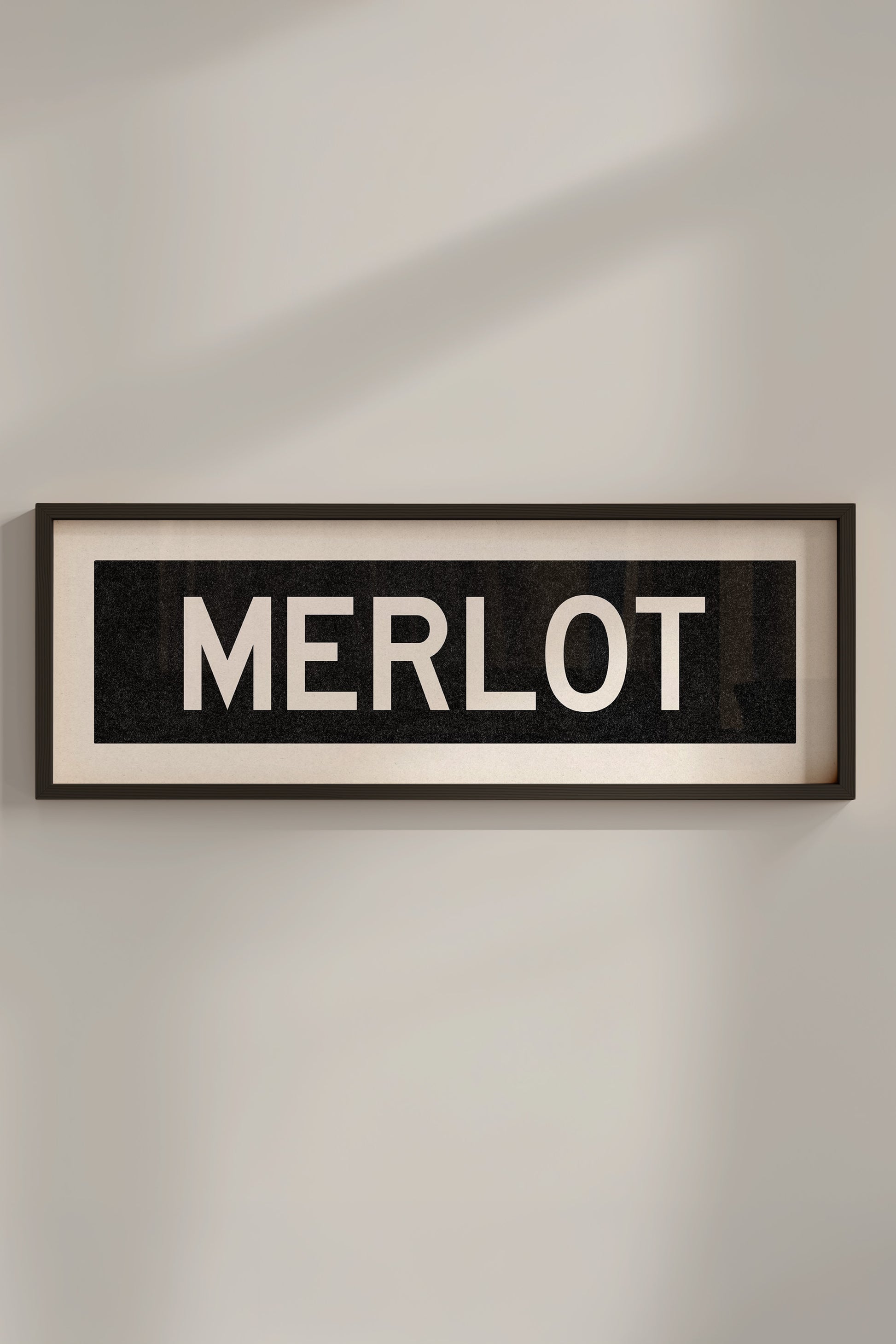 Framed "MERLOT" vintage bus/train scroll sign art. Show off your love for that little glass of red wine with this classic and simple framed scroll sign. Perfect for above the door, in an office, above the bar, game room or accent in the kitchen.