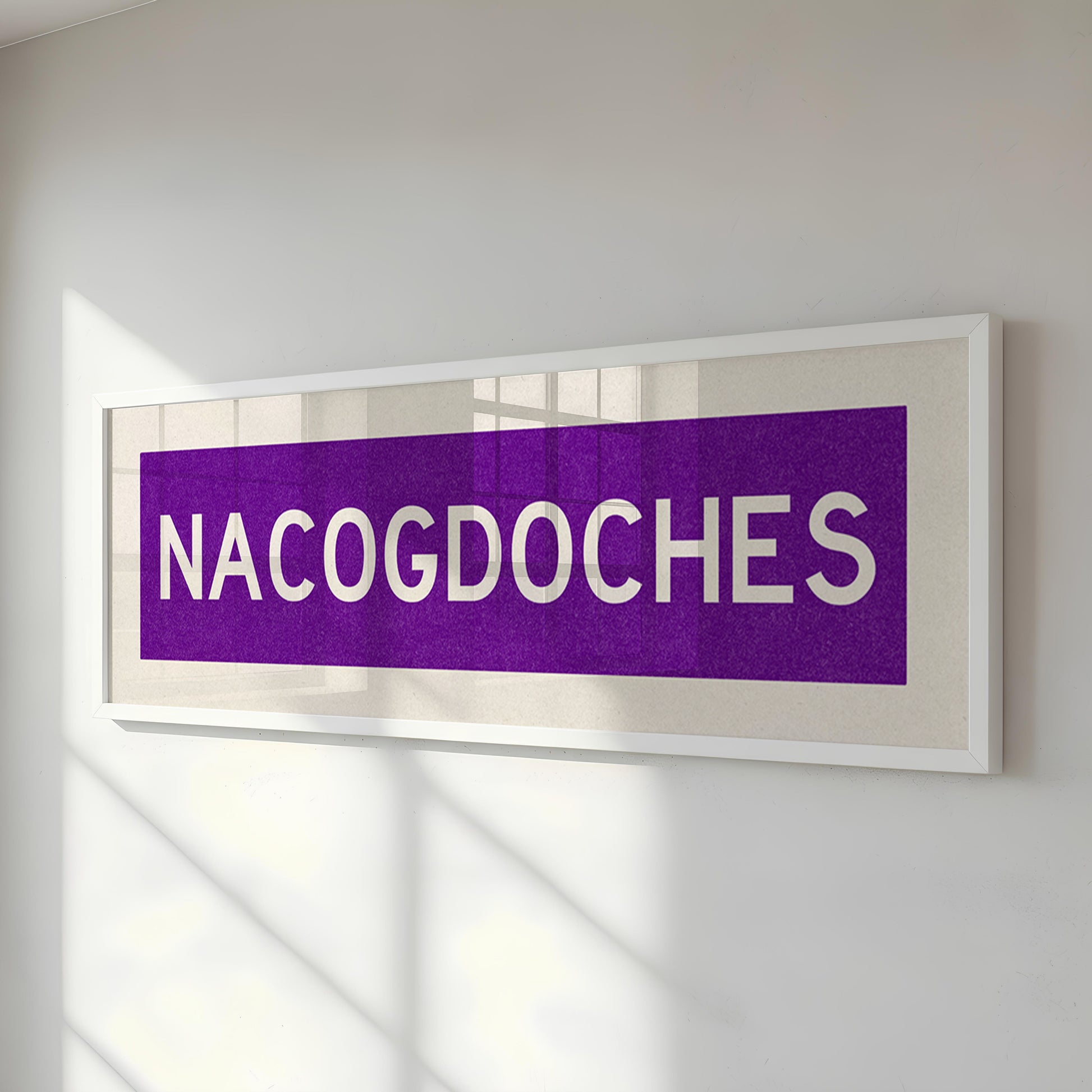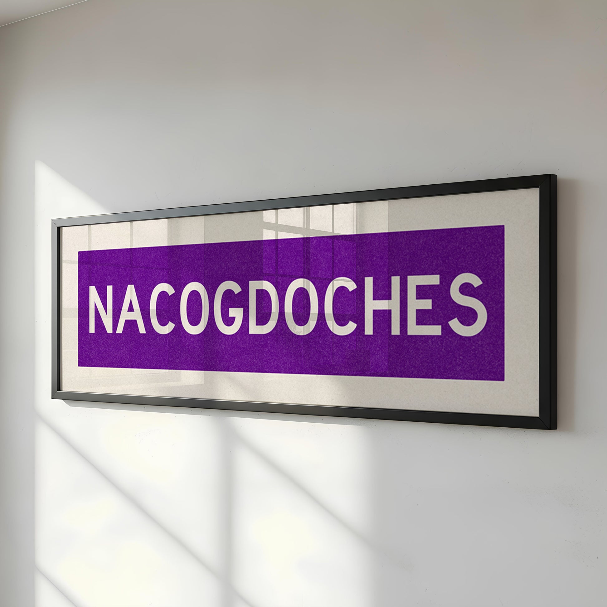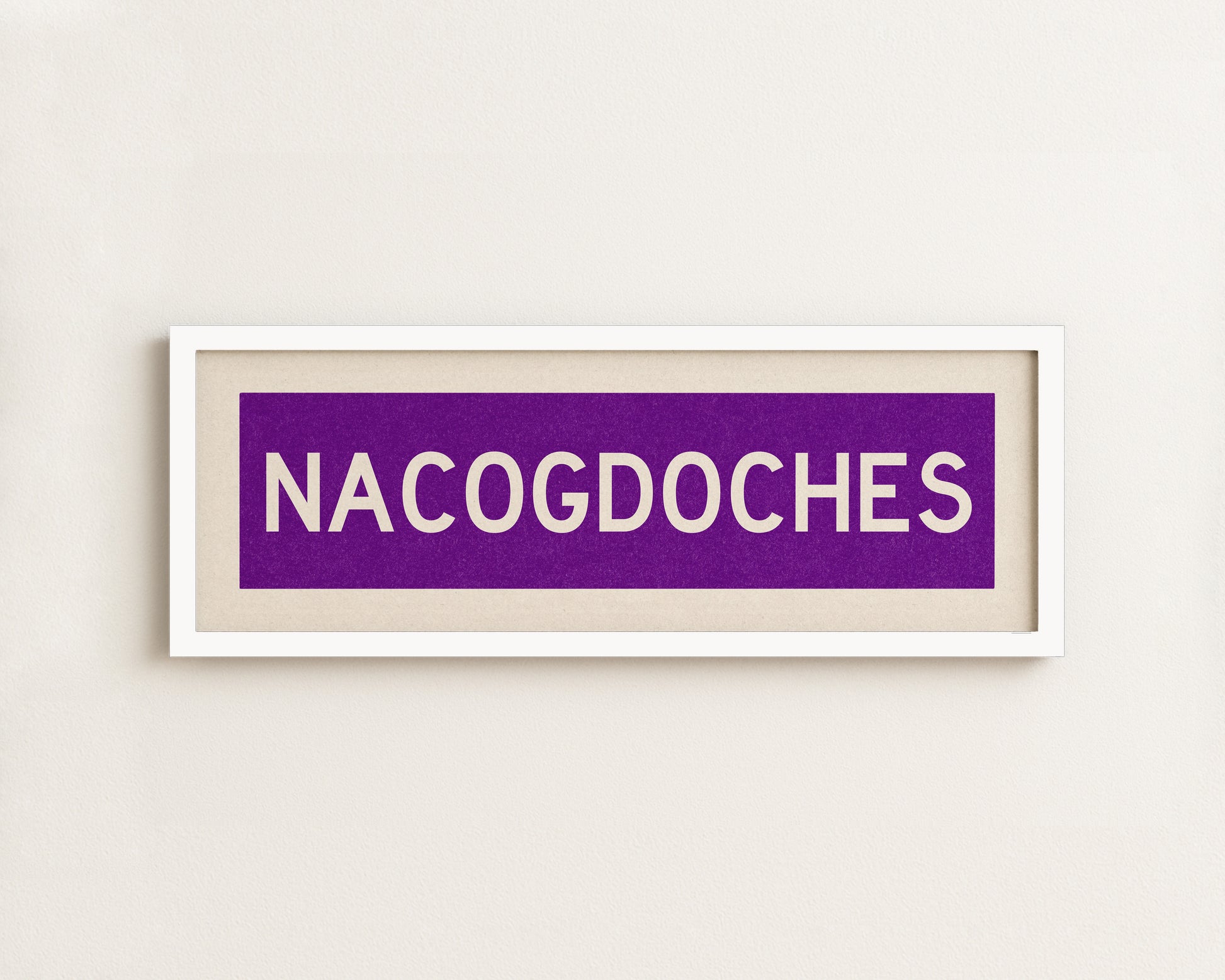 Framed purple and white "NACOGDOCHES" vintage bus/train scroll sign art. Show off your love for Nacogdoches, Texas with this classic and simple framed scroll sign. Perfect for above the door, in an office, game room or accent in a living area.