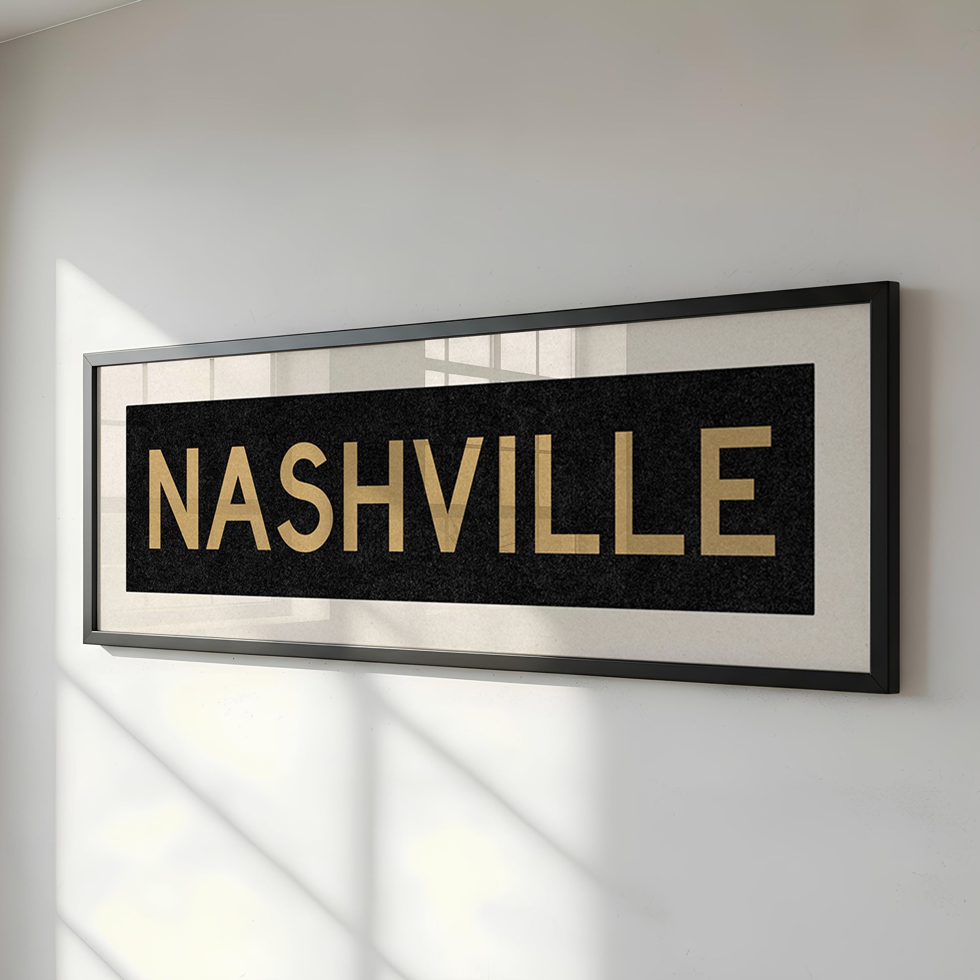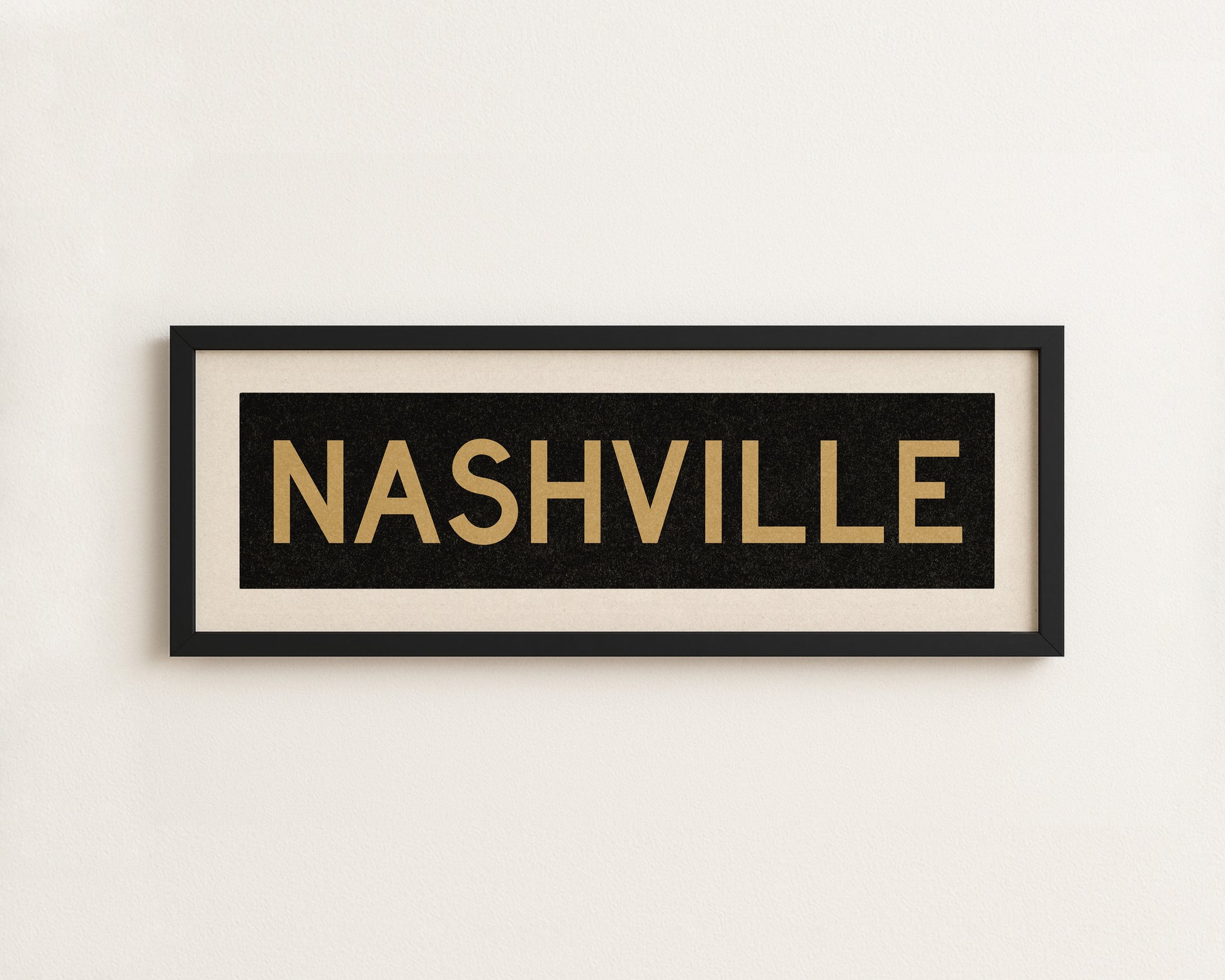 Framed gold and black "NASHVILLE" vintage bus/train scroll sign art. Show off your love for Nashville with this classic and simple framed scroll sign. Perfect for above the door, in an office, game room or accent in a living area.