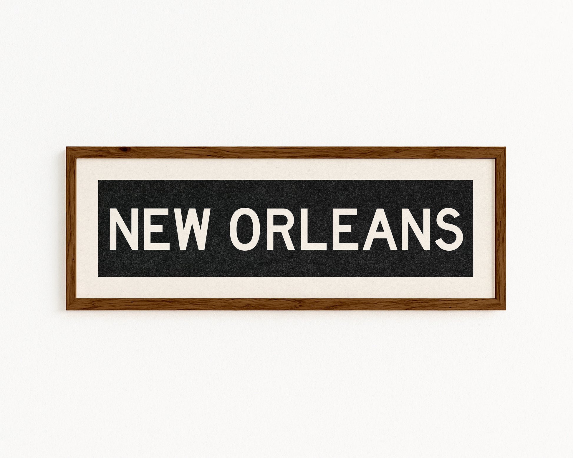 Framed black and white "NEW ORLEANS" vintage bus/train scroll sign art. Show off your love for New Orleans, Louisiana with this classic and simple framed scroll sign. Great gift for the native or the newcomer. Perfect for above the door, in an office, game room or accent in a living area.