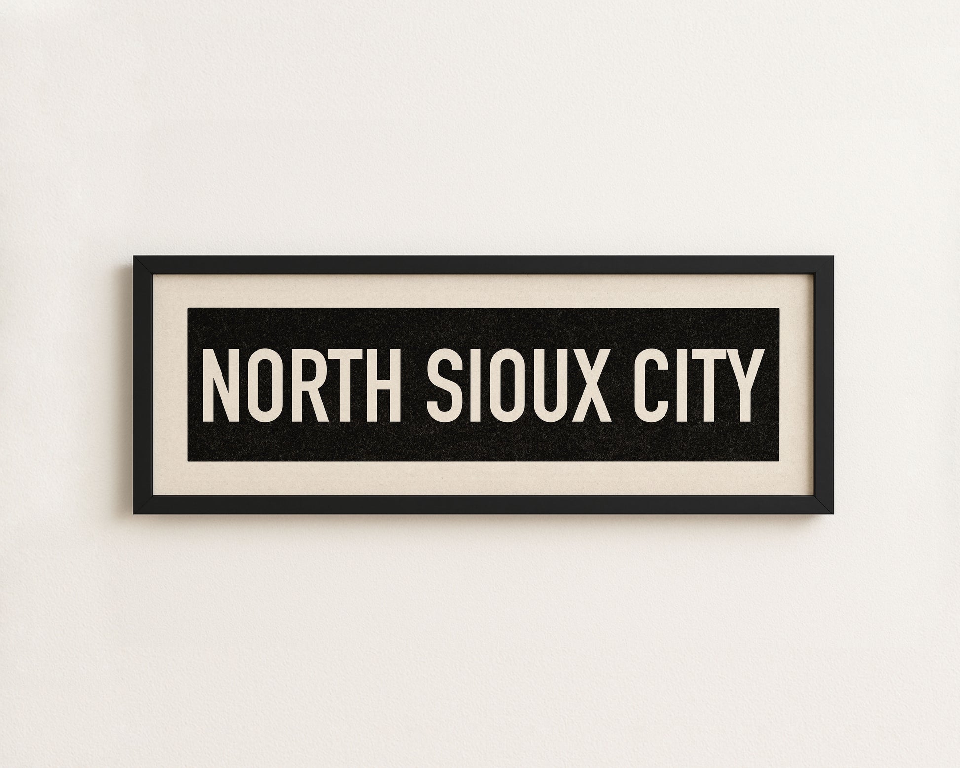 Framed "NORTH SIOUX CITY" vintage bus/train scroll sign art. Show off your love for Houston with this classic and simple framed scroll sign. Perfect for above the door, in an office, game room or accent in a living area.