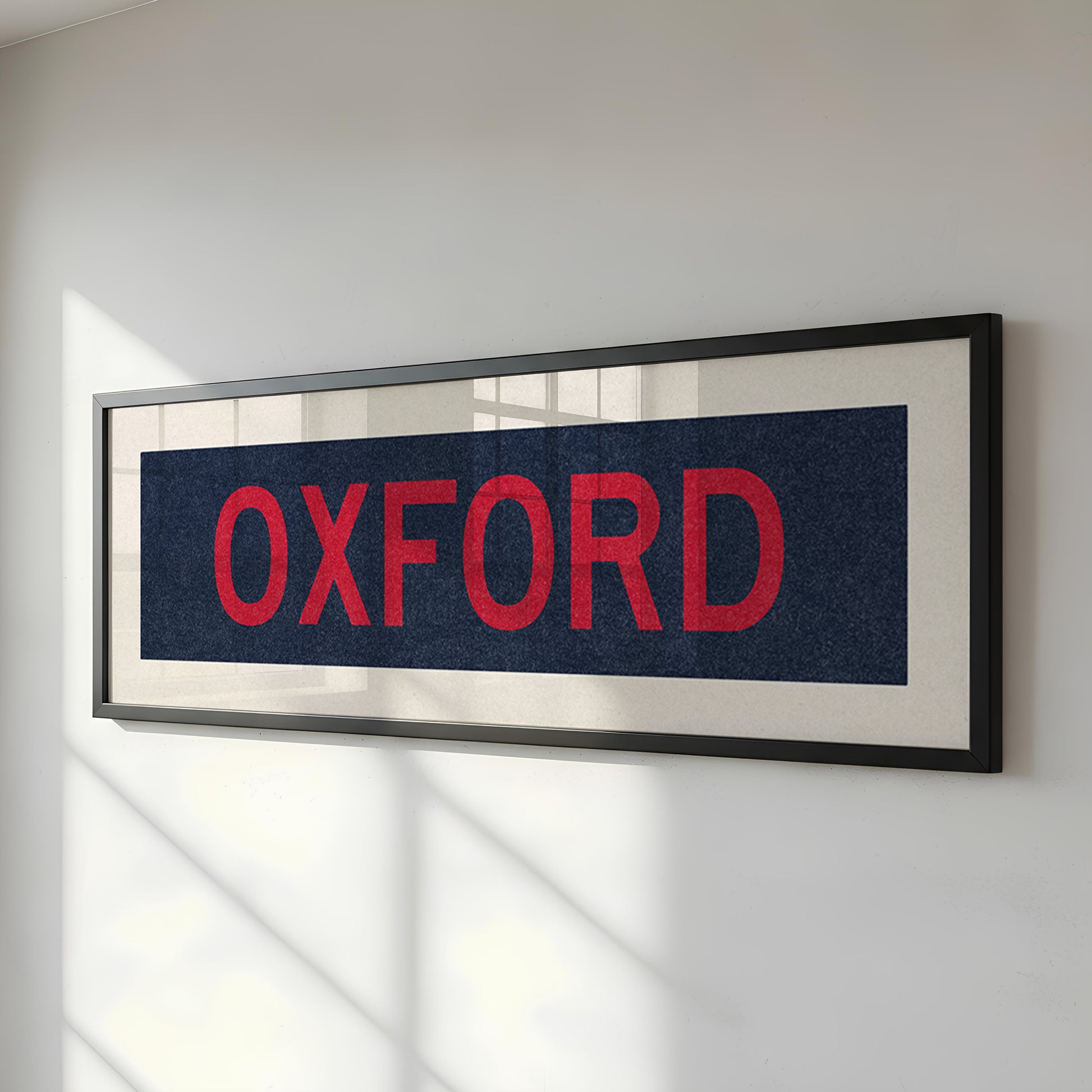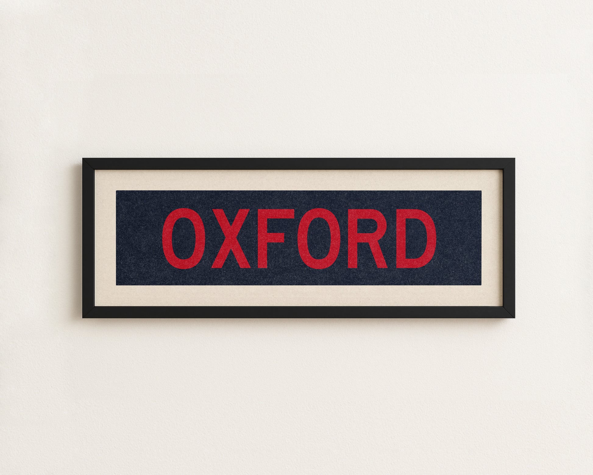 Framed red and navy "OXFORD" vintage bus/train scroll sign art. Show off your love for Oxford with this classic and simple framed scroll sign. Perfect for above the door, in an office, game room or accent in a living area.